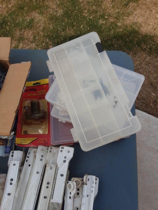 lot 201 - Workbelt, chains, drawer slides, parts storage bins, battery cut-off switch,  parts, etc. as shown