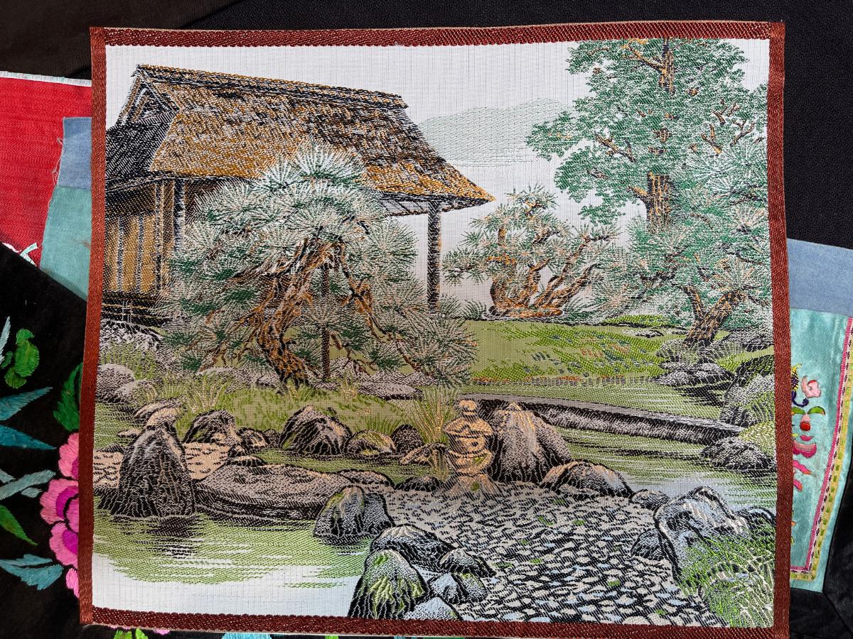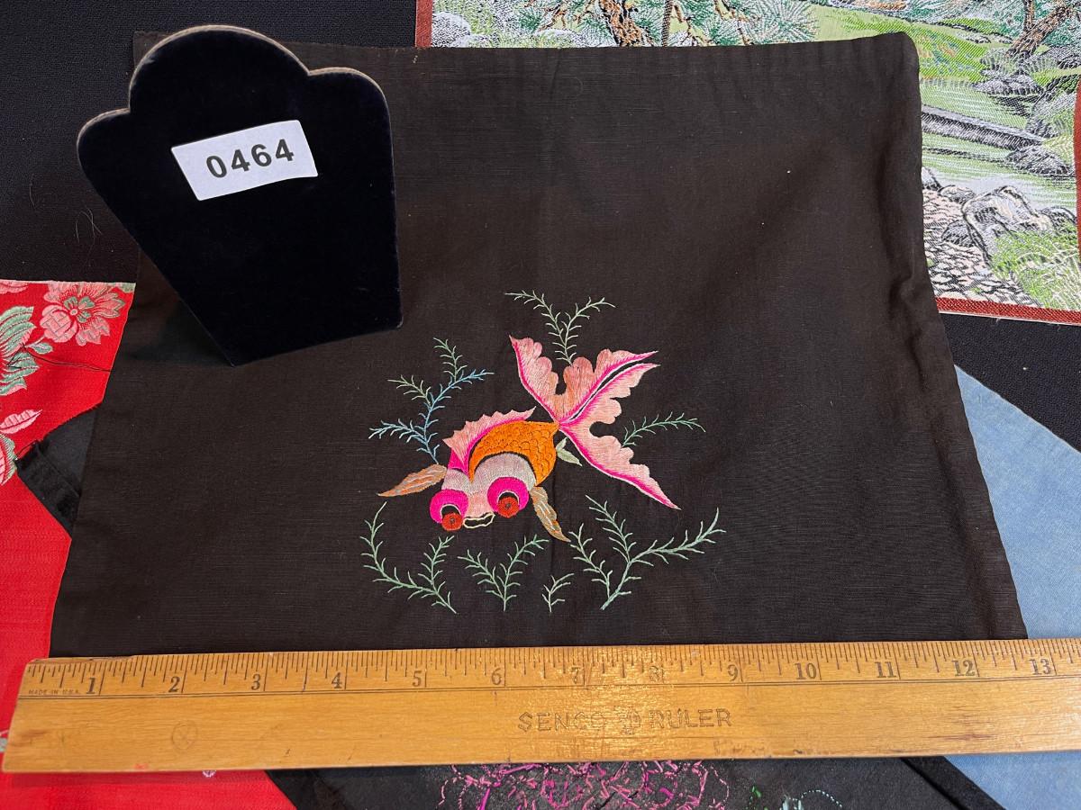 DESCRIPTION: This varied lot is made up of 5 colorful silk panels and a small square pillow case. The panels feature floral patterns including large chrysanthemums, A floral spray with a butterfly, a machine-stitched scenic panel, and one small now with auspicious calligraphy. The pillow case in detailed with a colorful goldfish.