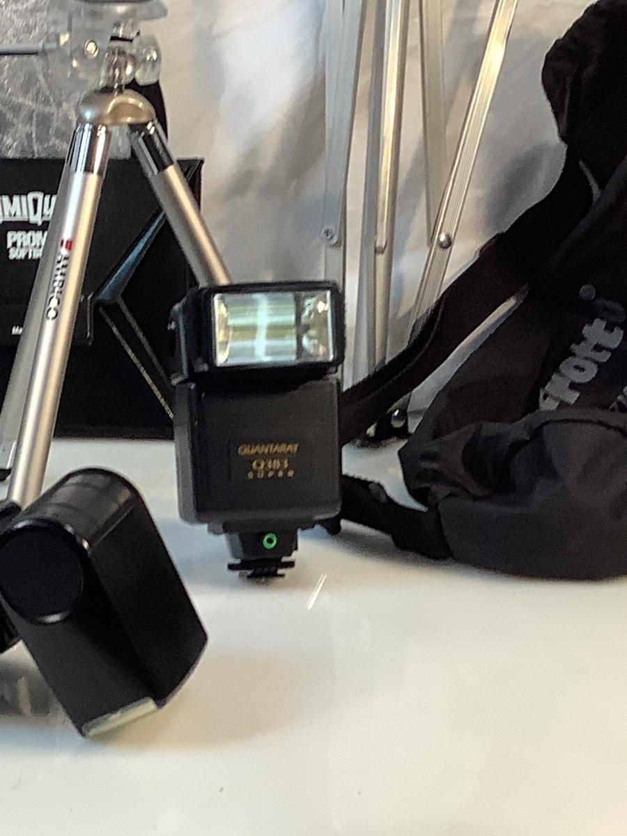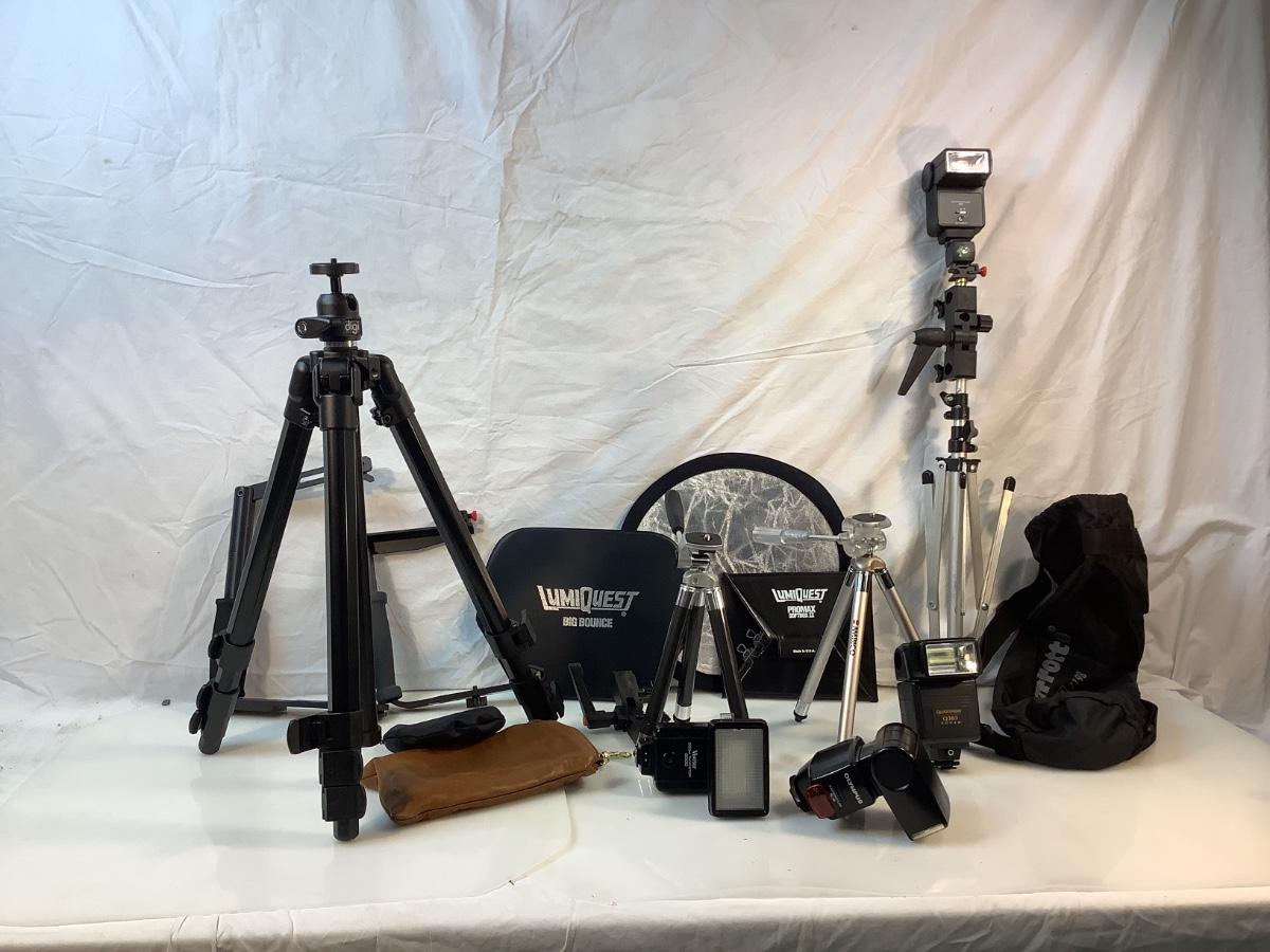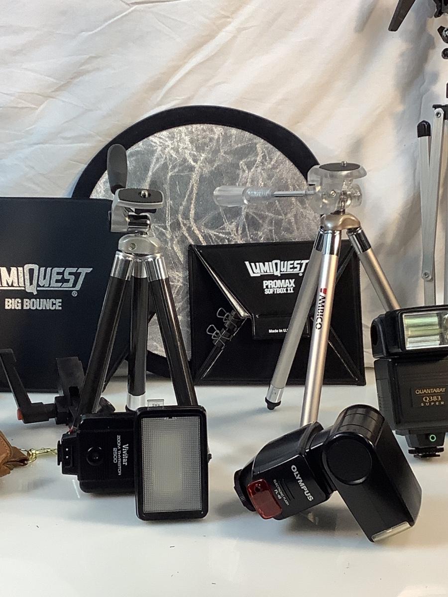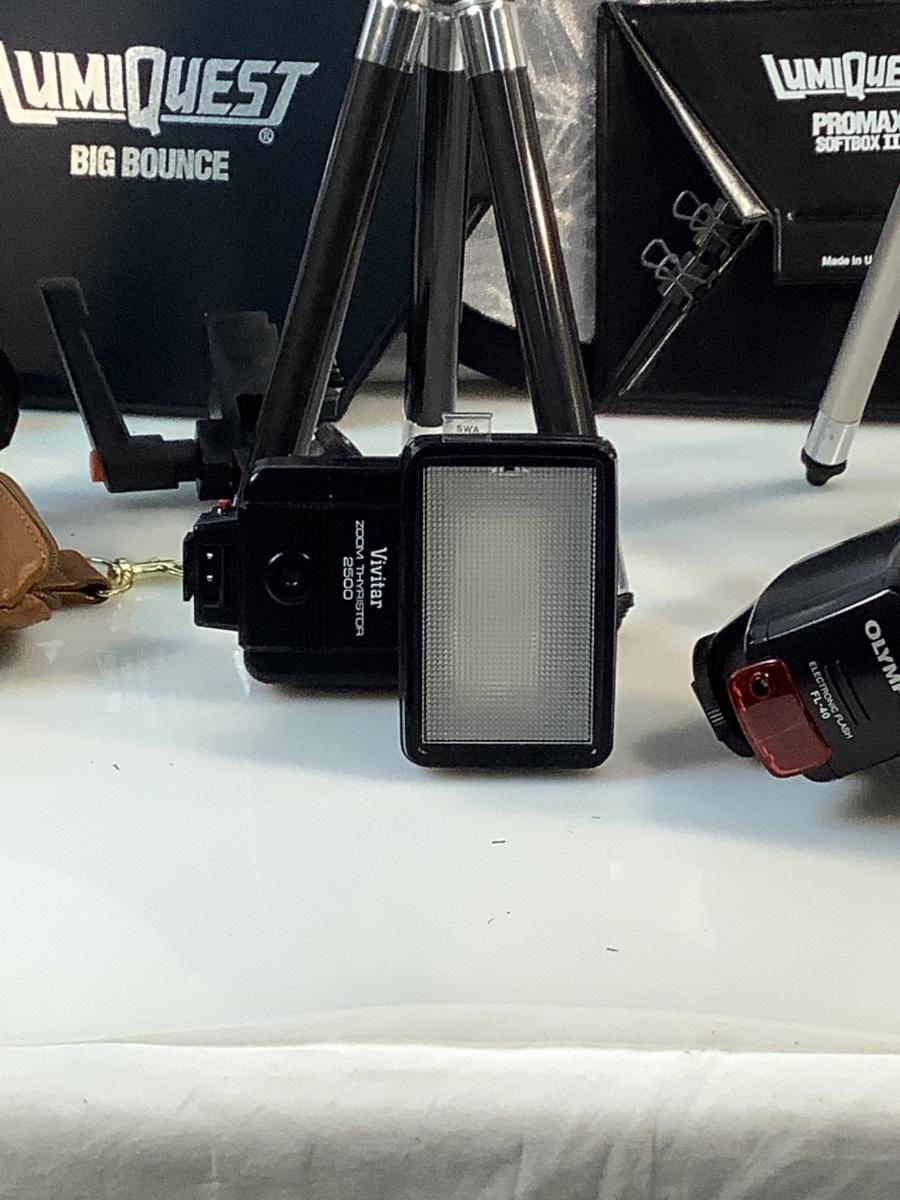Comes with 4 camera/photography equipment stands, One Vivitar Zoom Thyristor 2500, One Olympus Electronic Flash FL-40, One Quanta Ray Q383 Super, and One Electronic Flash 2800. Also included two mobile camera/photography stand grips. 2 Lumiquest Big bounce and Promax soft box II. And a collapsible reflective flash backdrop circle.