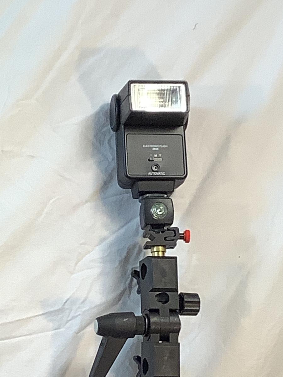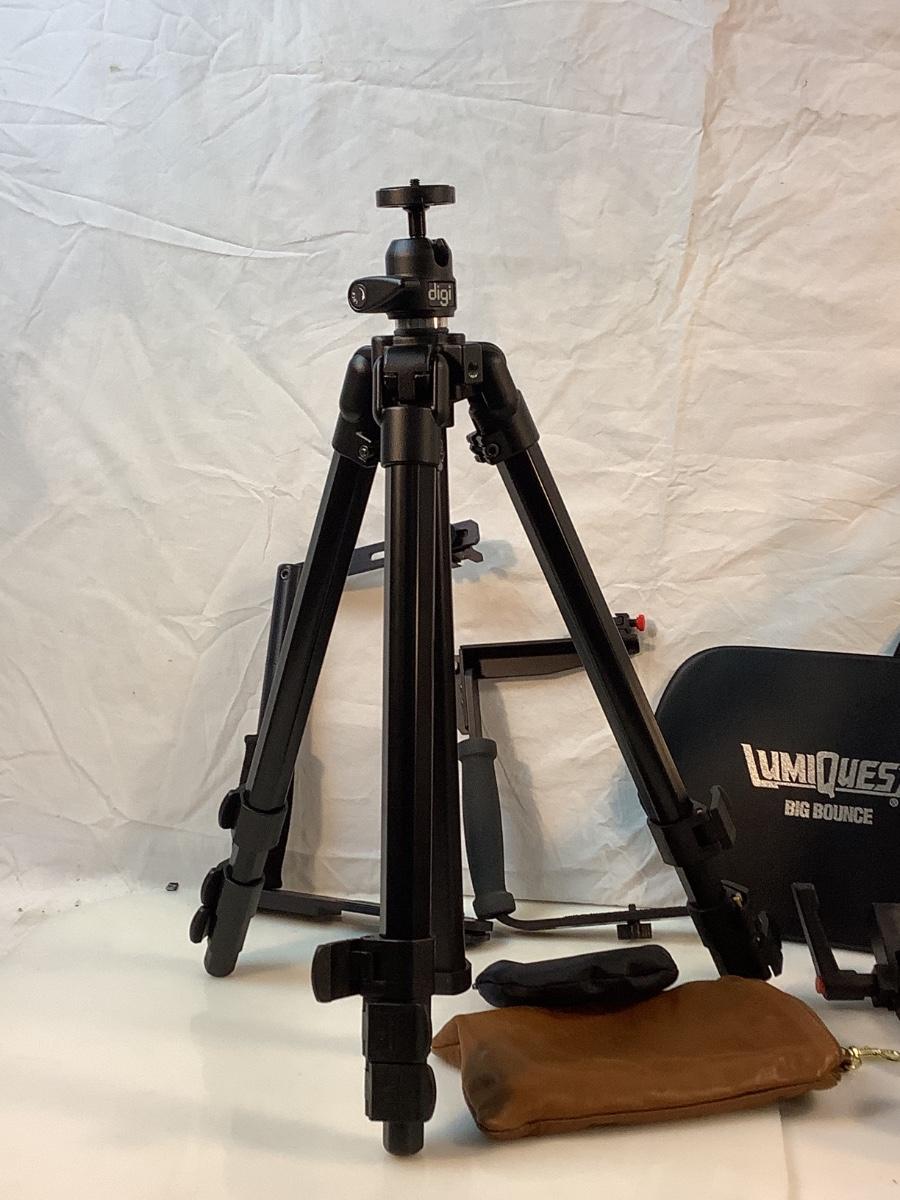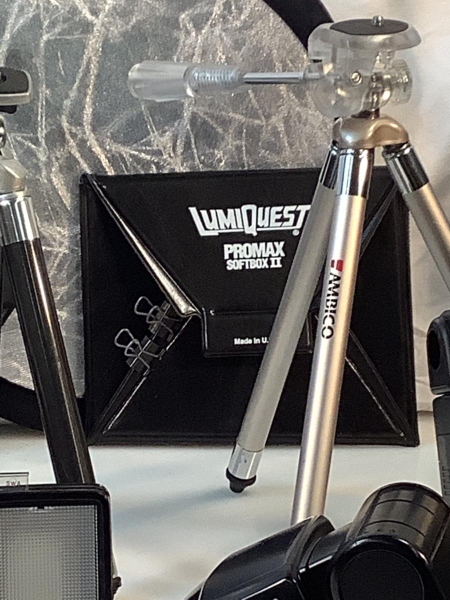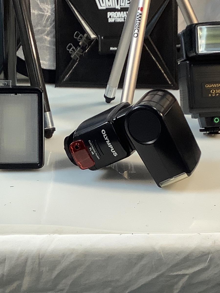 Comes with 4 camera/photography equipment stands, One Vivitar Zoom Thyristor 2500, One Olympus Electronic Flash FL-40, One Quanta Ray Q383 Super, and One Electronic Flash 2800. Also included two mobile camera/photography stand grips. 2 Lumiquest Big bounce and Promax soft box II. And a collapsible reflective flash backdrop circle.