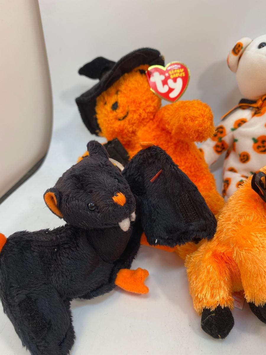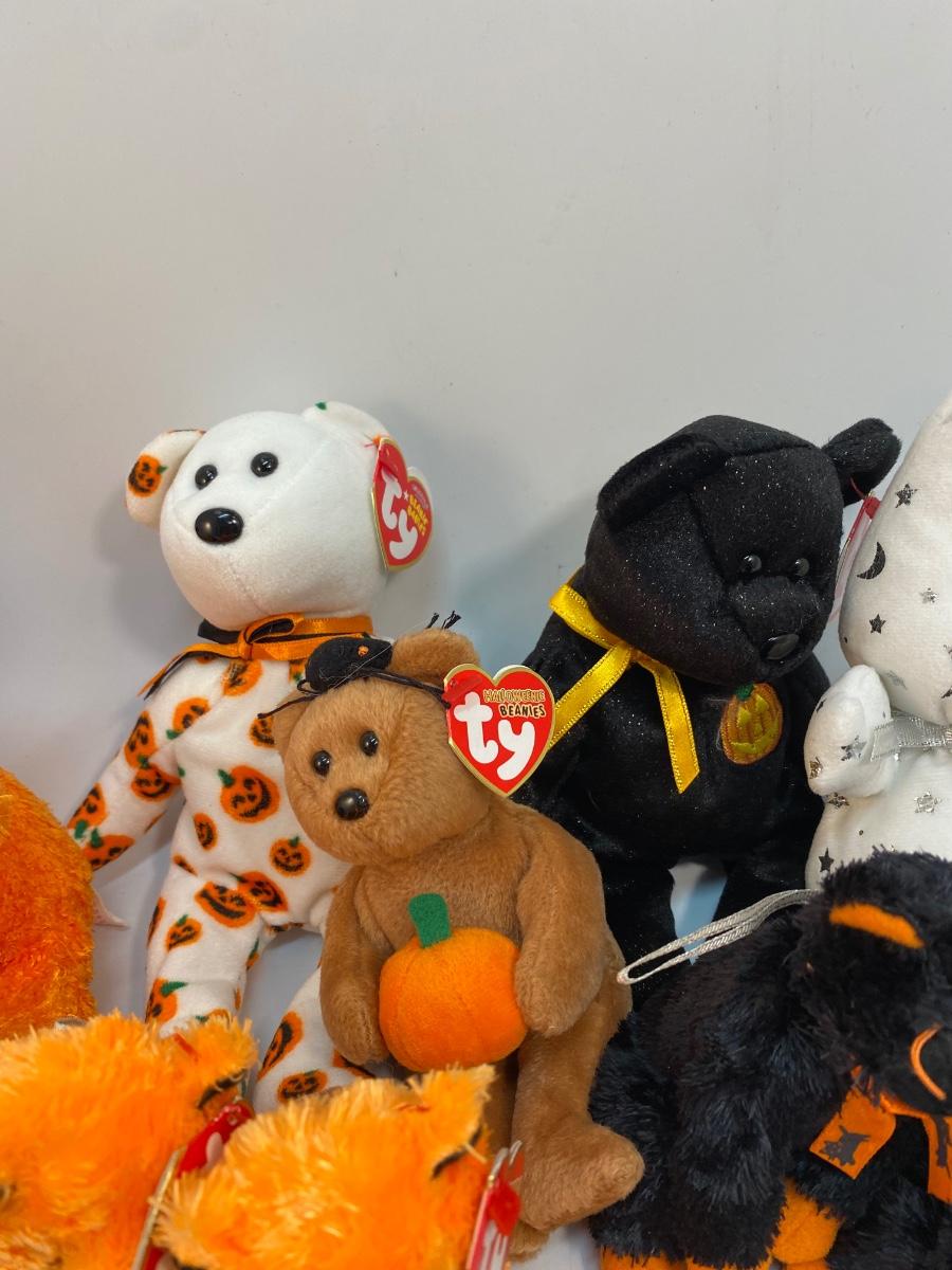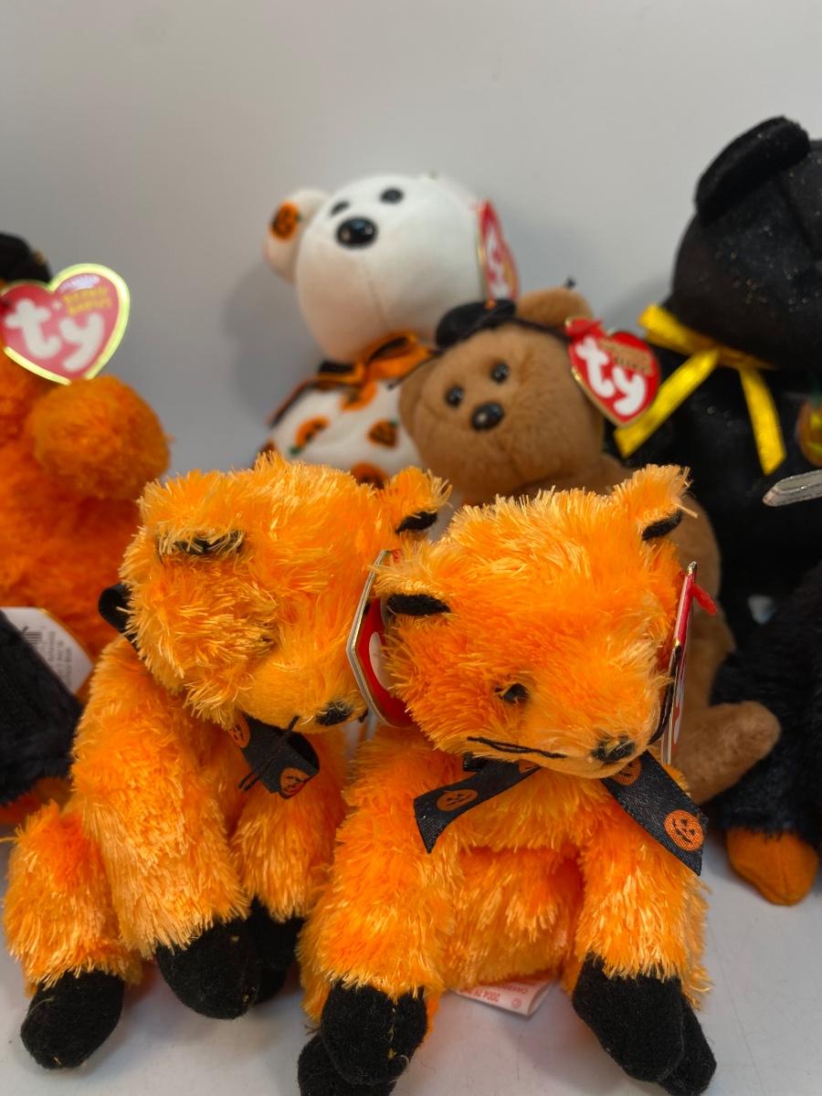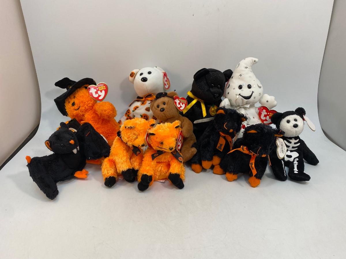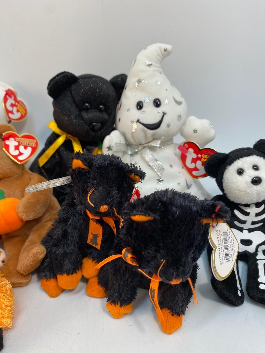 Assorted Lot of Halloween Themed TY Beanie Babies Plush Stuffed Animals. Different styles and sizes, some are smaller than the normal sized Beanies. All have hang tags.