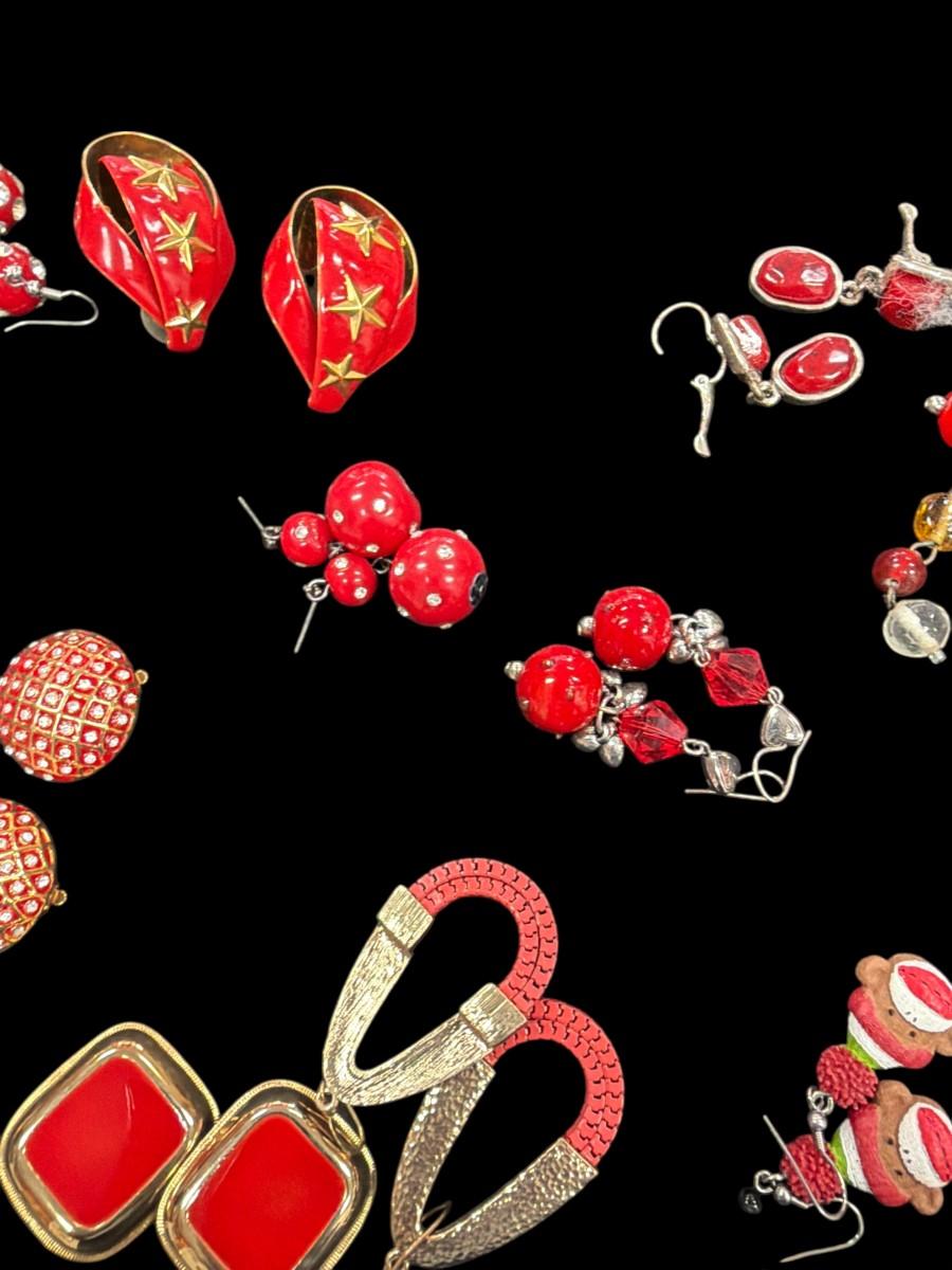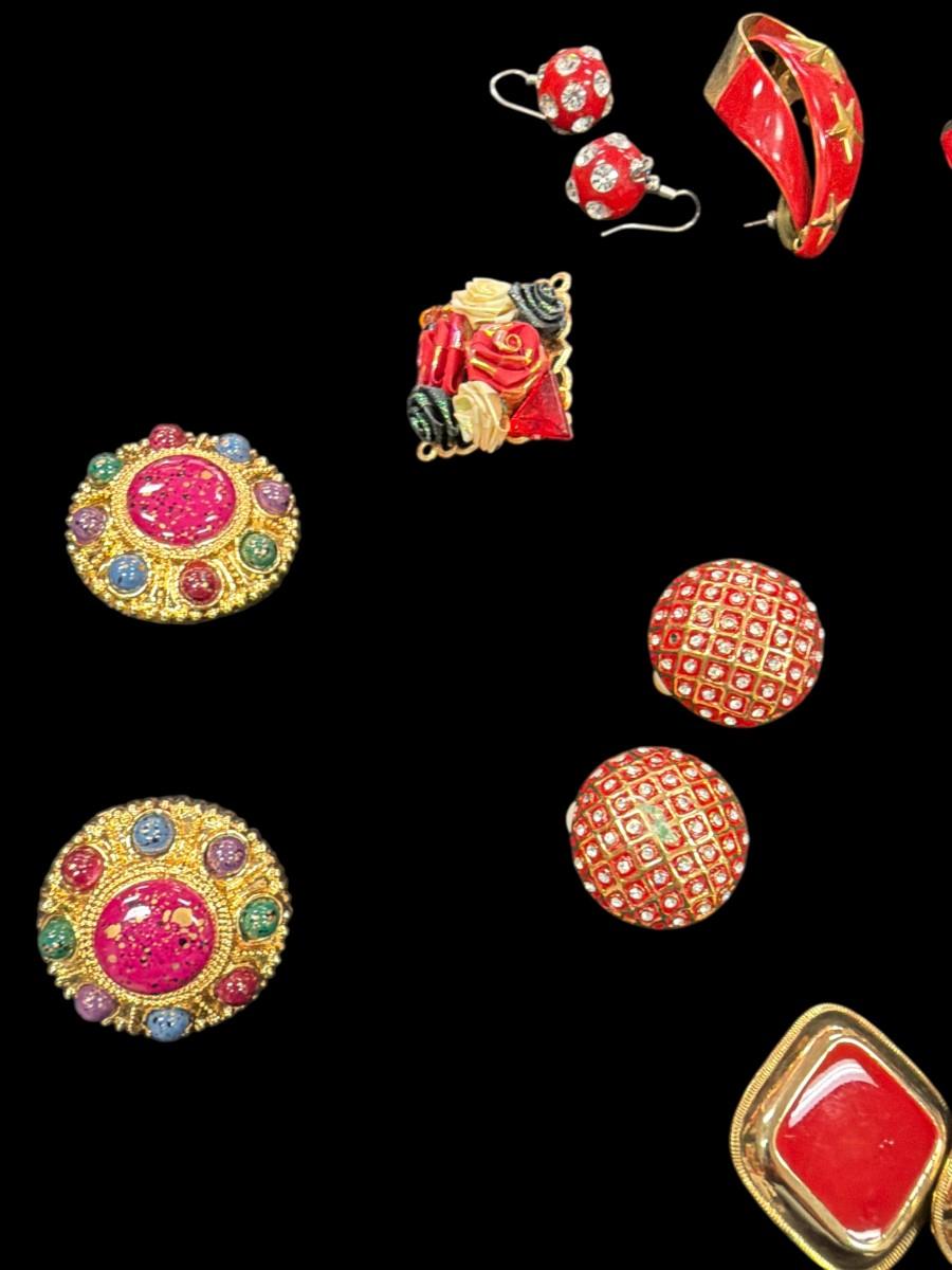Assorted Lot of Red and Gold Toned Costume Earrings and One Brooch
