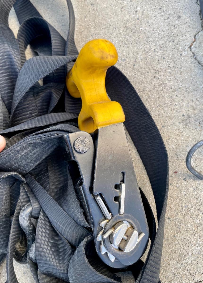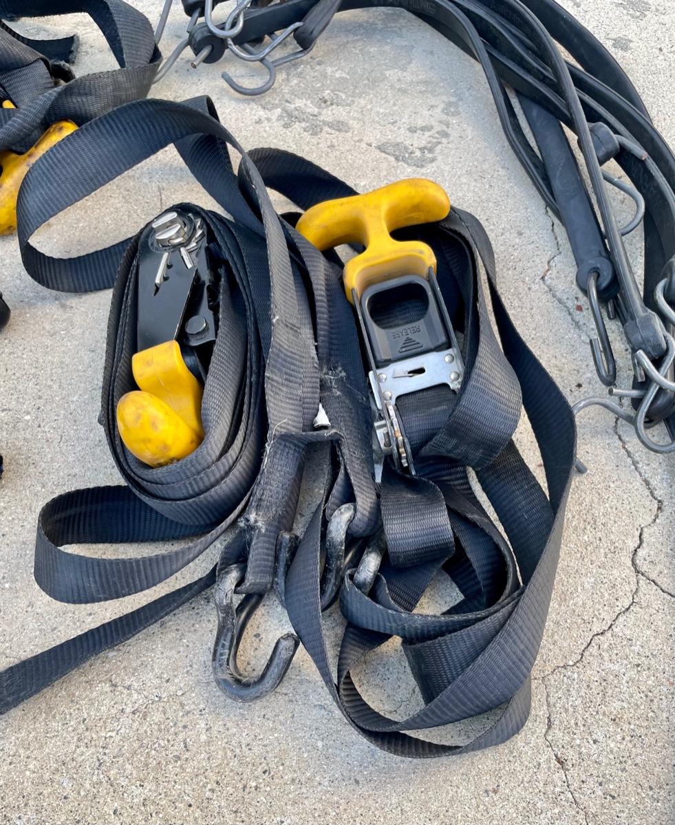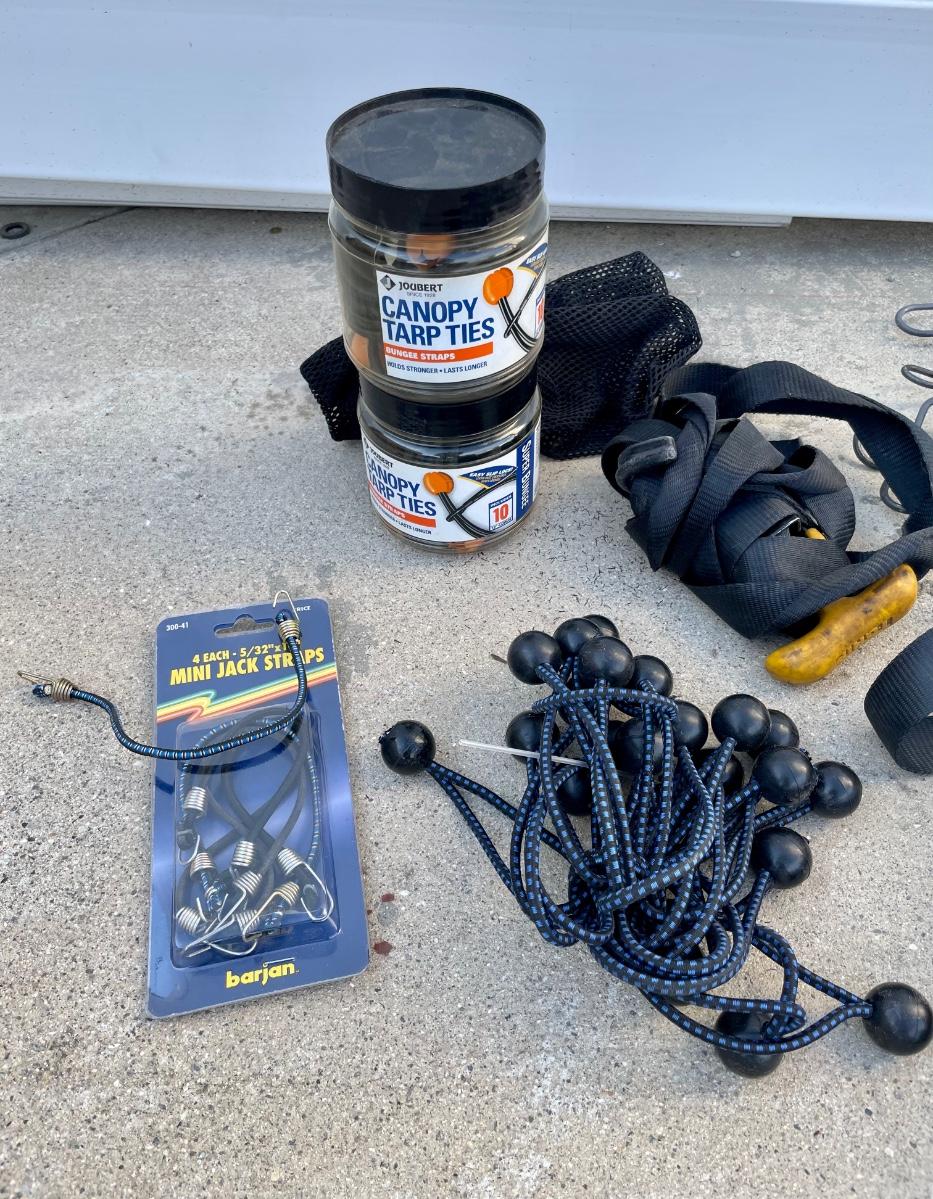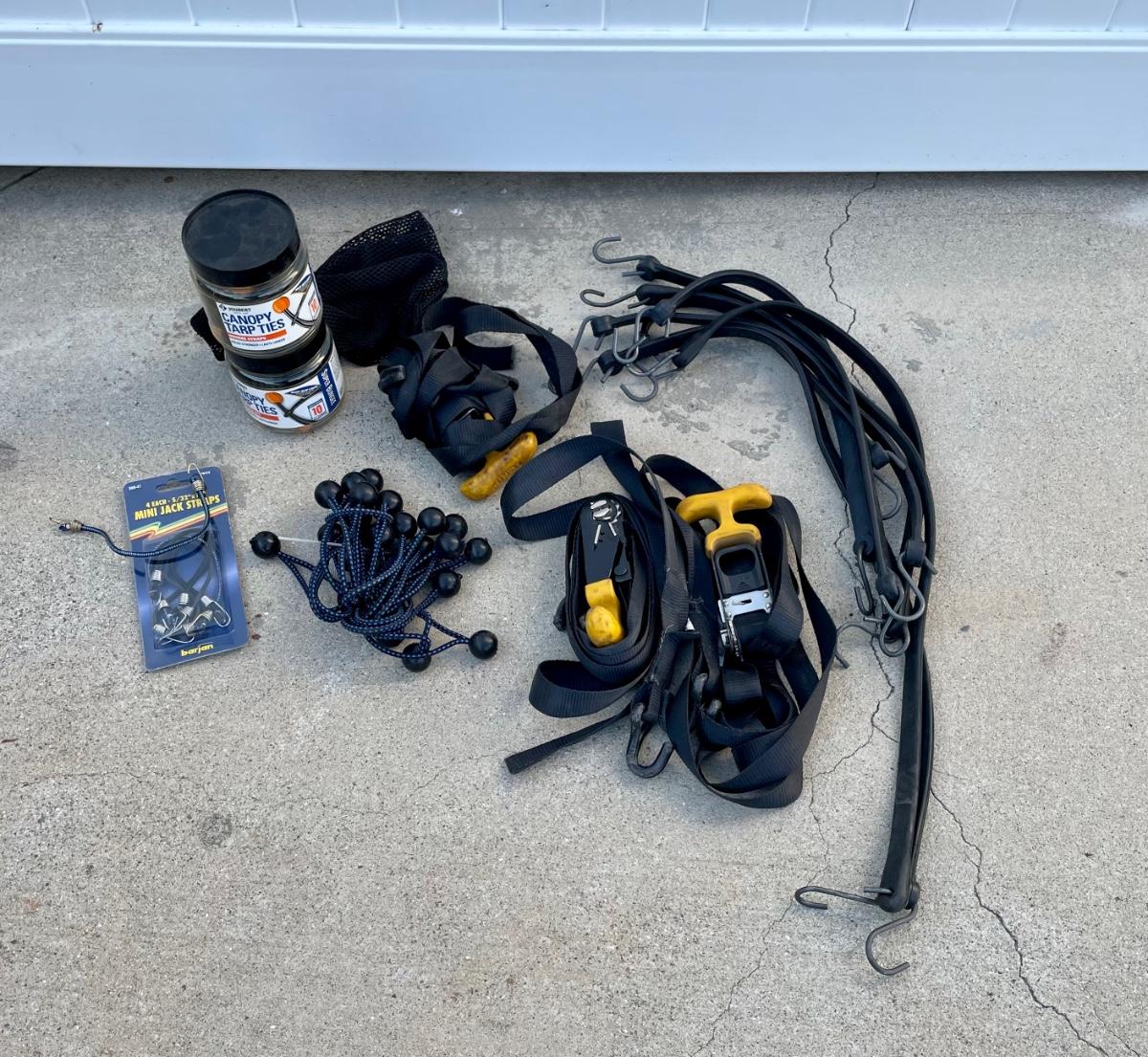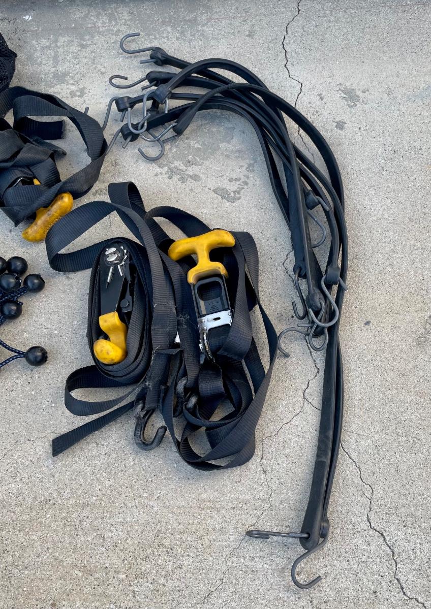 See photos for details: ratchet-style straps, elastic bungie cords, rubber straps, etc.