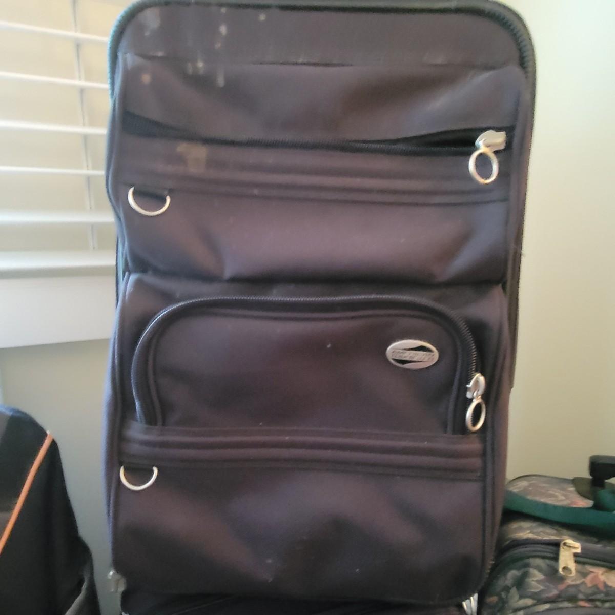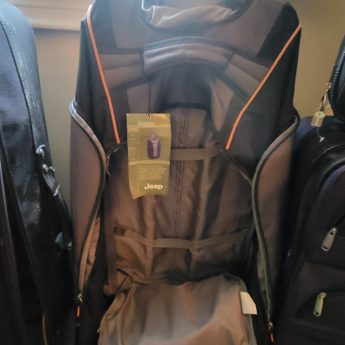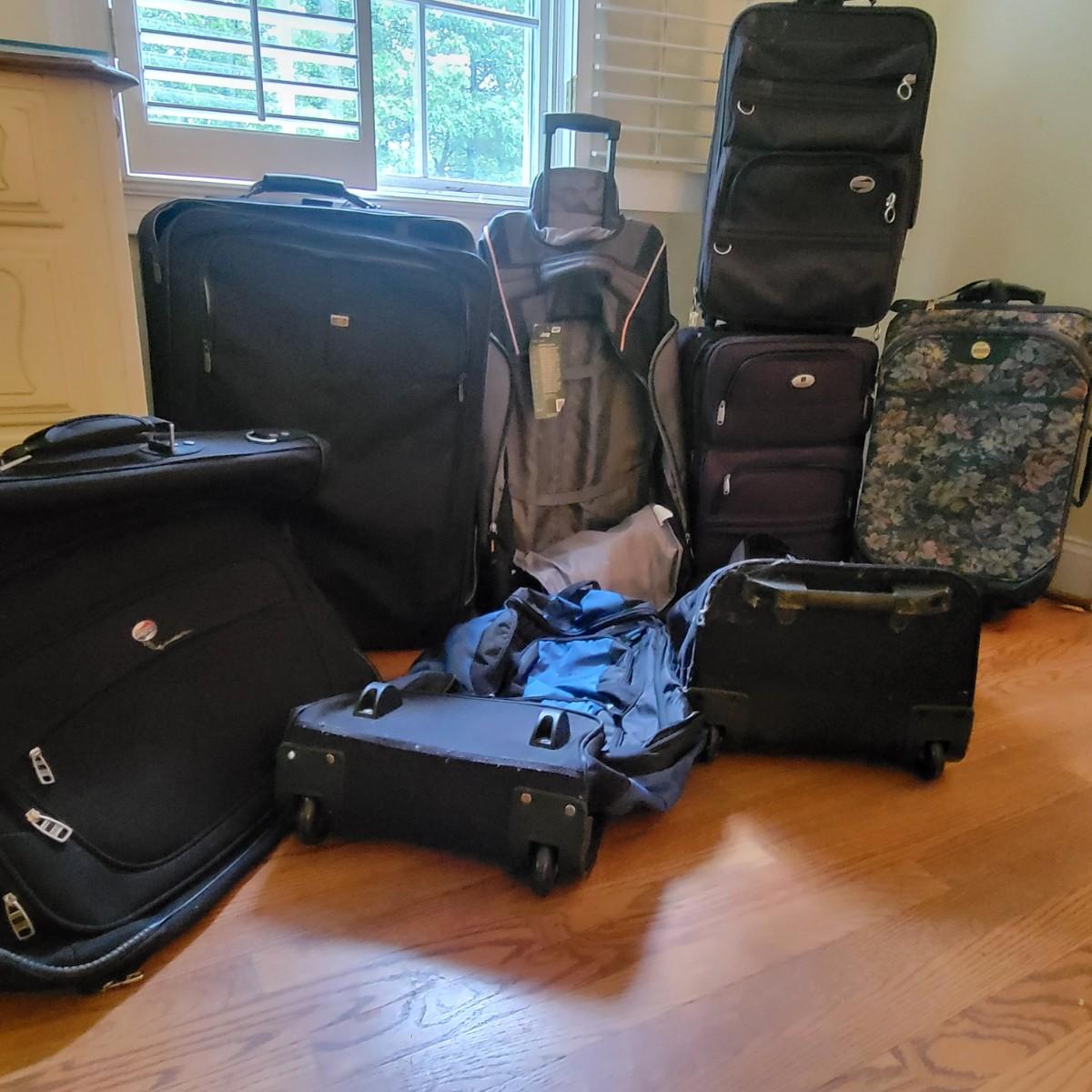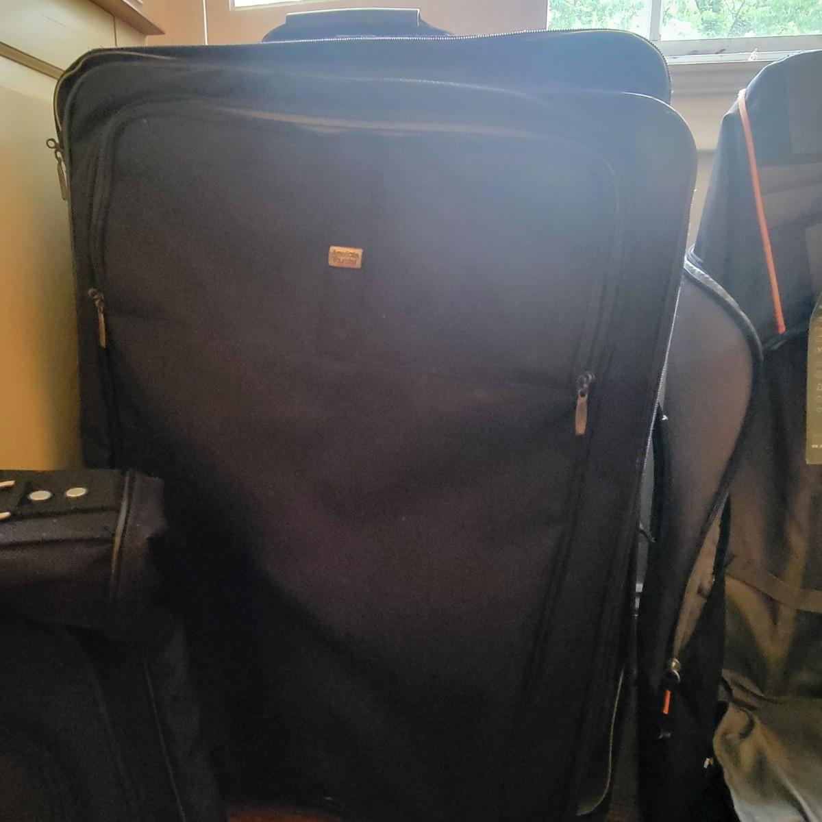 A variety a 8 pieces of luggage. Four made by American Tourister, two by Jeep brand, one by Protégé Sport and one by Leisure. One is also a wardrobe case. Most are unused The largest case is 19" x 30" x 9" Local pickup only