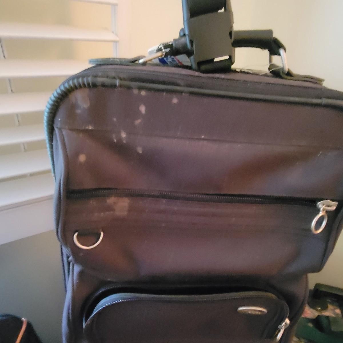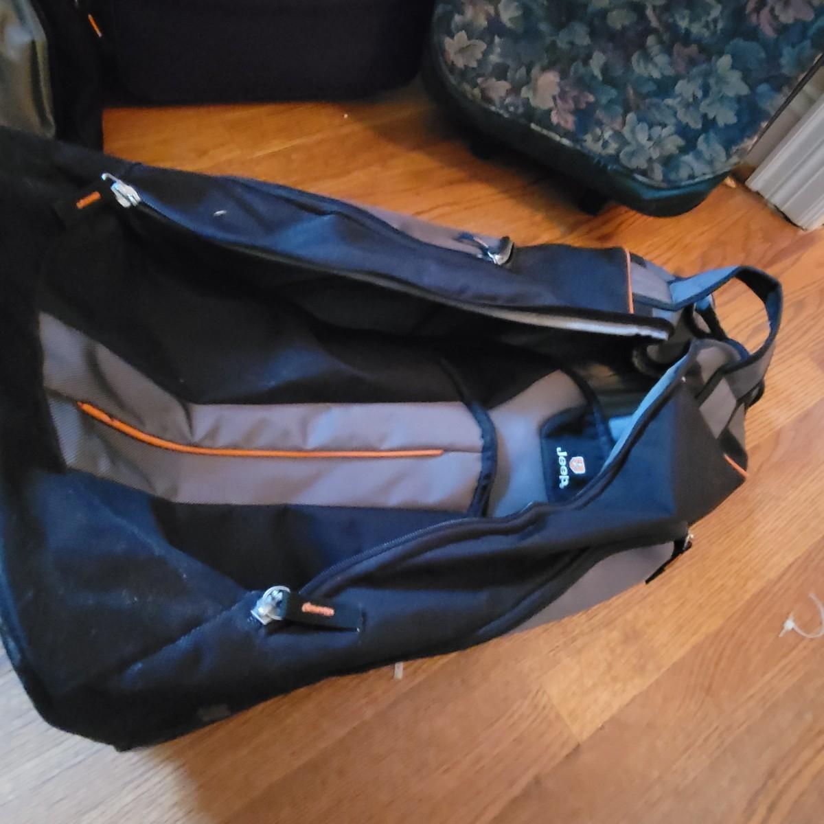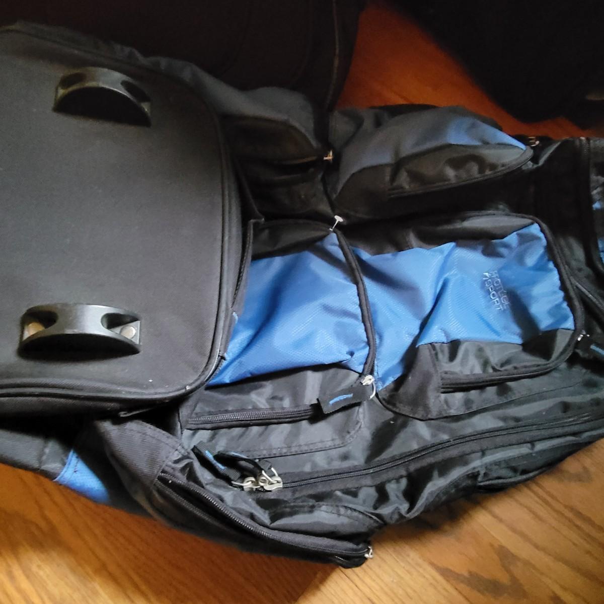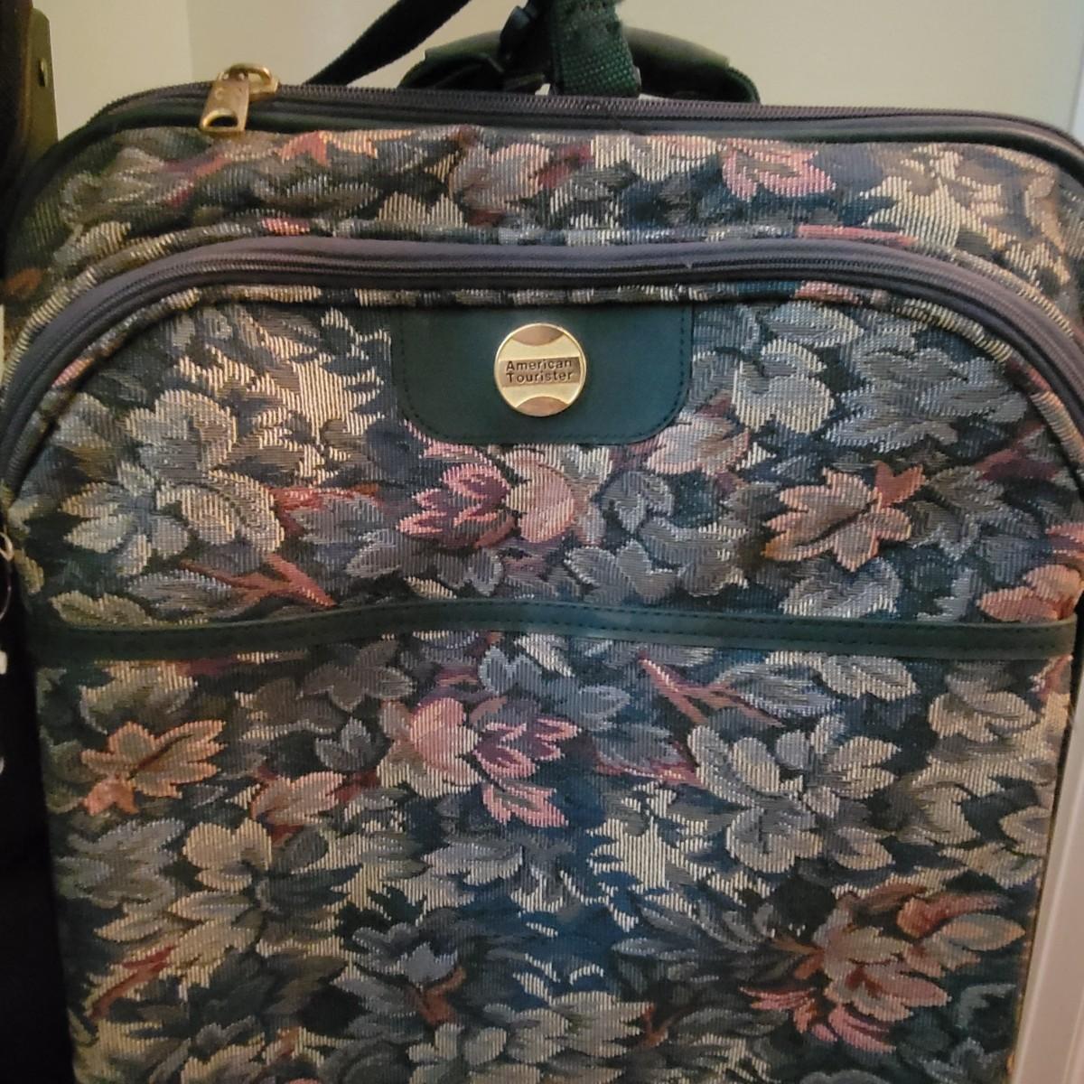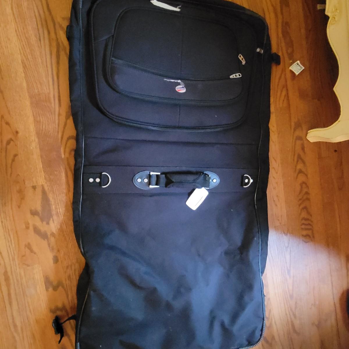 A variety a 8 pieces of luggage. Four made by American Tourister, two by Jeep brand, one by Protégé Sport and one by Leisure. One is also a wardrobe case. Most are unused The largest case is 19" x 30" x 9" Local pickup only