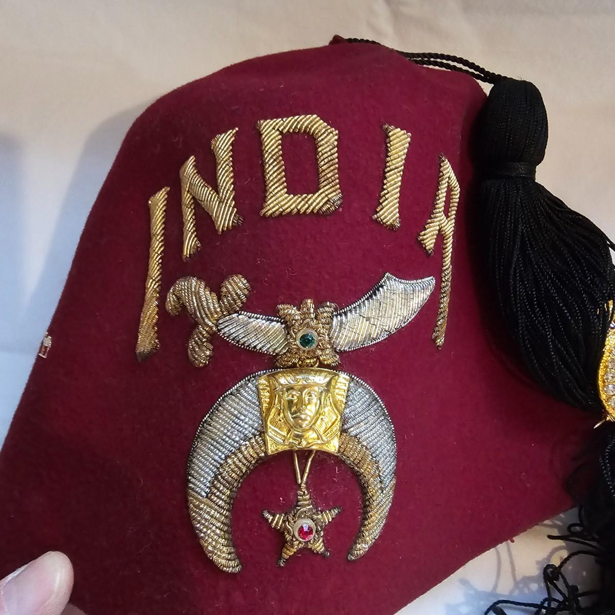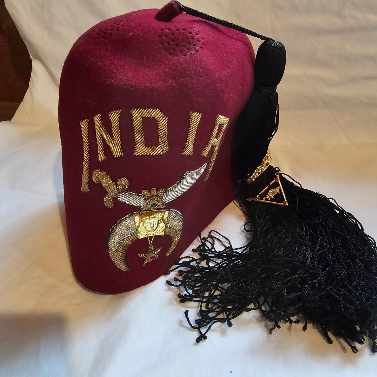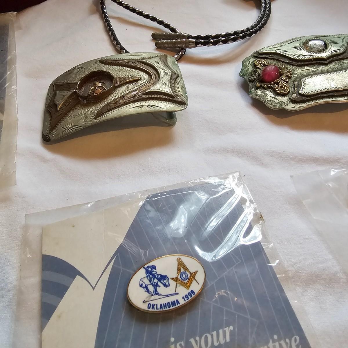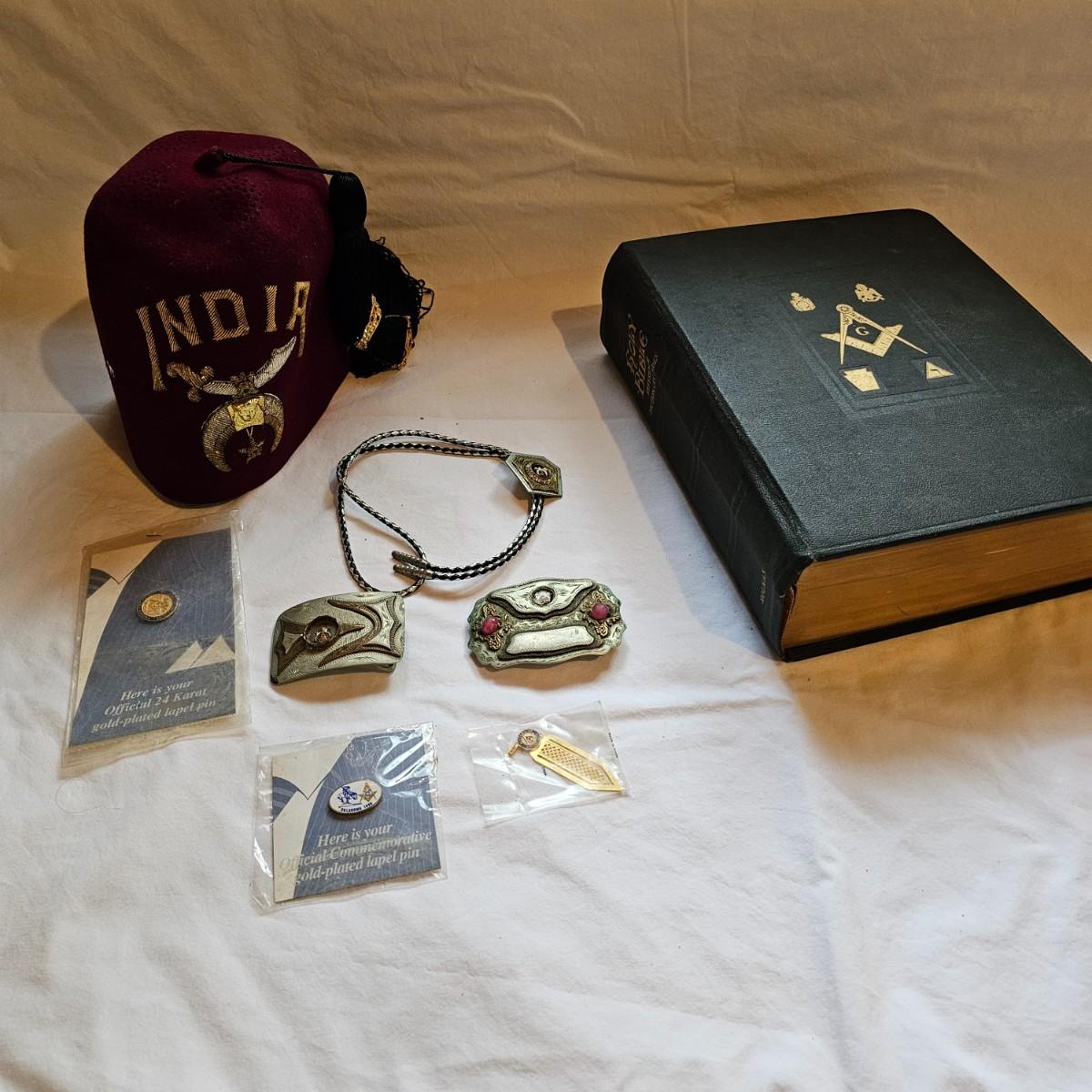 An assortment of Masonic items including pins, belt buckles, a bolo, a Masonic Bible and a vintage felt Shriners fez. Many items from the Oklahoma area. Belt buckles and bolo may or may not be silver, no markings shown. Bible has full dictionary and other study guides. See photos for details. Shipping available.