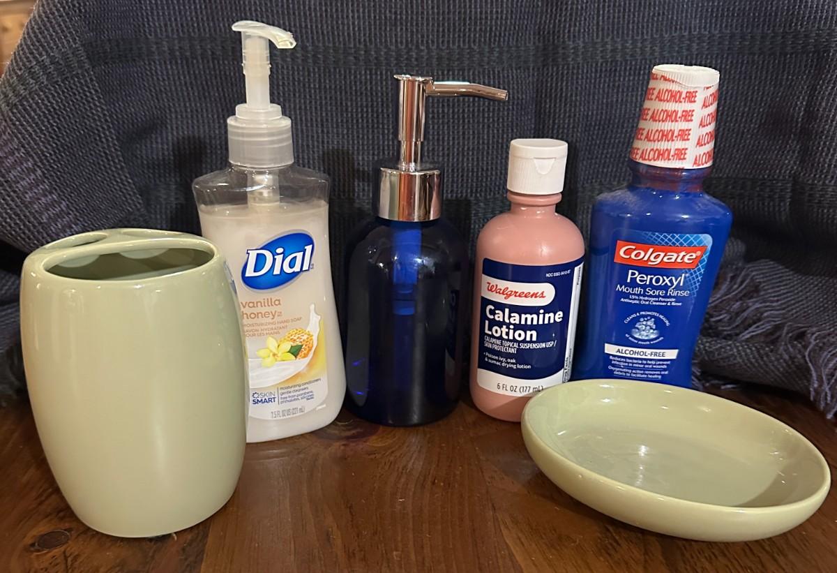 Box of Assorted Mens/Womens Toiletries- Lotions, Soaps Etc. - all at least half full, many full.