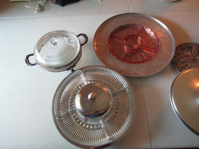 Assorted Metal Serving Pieces. Covered Bowls, Trays, Etc. Most of the covered bowls have glass bowl inserts. Sectioned serving dish is glass with metal holder. Please see all pictures.