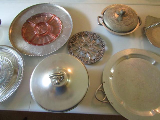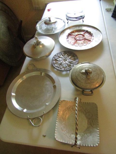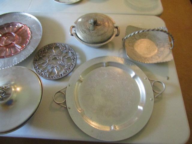 Assorted Metal Serving Pieces. Covered Bowls, Trays, Etc.
