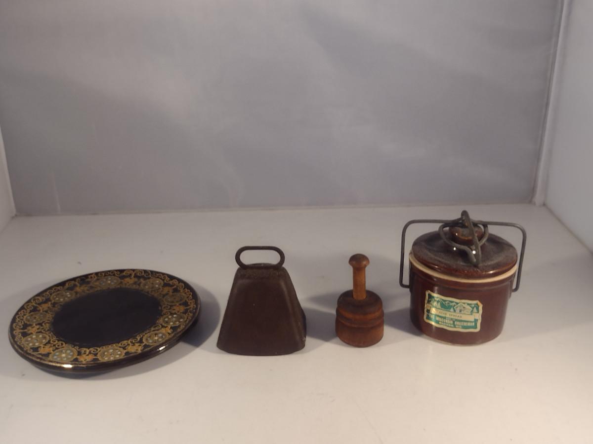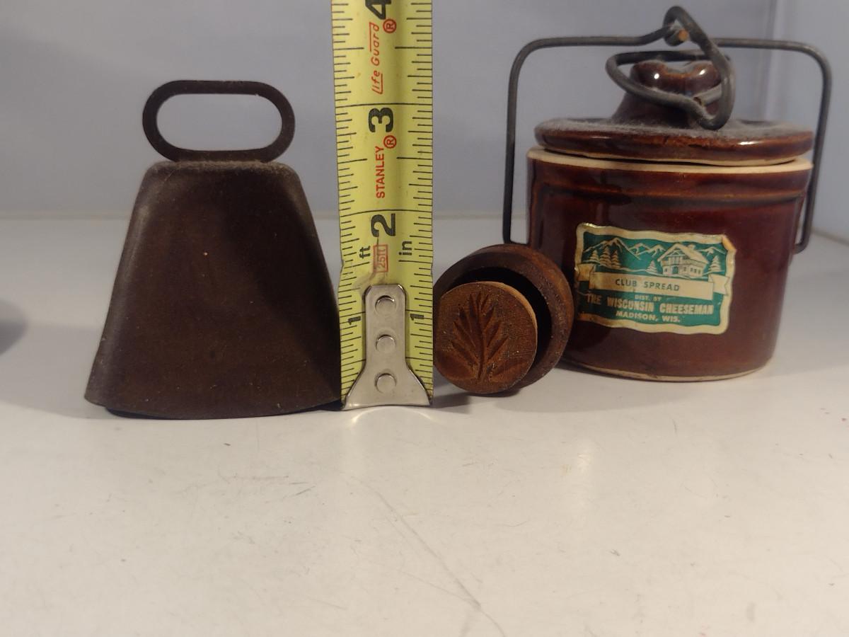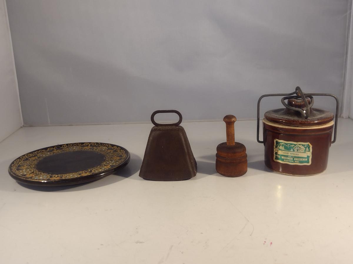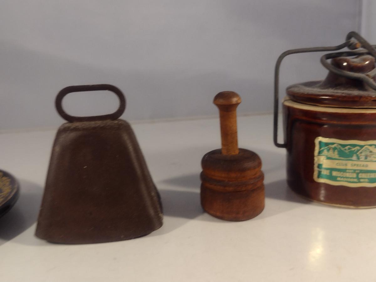 Assorted Milk/Dairy Accessories. Cheese plate, small cow's bell, butter mold, cheese crock.