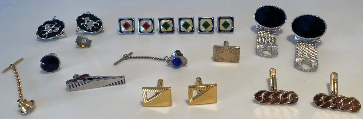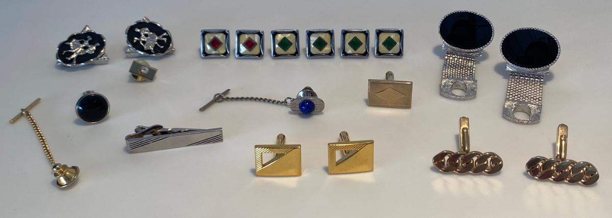Assorted necktie clips and cufflinks. Preowned and sold as is