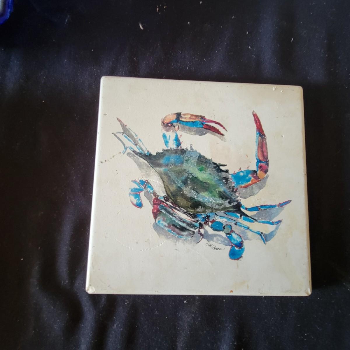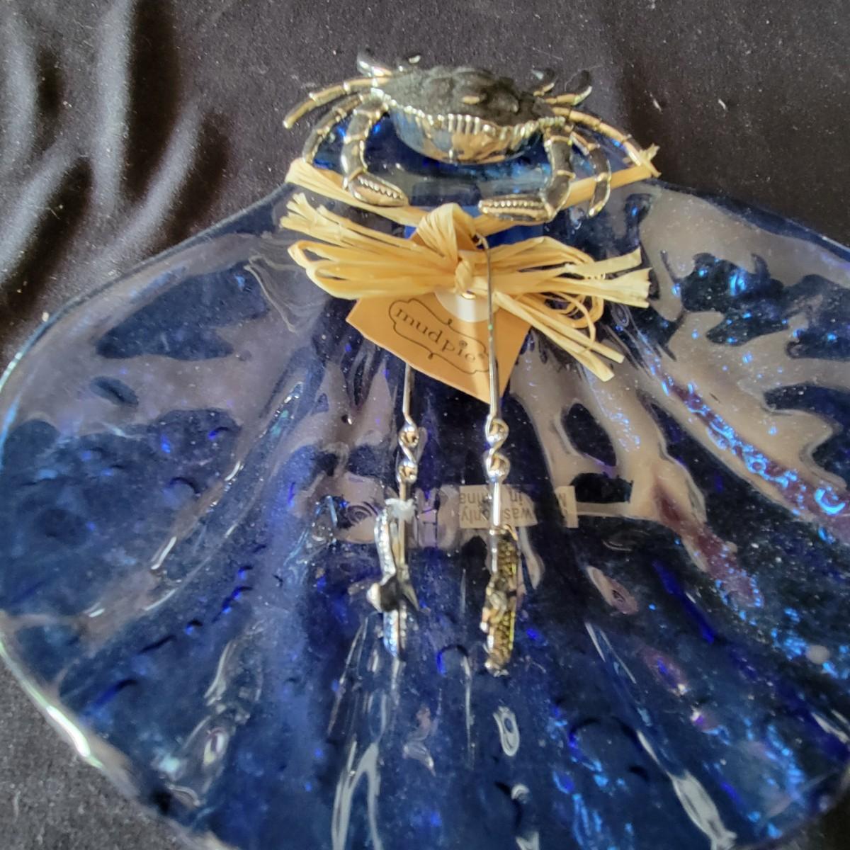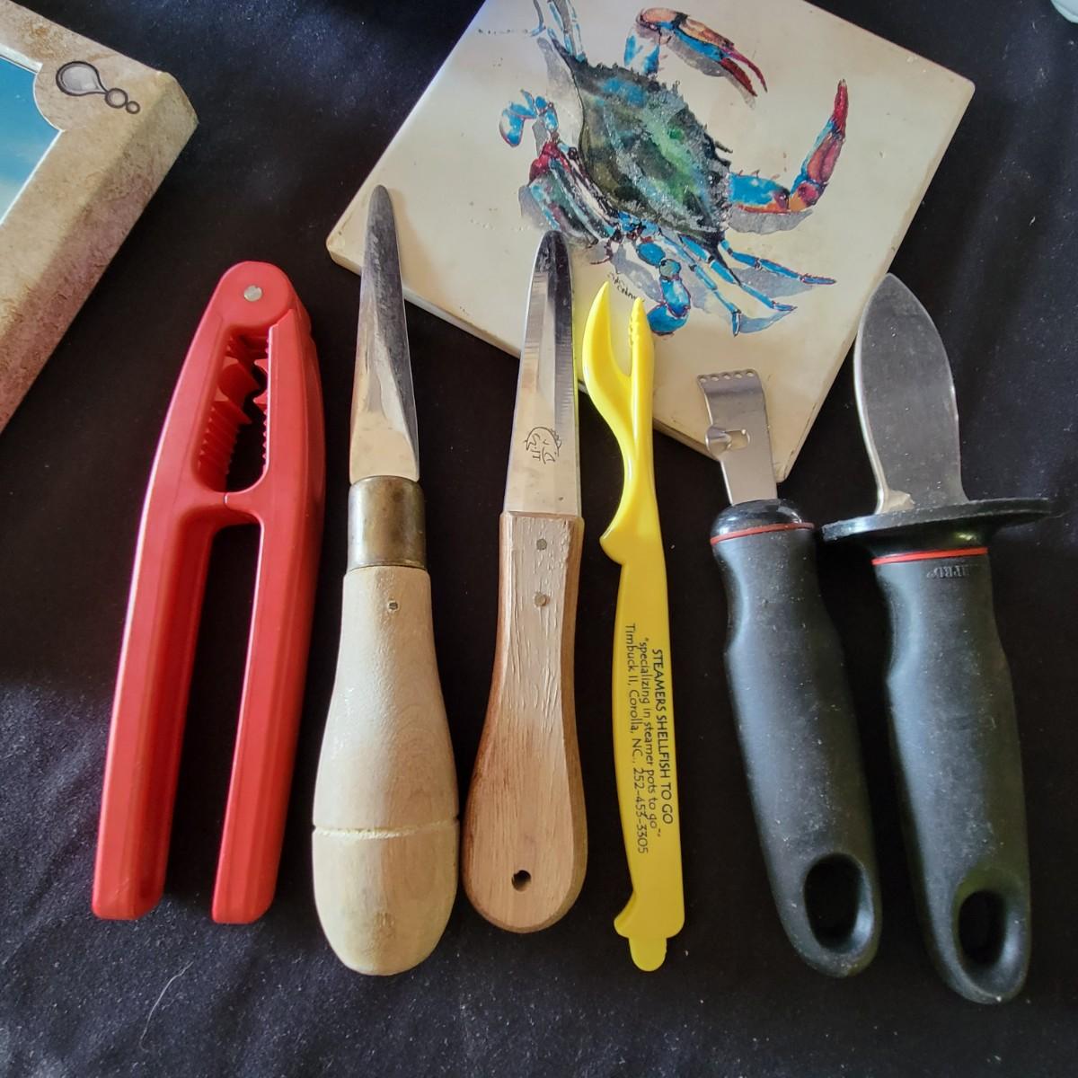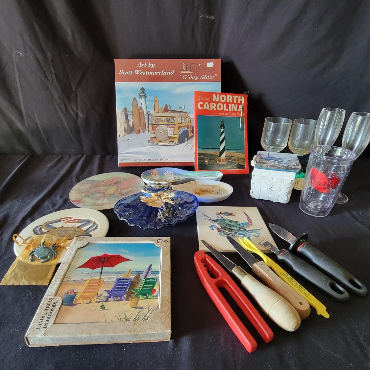 Sea themed lot includes 2 plastic wine flutes and 3 plastic cups. A wooden basket with a printed lid. 2 spoon rests, 4 trivets, and an assortment of oyster shuckers and crab claw crackers. A blue clamshell nut dish adorned with a silver crab and starfish tongs, mermaid bookmark, and a pewter crab. A book on coastal North Carolina and a 550 piece Jigsaw puzzle.