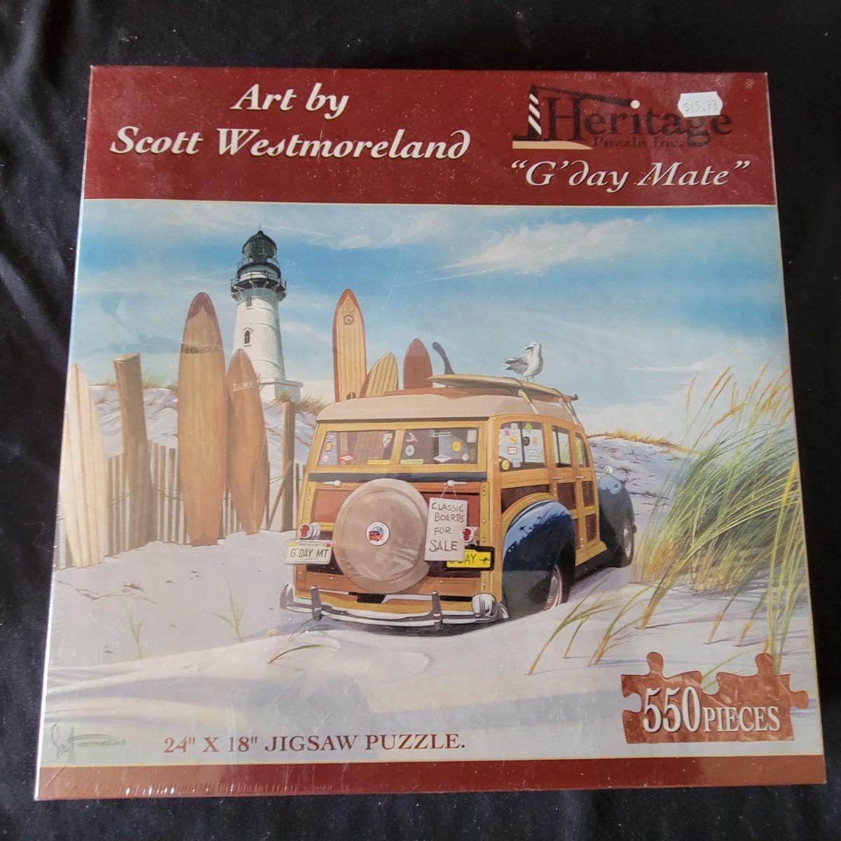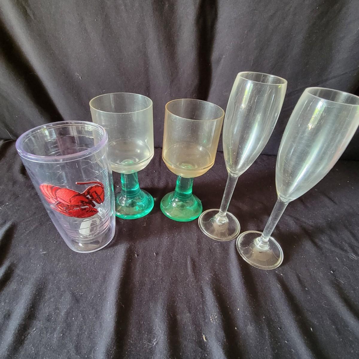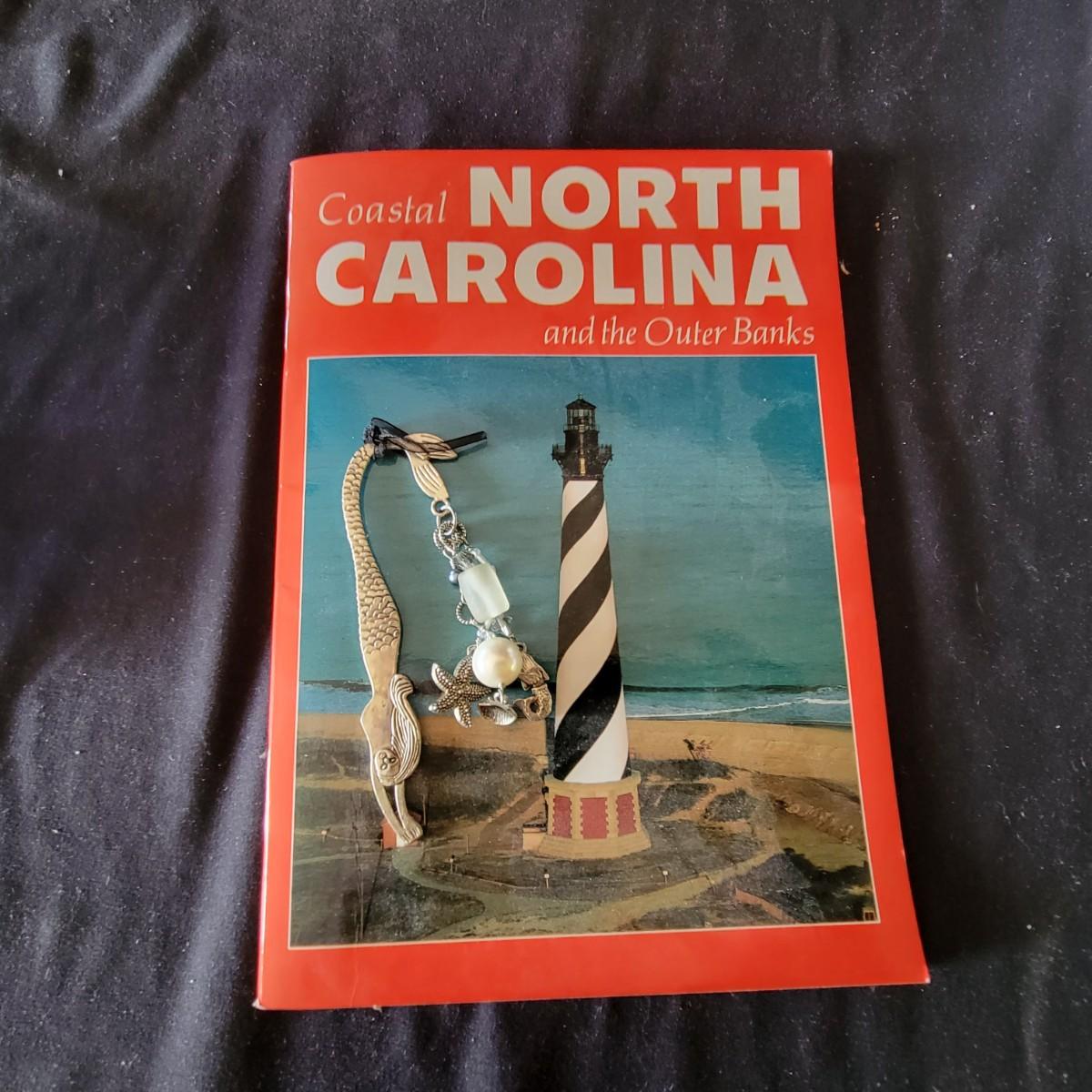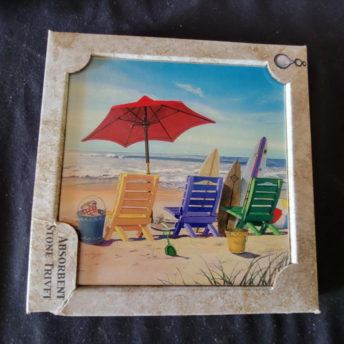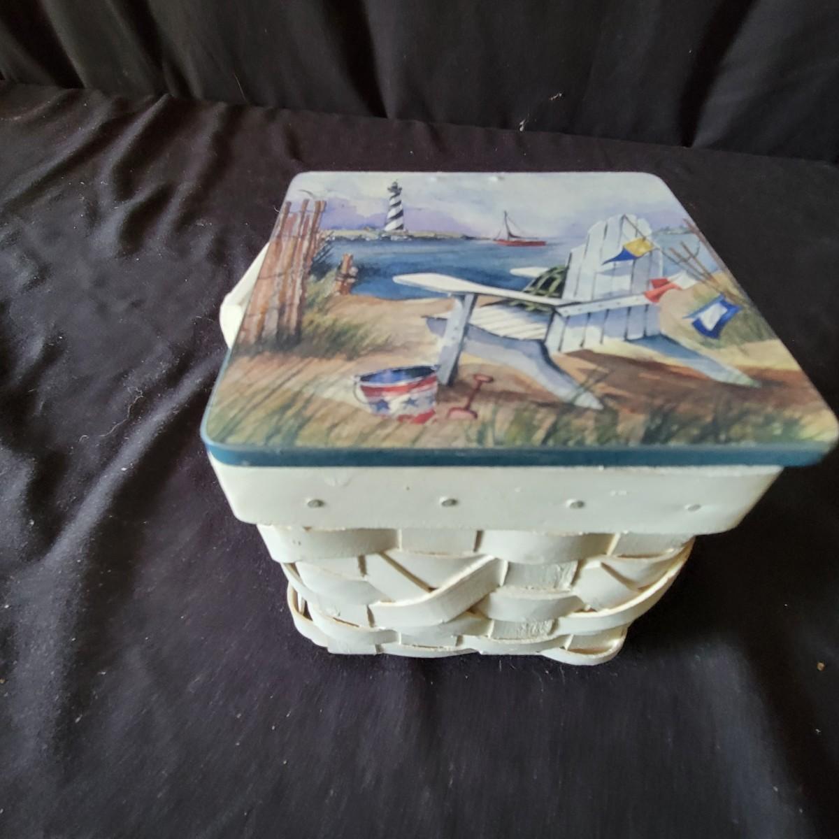 Sea themed lot includes 2 plastic wine flutes and 3 plastic cups. A wooden basket with a printed lid. 2 spoon rests, 4 trivets, and an assortment of oyster shuckers and crab claw crackers. A blue clamshell nut dish adorned with a silver crab and starfish tongs, mermaid bookmark, and a pewter crab. A book on coastal North Carolina and a 550 piece Jigsaw puzzle.