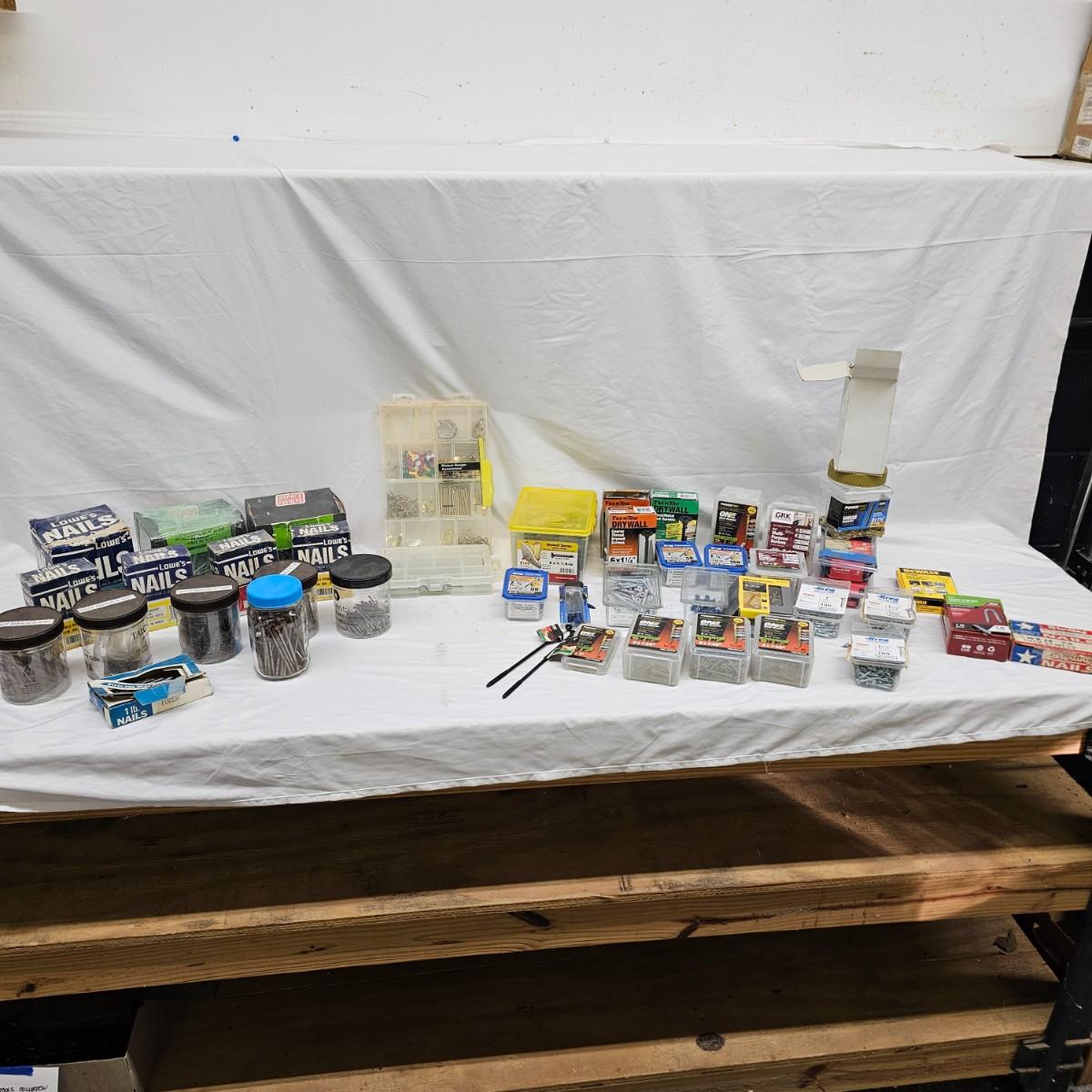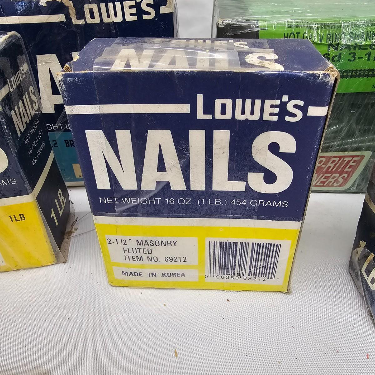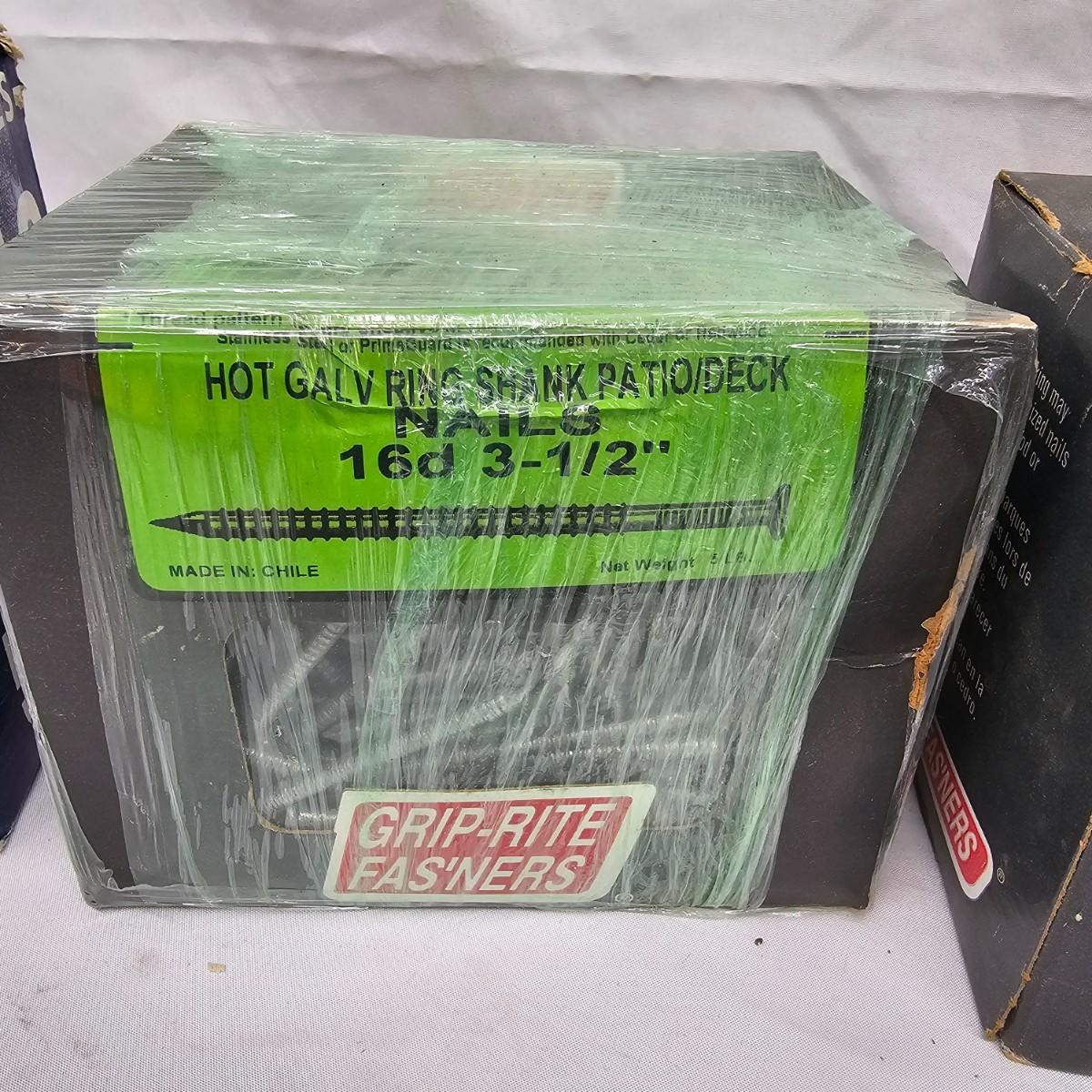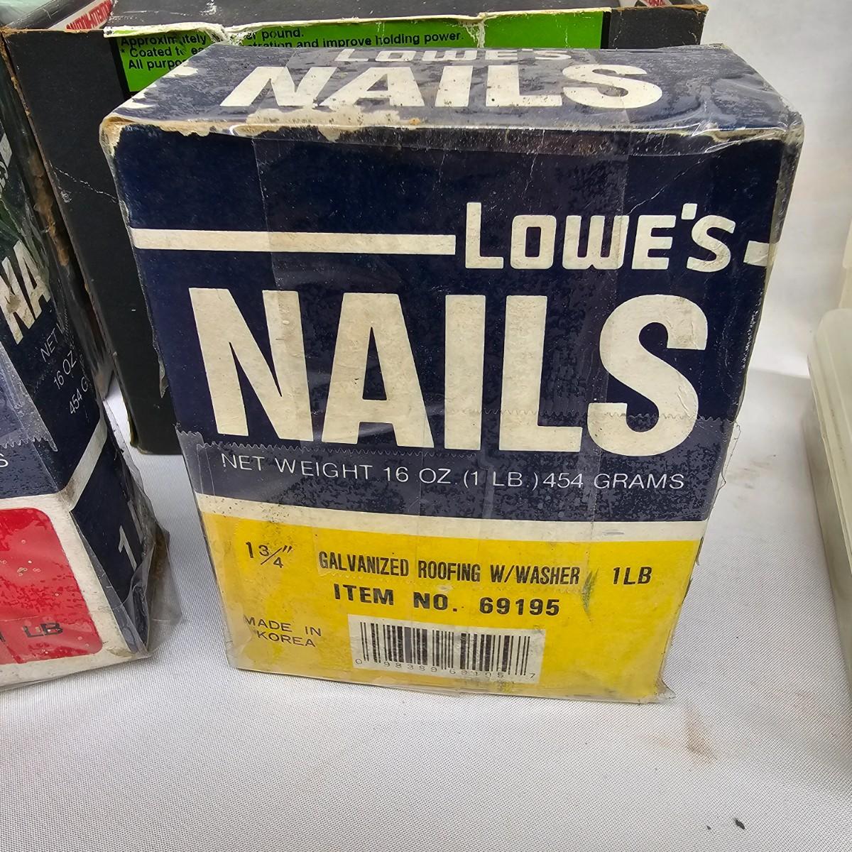 Boxes and containers of just nails and screws. Indoor, outdoor, galvanized, for decking, lumber, more. Assorted sizes and diameters. Some older items in original boxes. Lowe's, PowerPro, GripRite, Tapcon and others. Quantities unknown. See photos for details. Local pickup only.