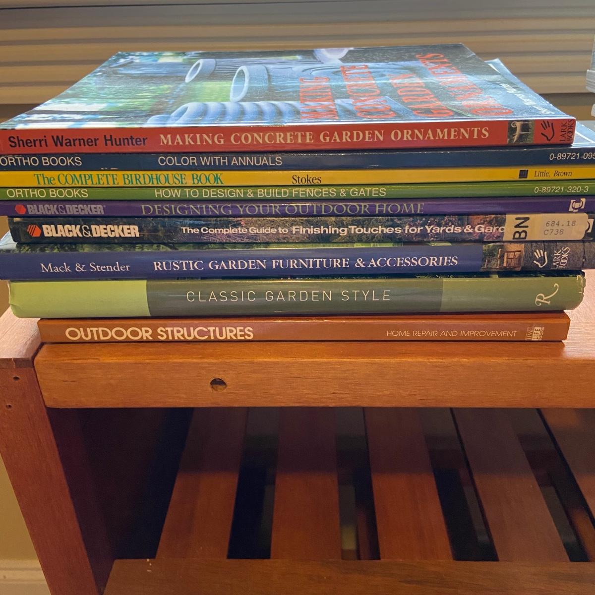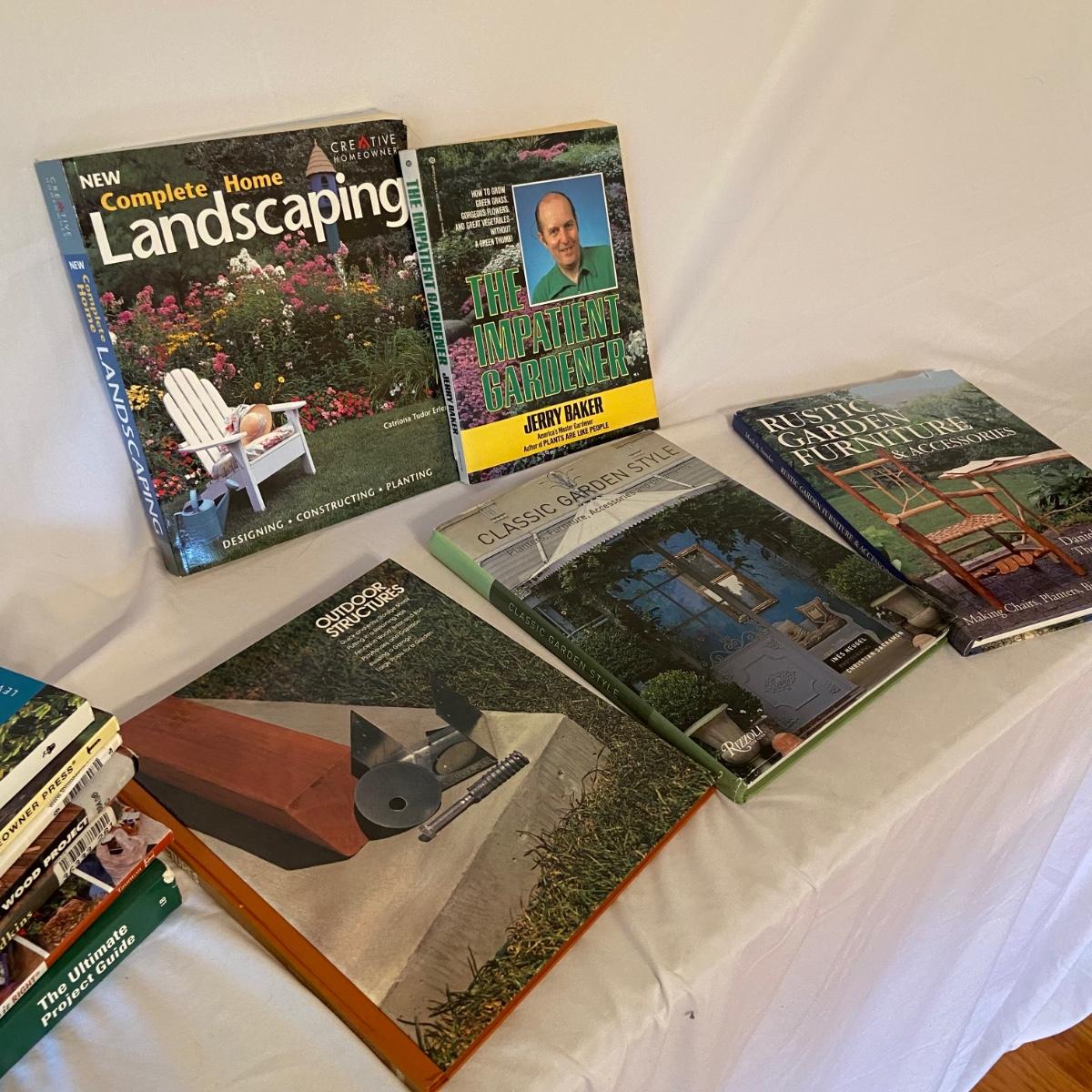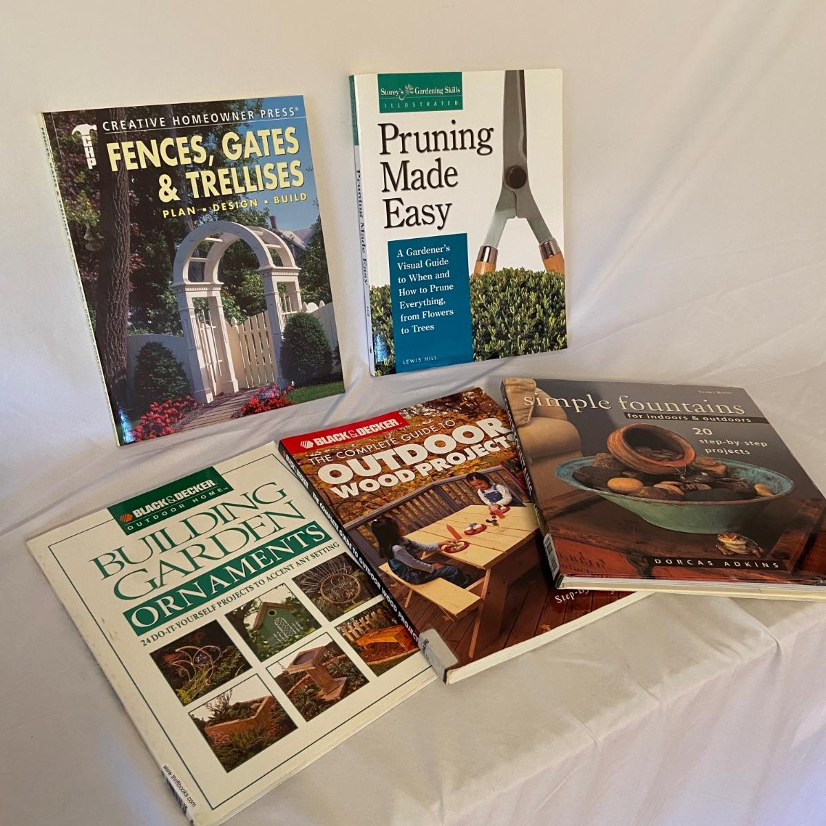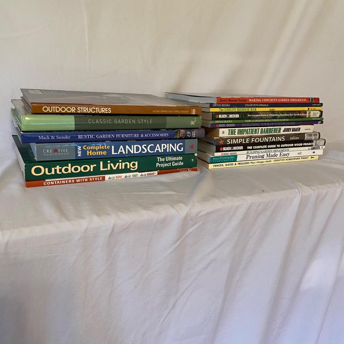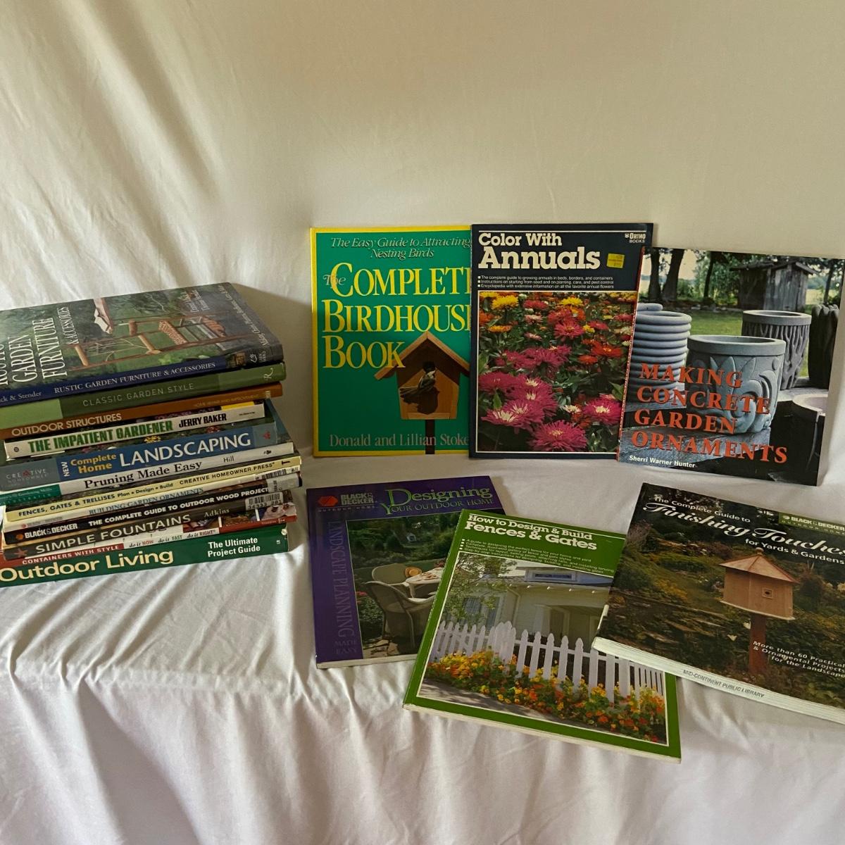 This lot includes a total of 18 gardening and outdoor related books. The topics range from elevating your outdoor furniture to building fences to landscaping to bird houses. See pictures for titles. Shipping available.