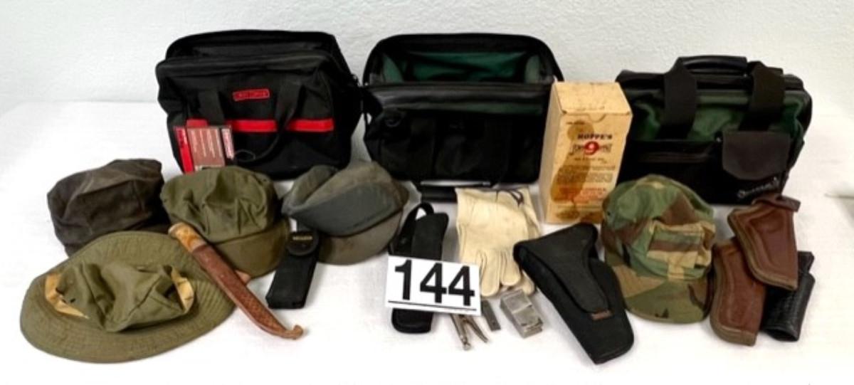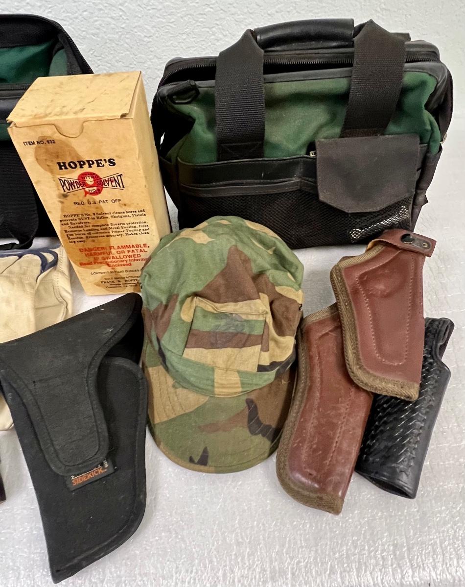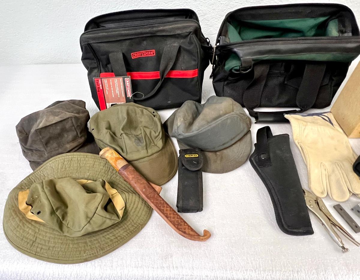 Includes tool bags, military hats, gloves, holsters, and more. SOLD AS IS.