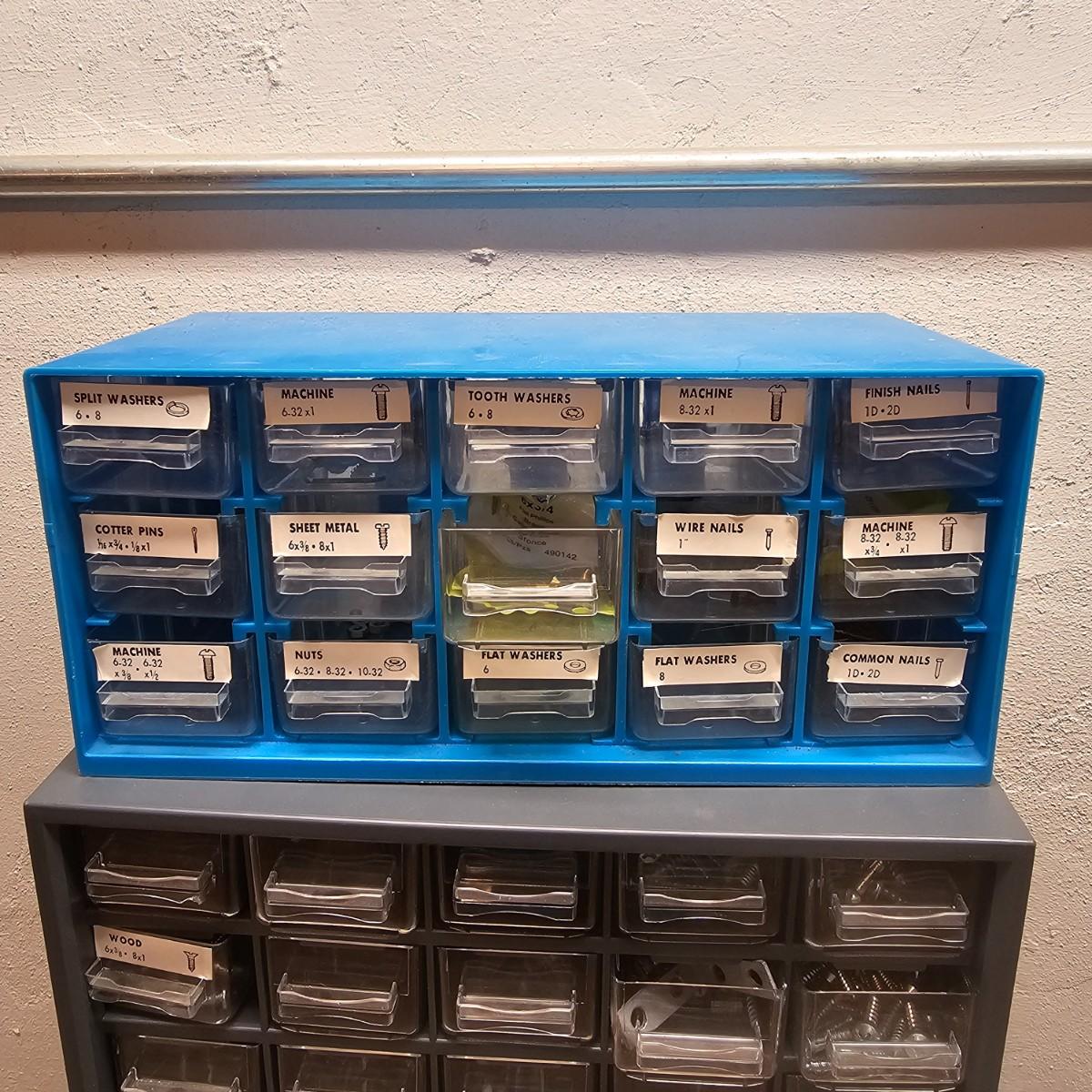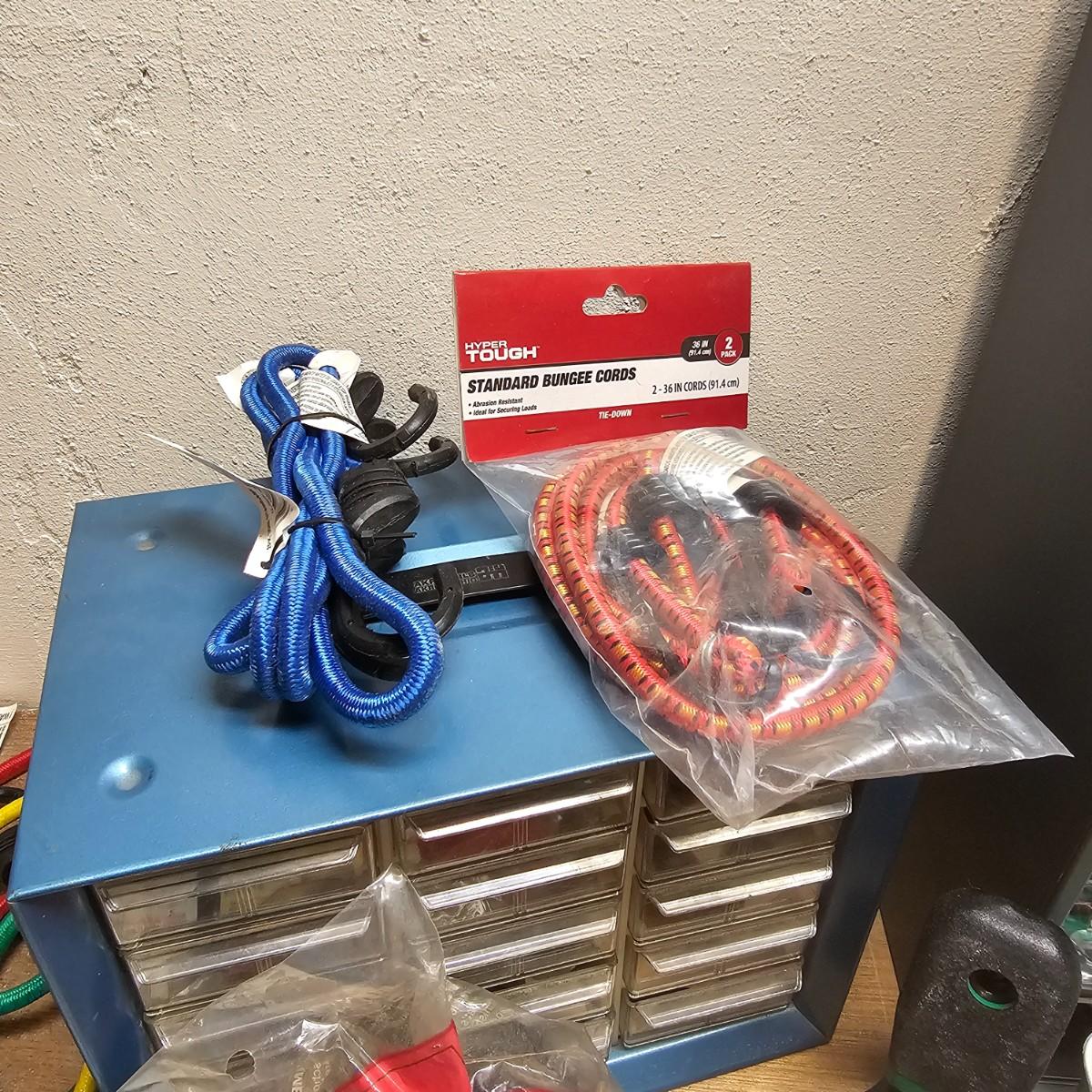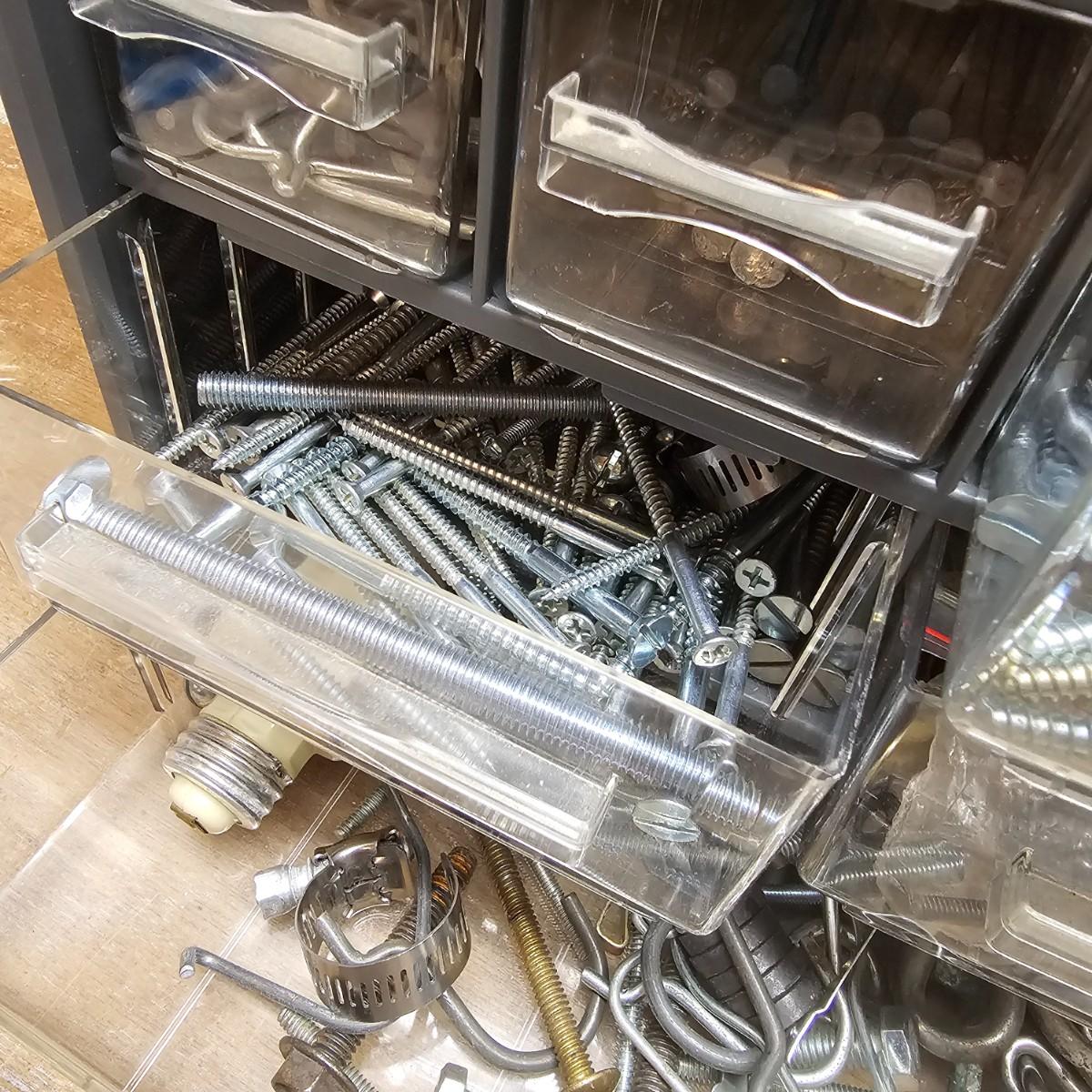 Screws, nuts, bolts, nails, paint brushes, scrapers, bungie cords and more. Steel wool, sandpaper, buffer pads, super furniture sliders. Also includes three drawer chests with an assortment of hardware. Largest drawers are 12" x 6" x 16.5"H. See photos for details. Local pickup only.