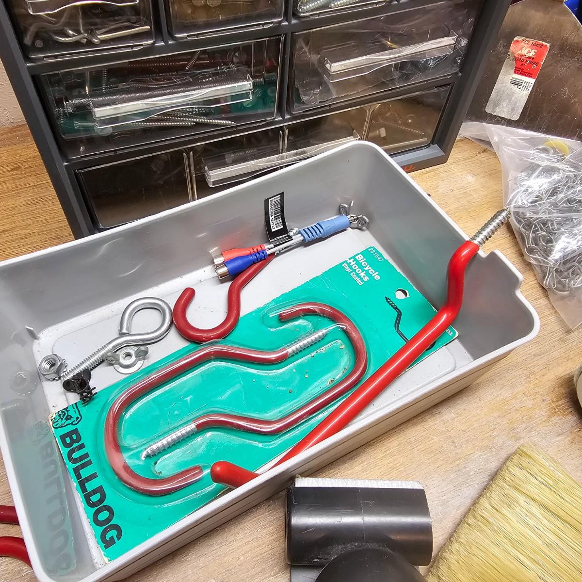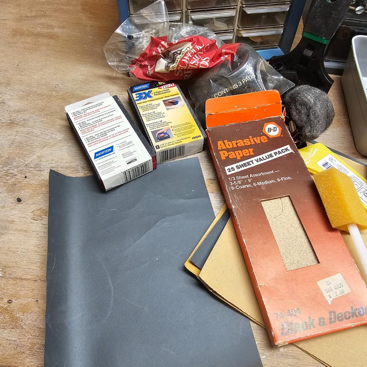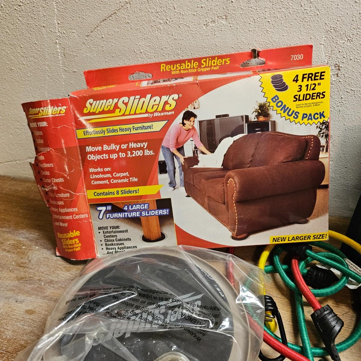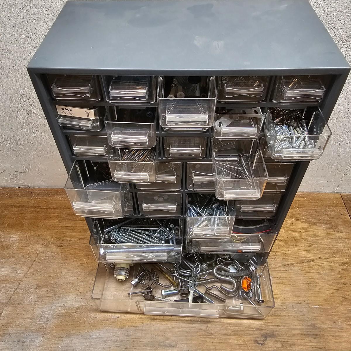 Screws, nuts, bolts, nails, paint brushes, scrapers, bungie cords and more. Steel wool, sandpaper, buffer pads, super furniture sliders. Also includes three drawer chests with an assortment of hardware. Largest drawers are 12" x 6" x 16.5"H. See photos for details. Local pickup only.
