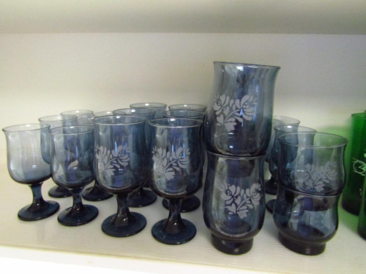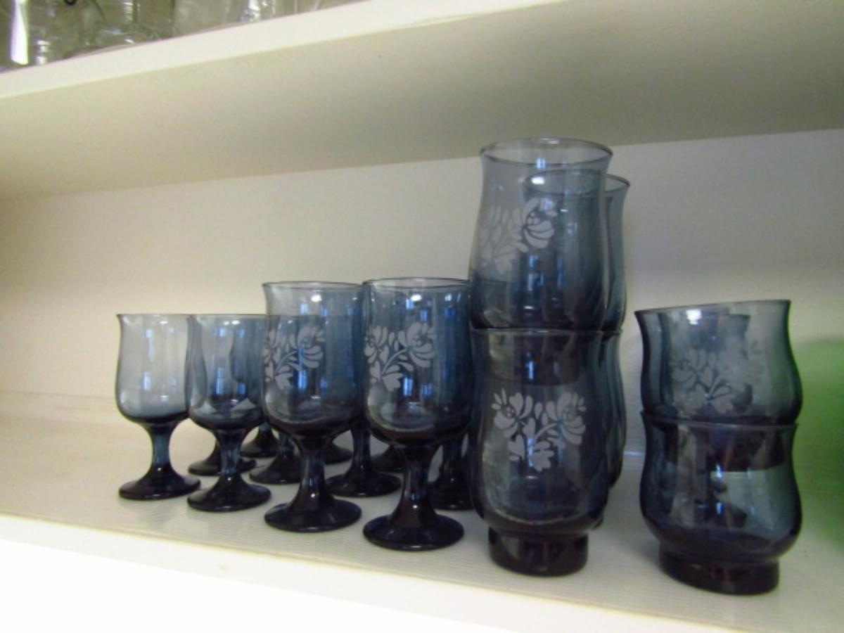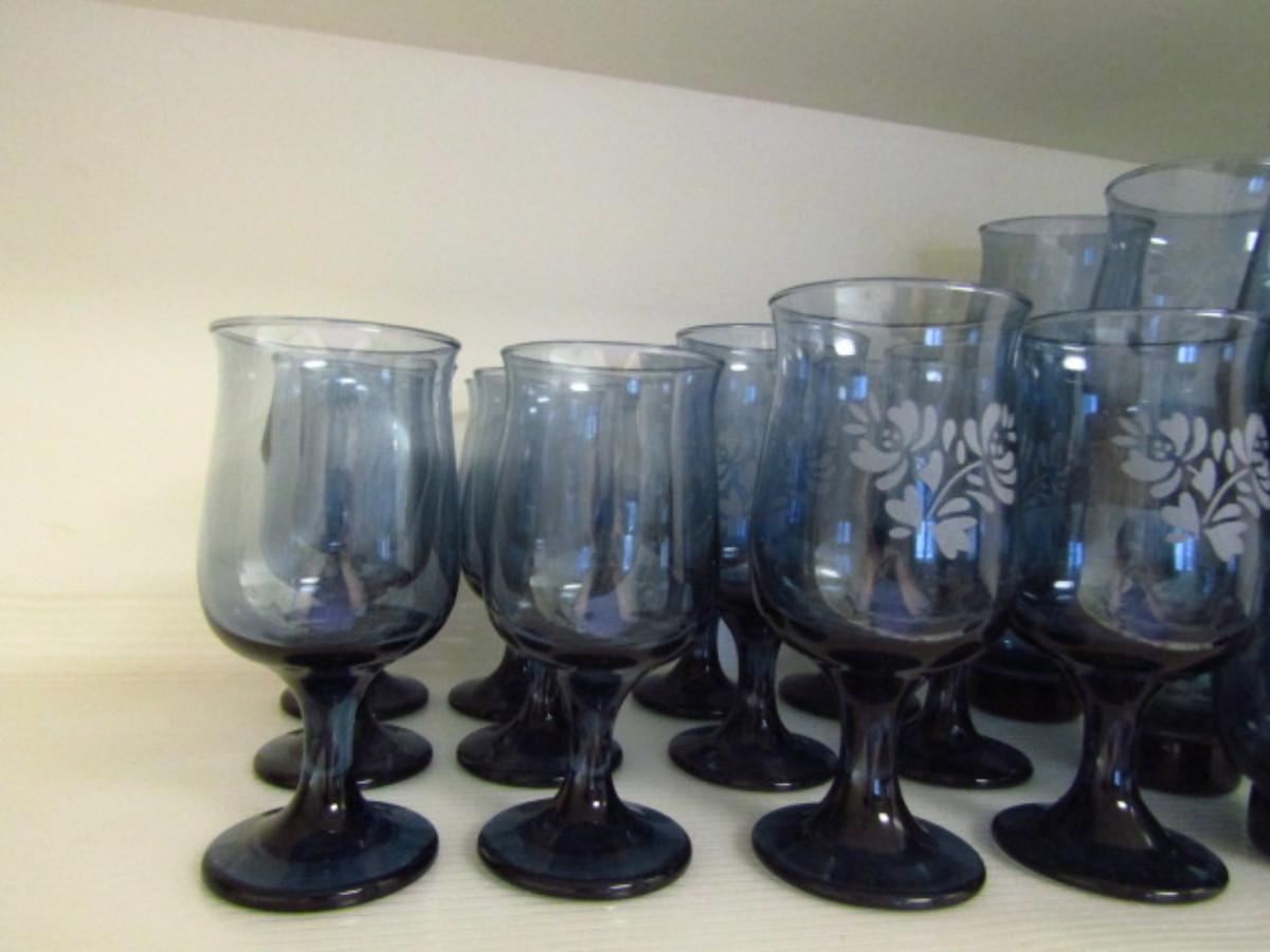 Assorted Pfaltzgraff Yorktowne Blue Glass Drinkware. Small juice glasses- 2 pcs. Regular drinking glasses- 6 pcs. Stemmed goblets- 6 pcs. Also included are 8 small stemmed glasses that are not marked with the Yorktowne design.