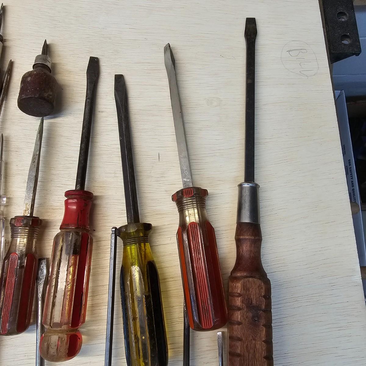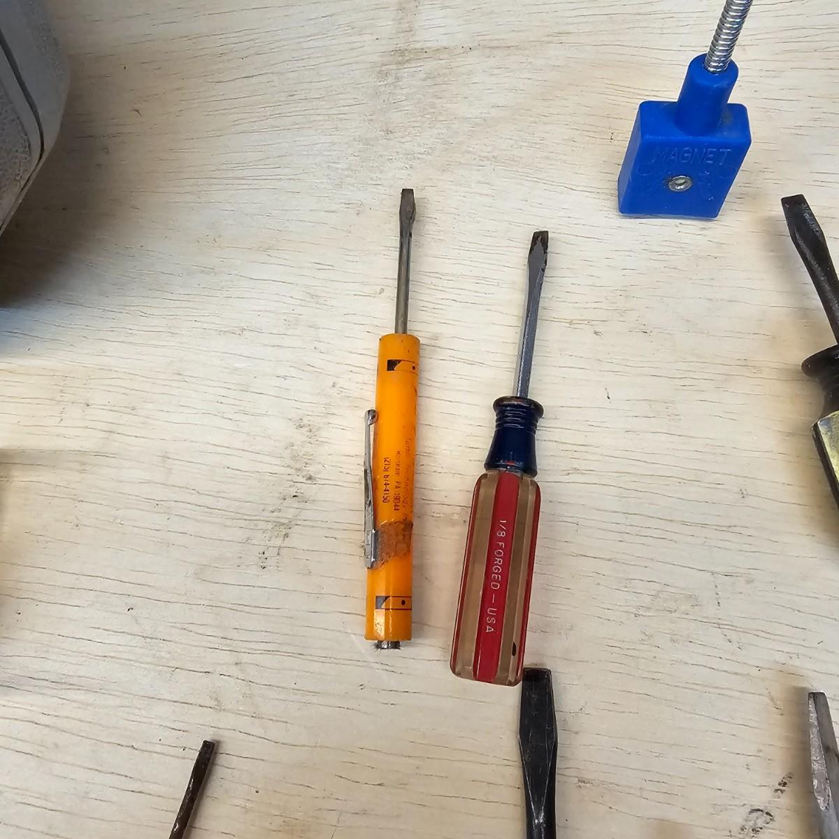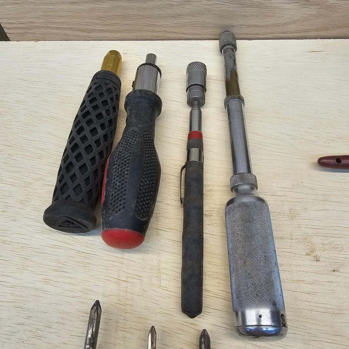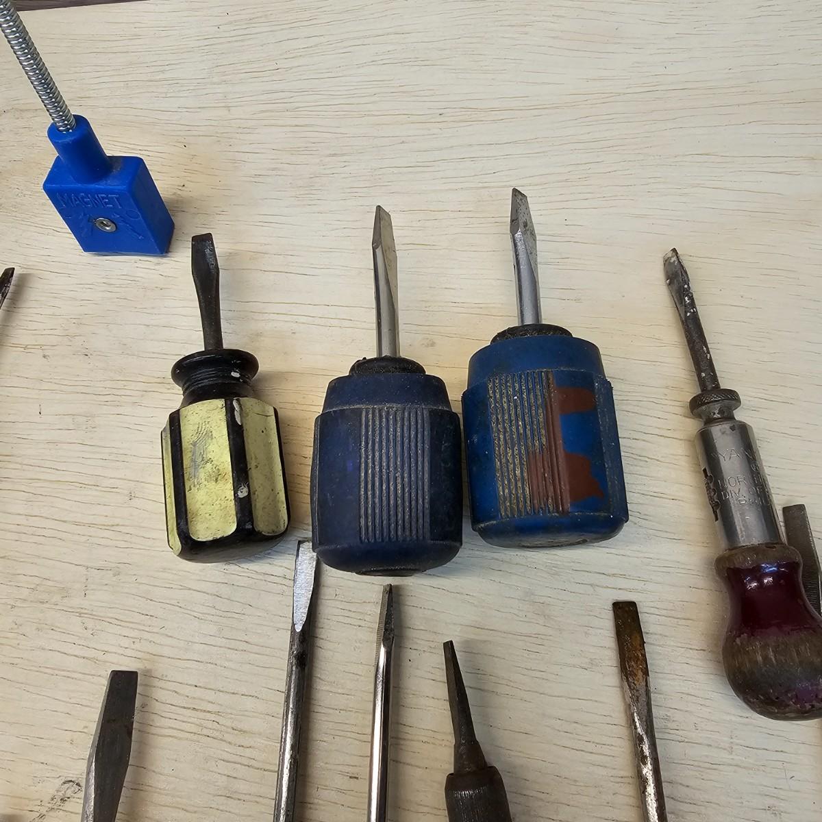 Long, short, stubby and more. Mant different brands represented here. Majority of items are flat blade, but a few Phillips as well. Some extendable magnets for picking things up. A set of bits and sockets with handle for everyday use. Longest item is 12", shortest is 2". See photos for details. Shipping available.
