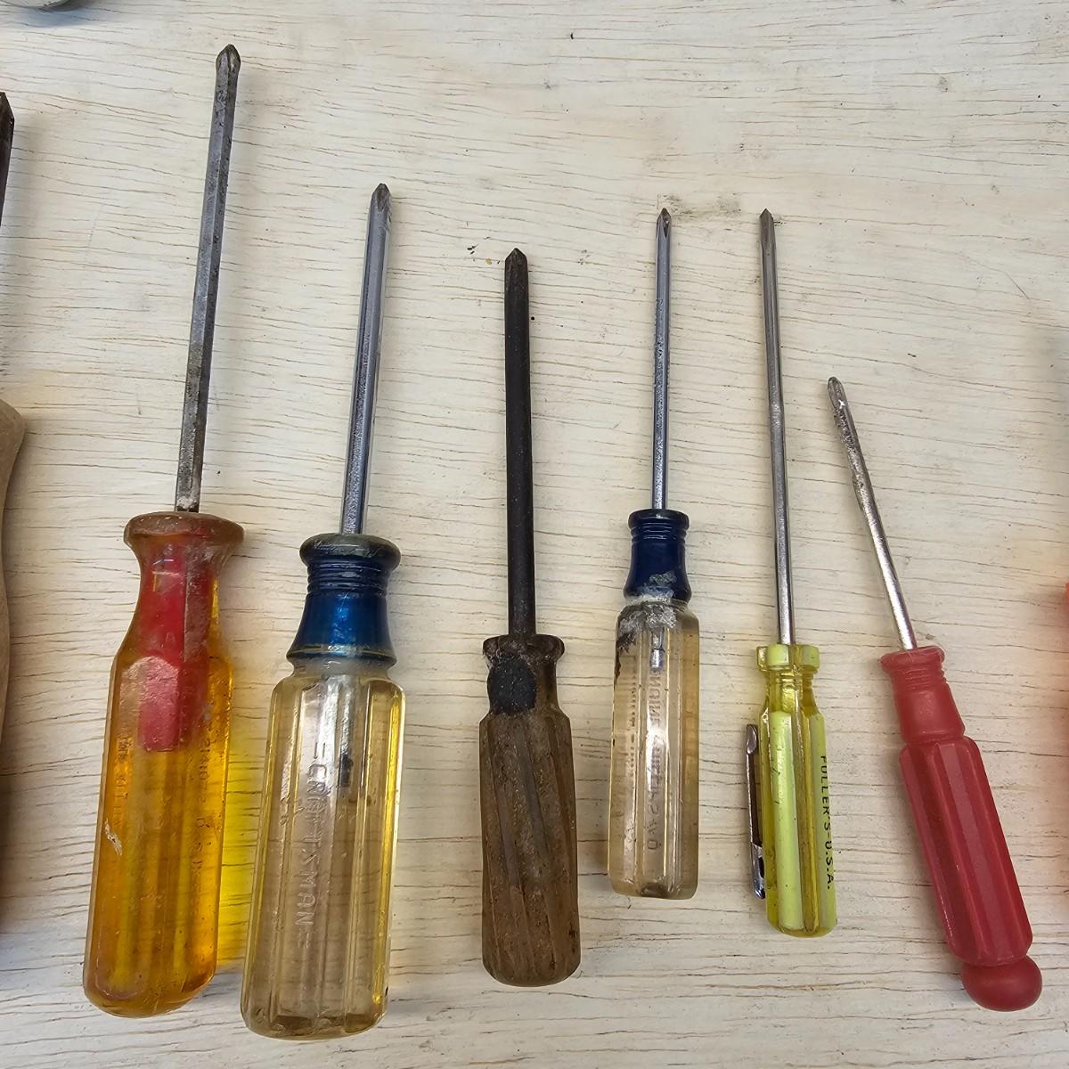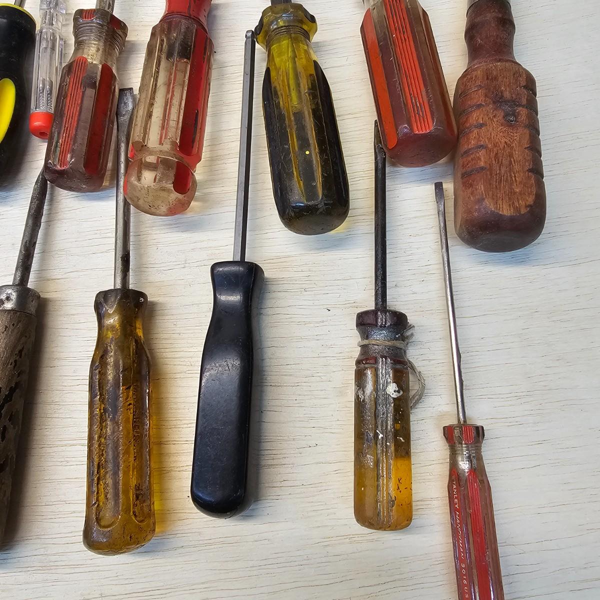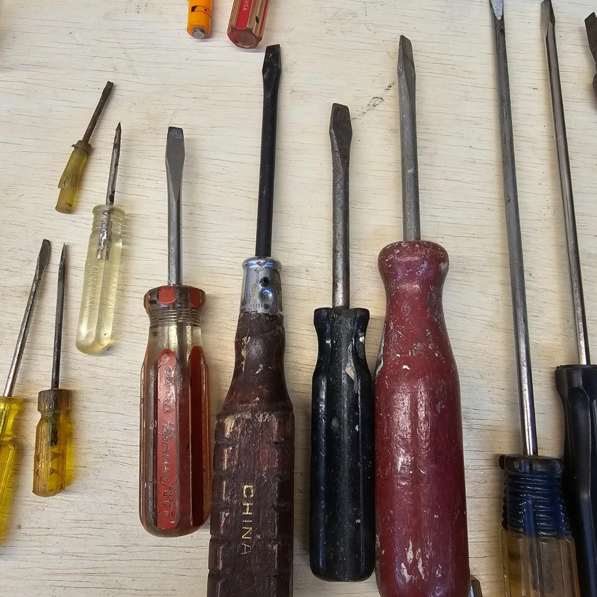Long, short, stubby and more. Mant different brands represented here. Majority of items are flat blade, but a few Phillips as well. Some extendable magnets for picking things up. A set of bits and sockets with handle for everyday use. Longest item is 12", shortest is 2". See photos for details. Shipping available.