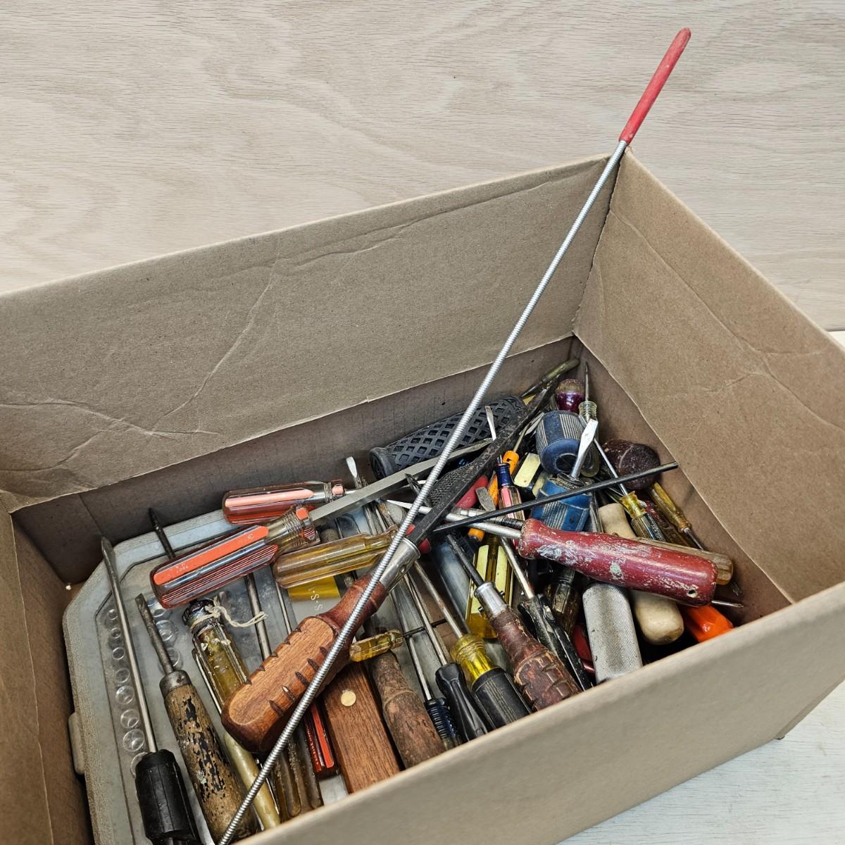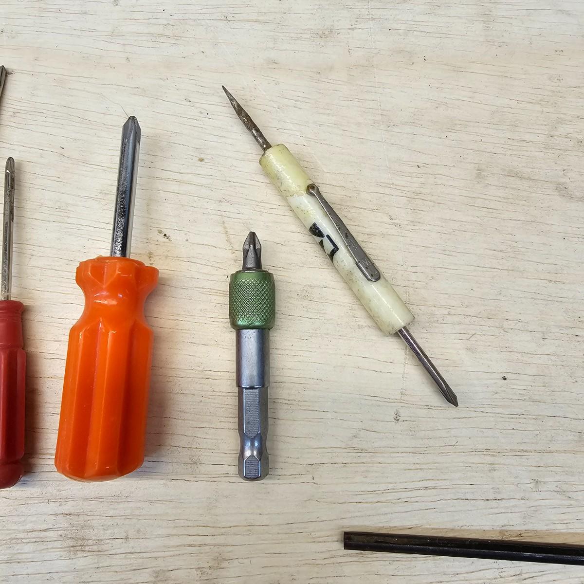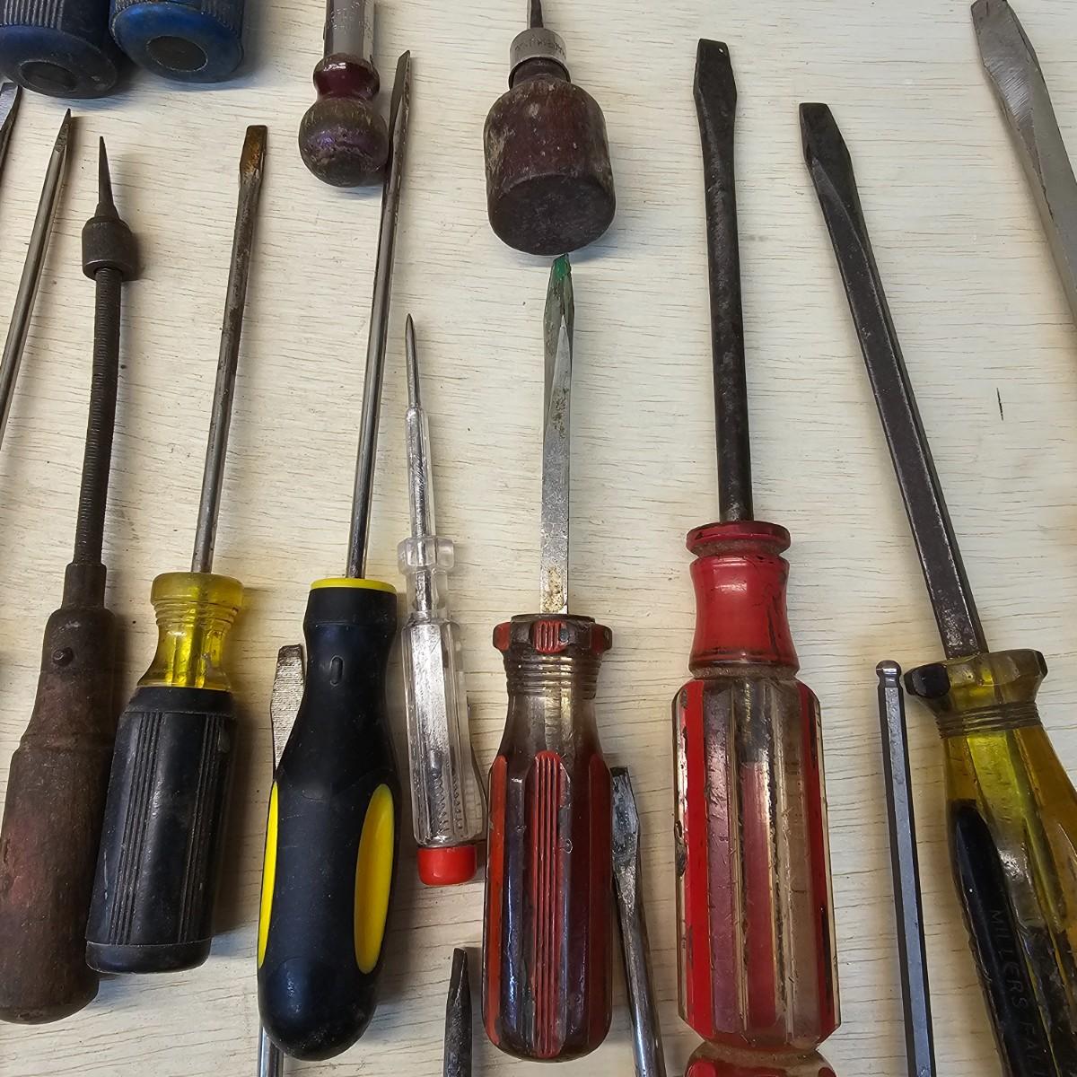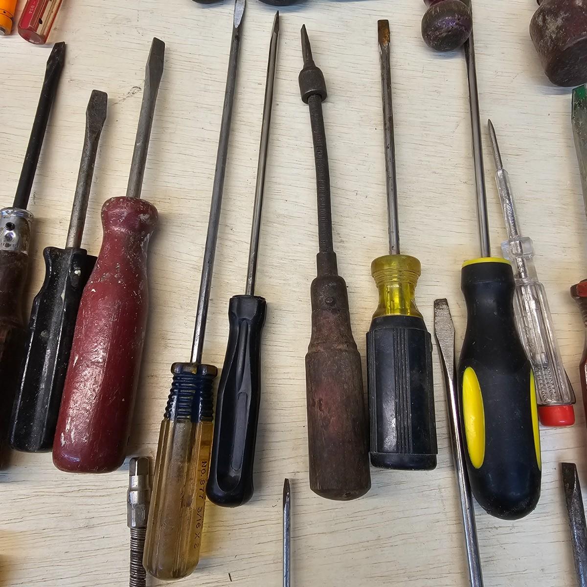 Long, short, stubby and more. Mant different brands represented here. Majority of items are flat blade, but a few Phillips as well. Some extendable magnets for picking things up. A set of bits and sockets with handle for everyday use. Longest item is 12", shortest is 2". See photos for details. Shipping available.