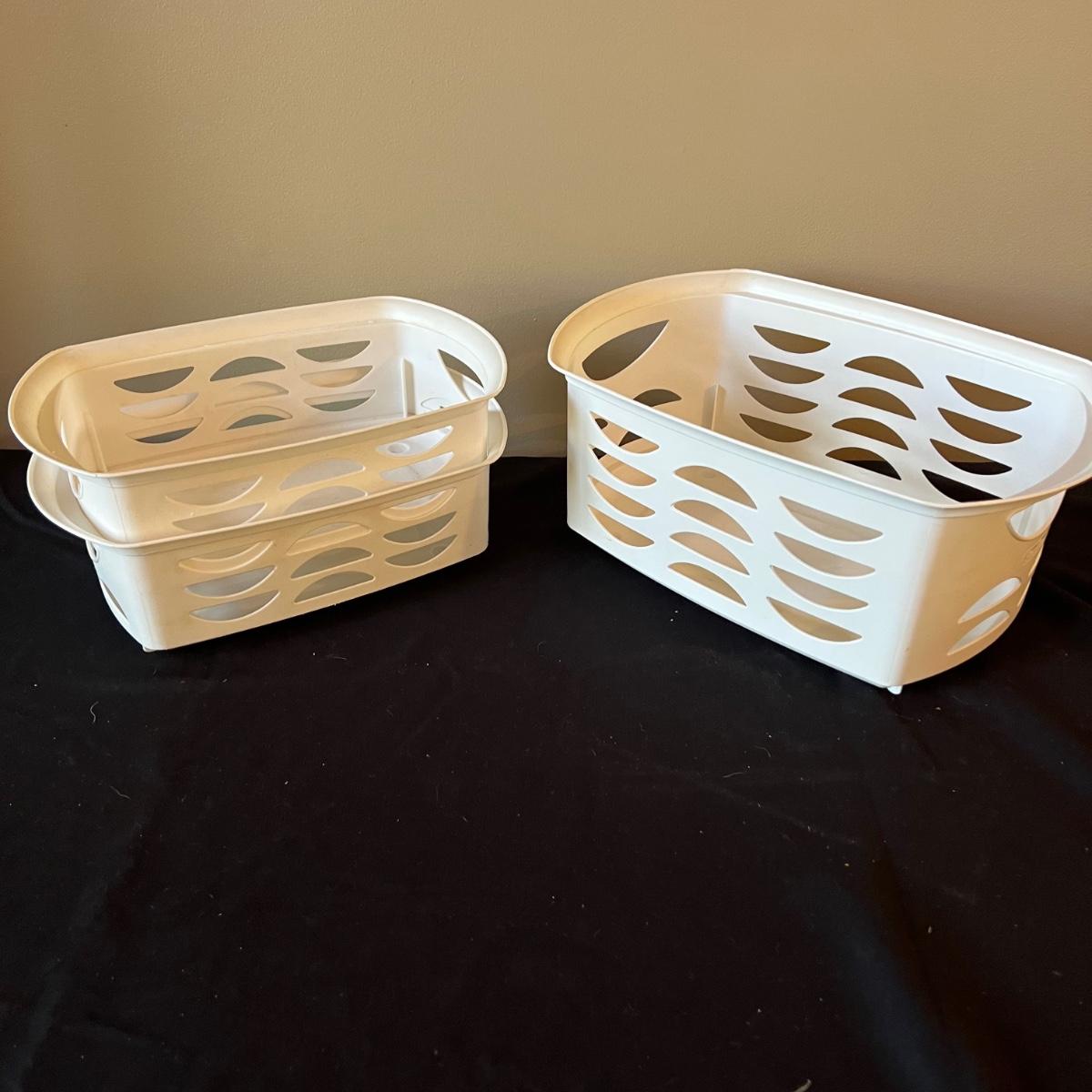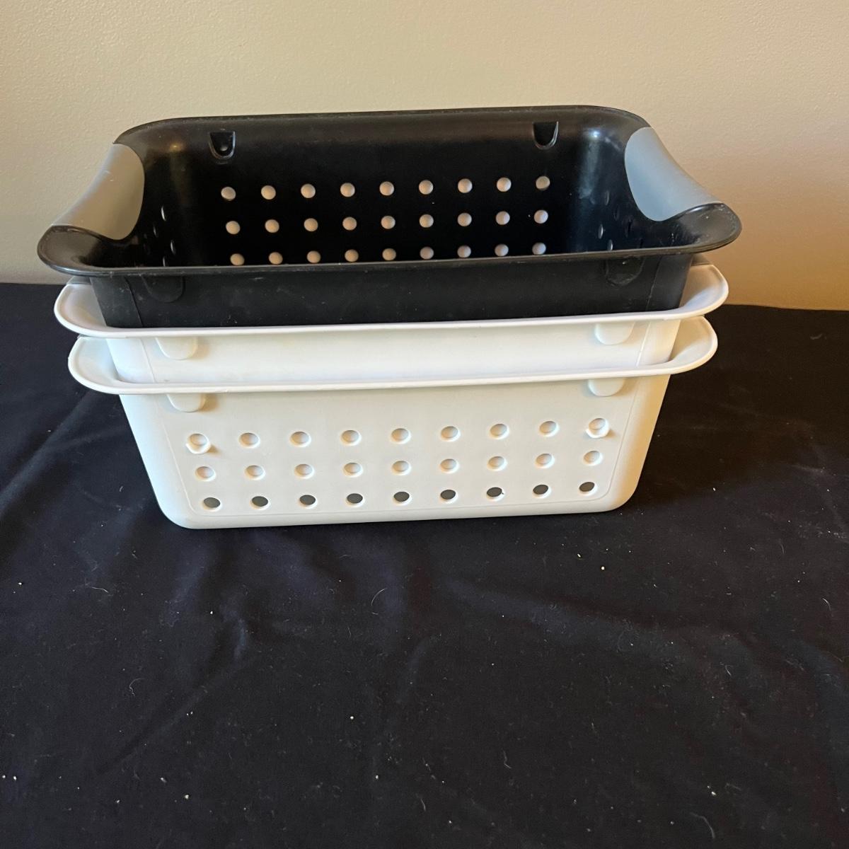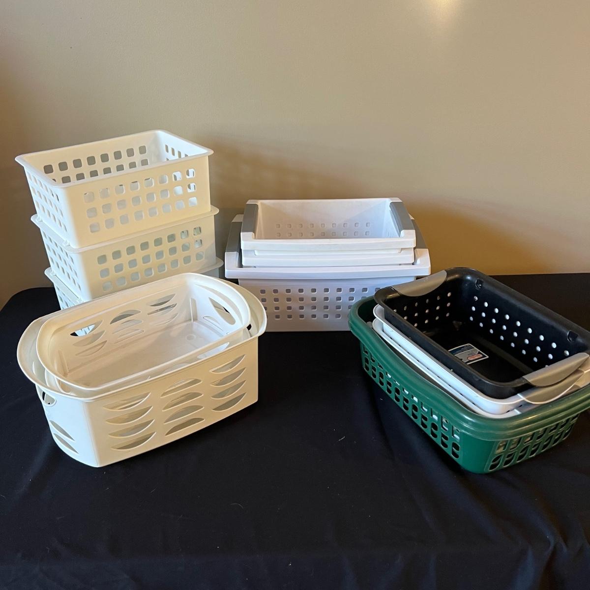 An assortment of storage bins. Several stack. Most are by Rubbermaid or Sterilite. There are 15 in all.