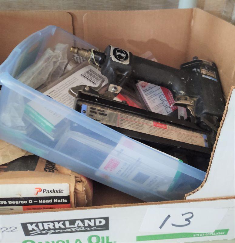 lot 13 - Campbell Hausfeld professional brad nailer, Prostrip nails, assorted other nails, etc.