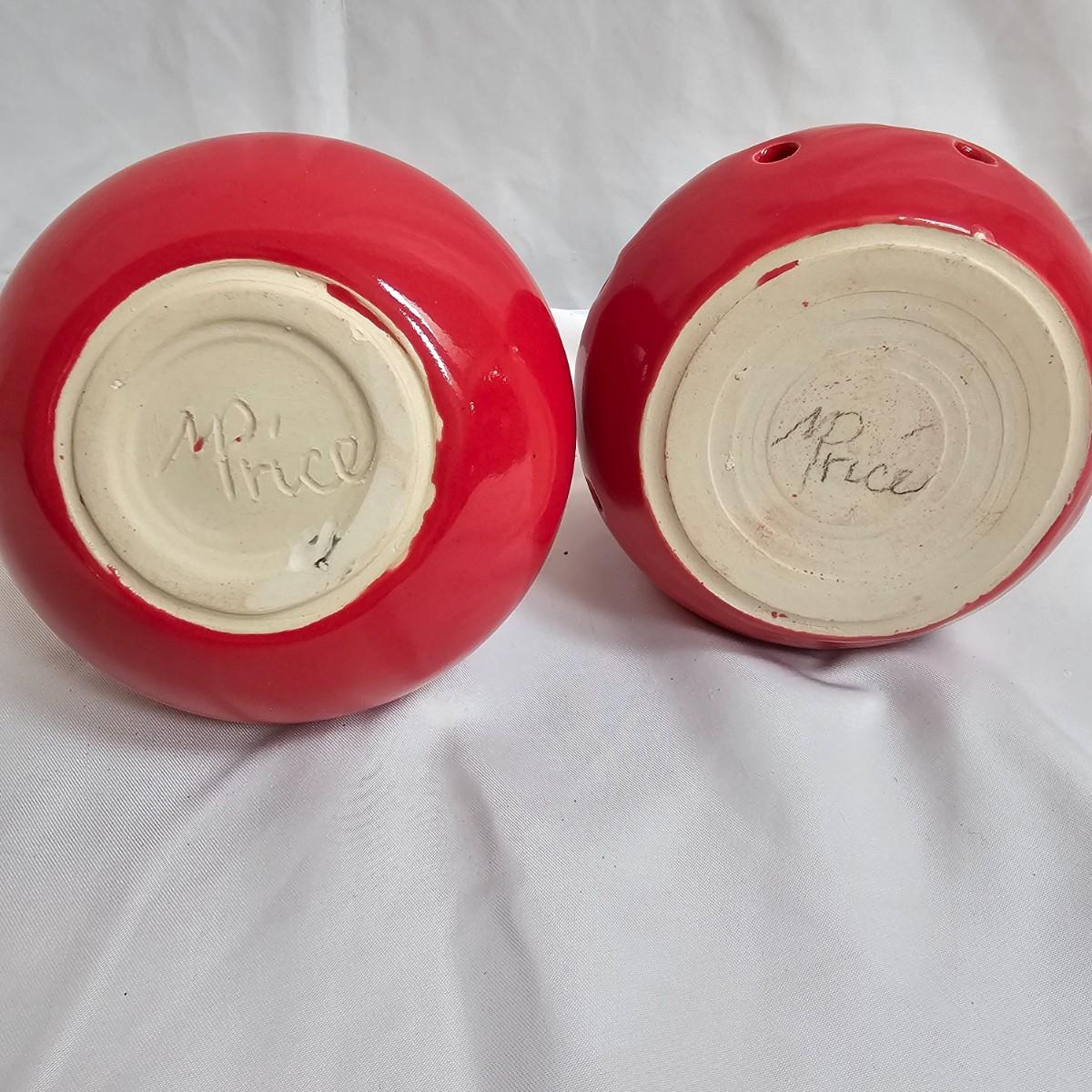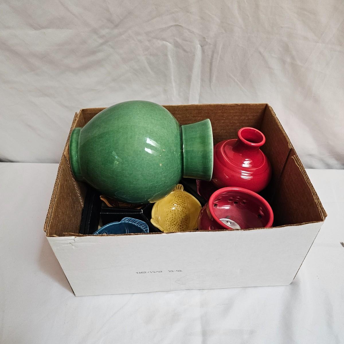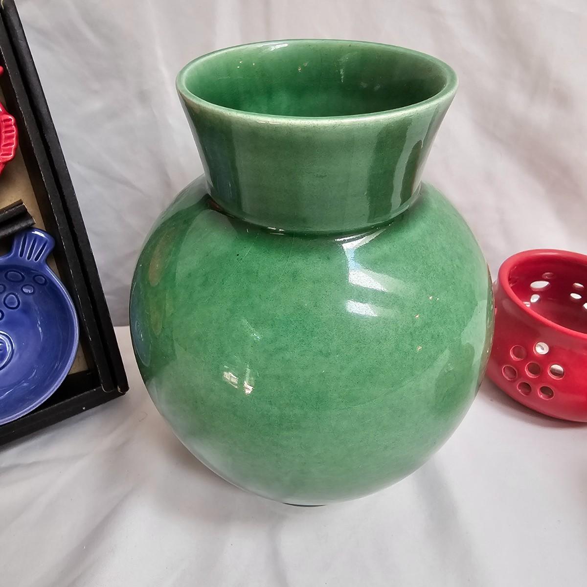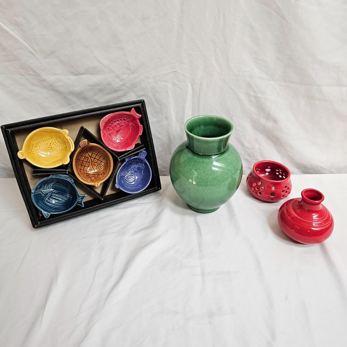 Decorative pottery pieces, a green vase, small red pot and a set of marine themed bowls. Tall green piece is 5.5" D x 7.5"H. Red round item is 3.75"D x 3.5"H, is signed N. Price. Multi color fish are all approximately 4" x 3". See photos for details. Shipping available.