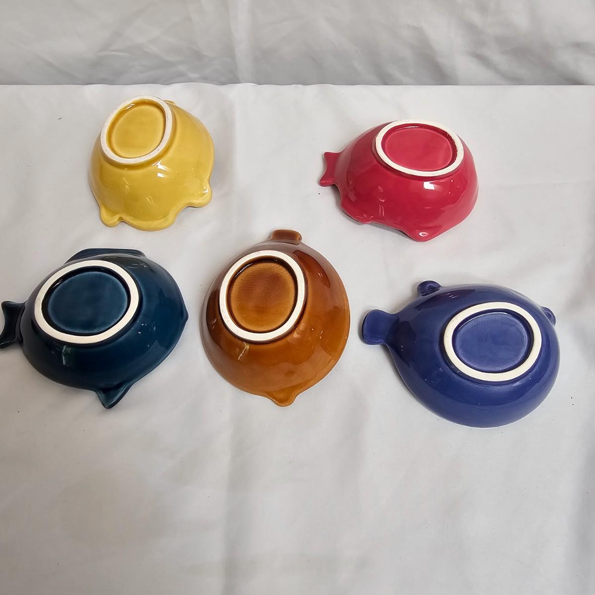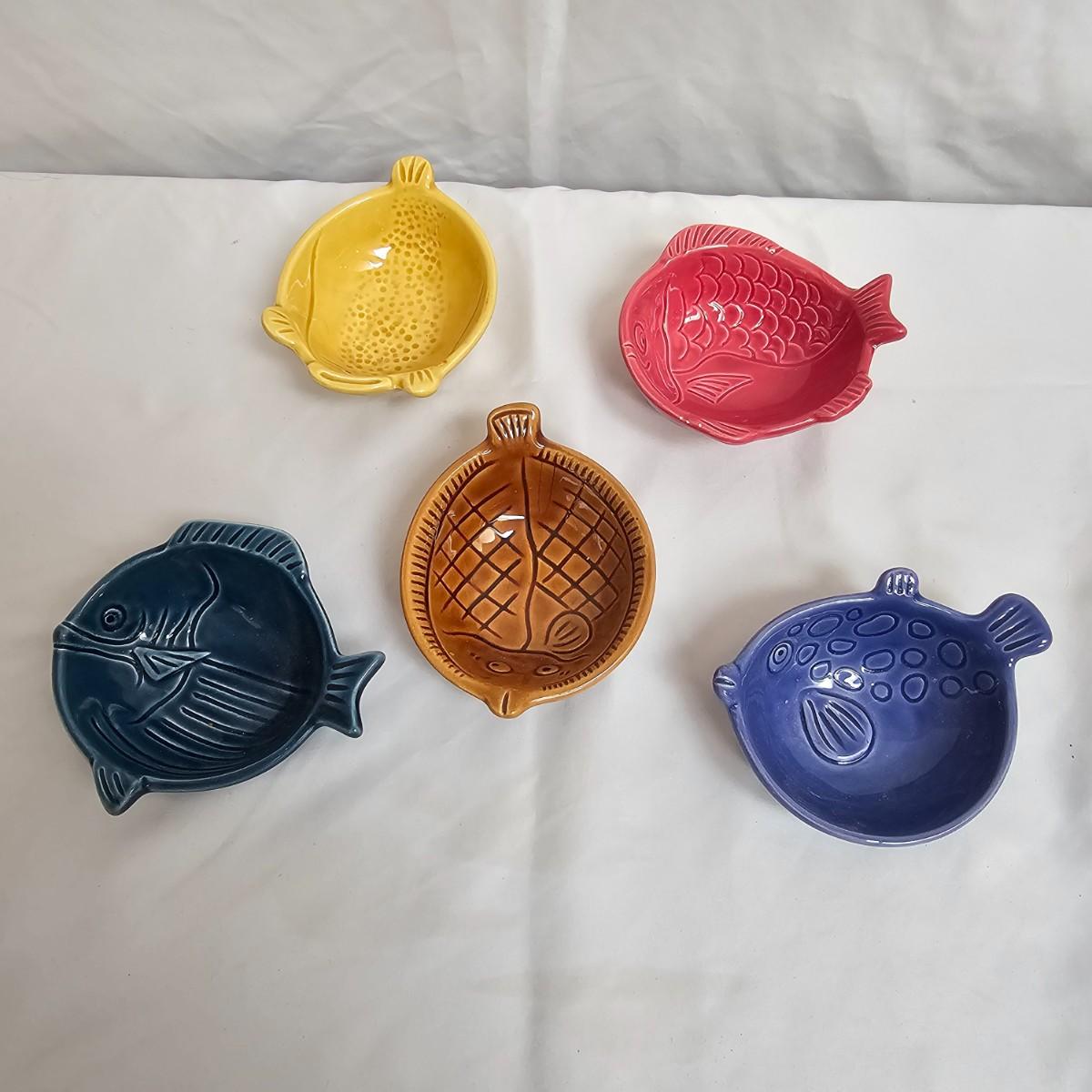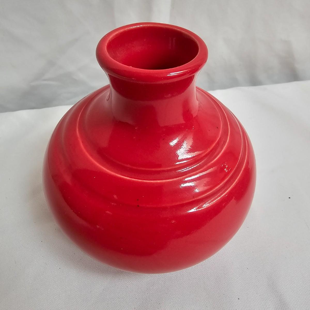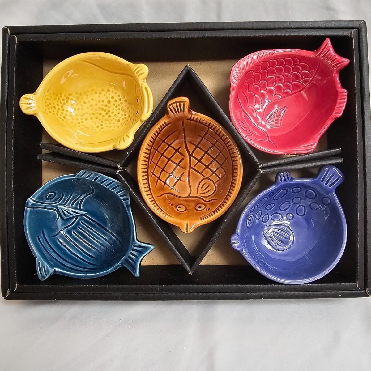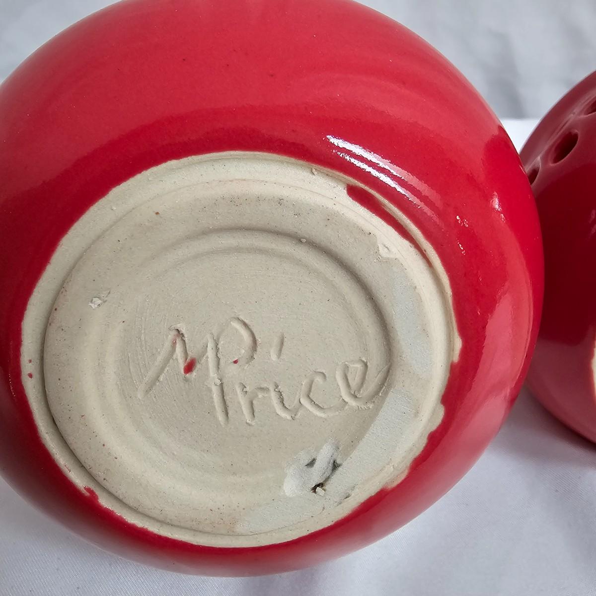 Decorative pottery pieces, a green vase, small red pot and a set of marine themed bowls. Tall green piece is 5.5" D x 7.5"H. Red round item is 3.75"D x 3.5"H, is signed N. Price. Multi color fish are all approximately 4" x 3". See photos for details. Shipping available.
