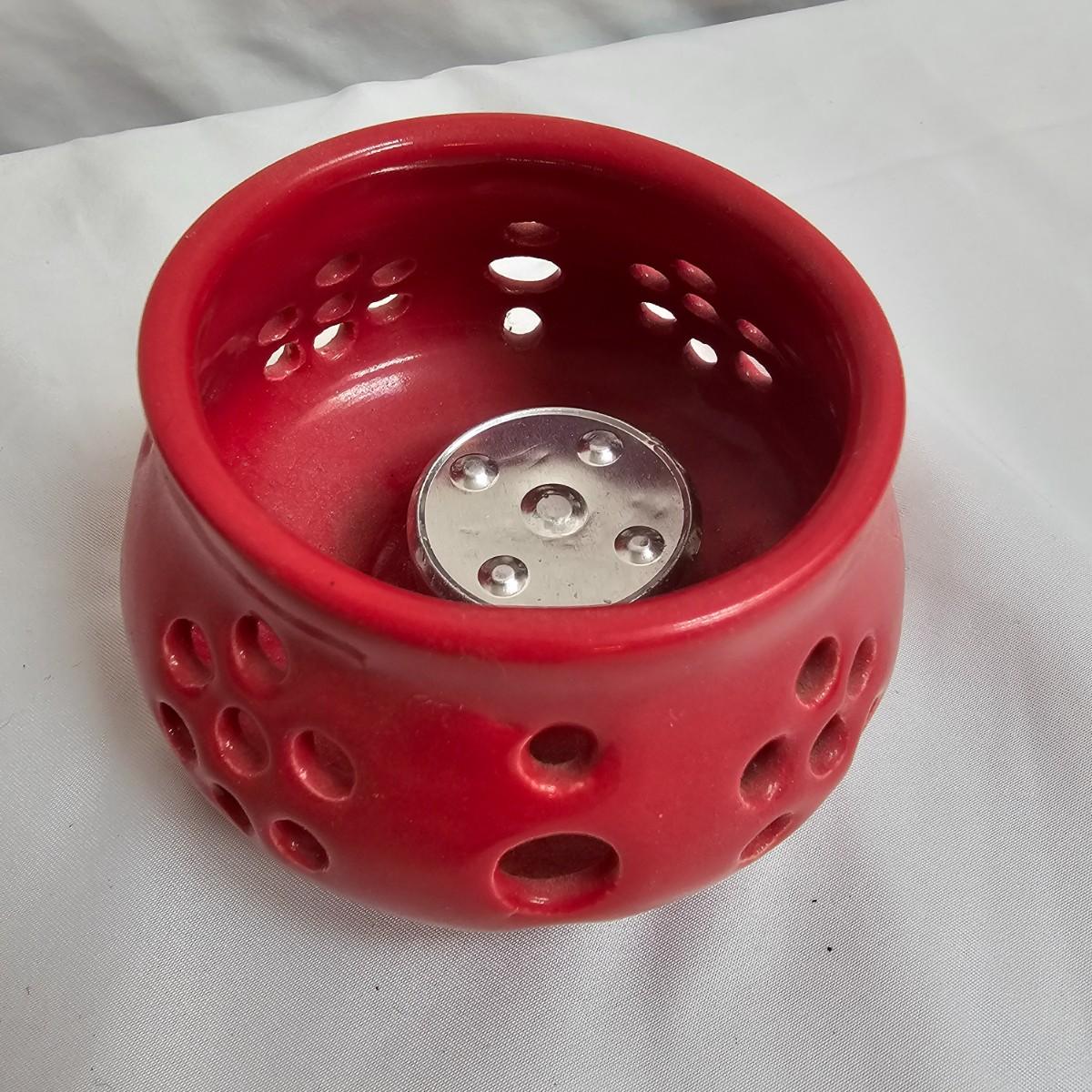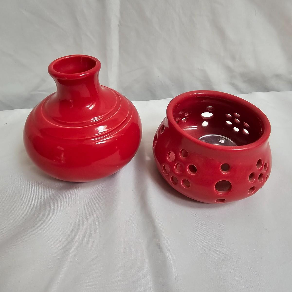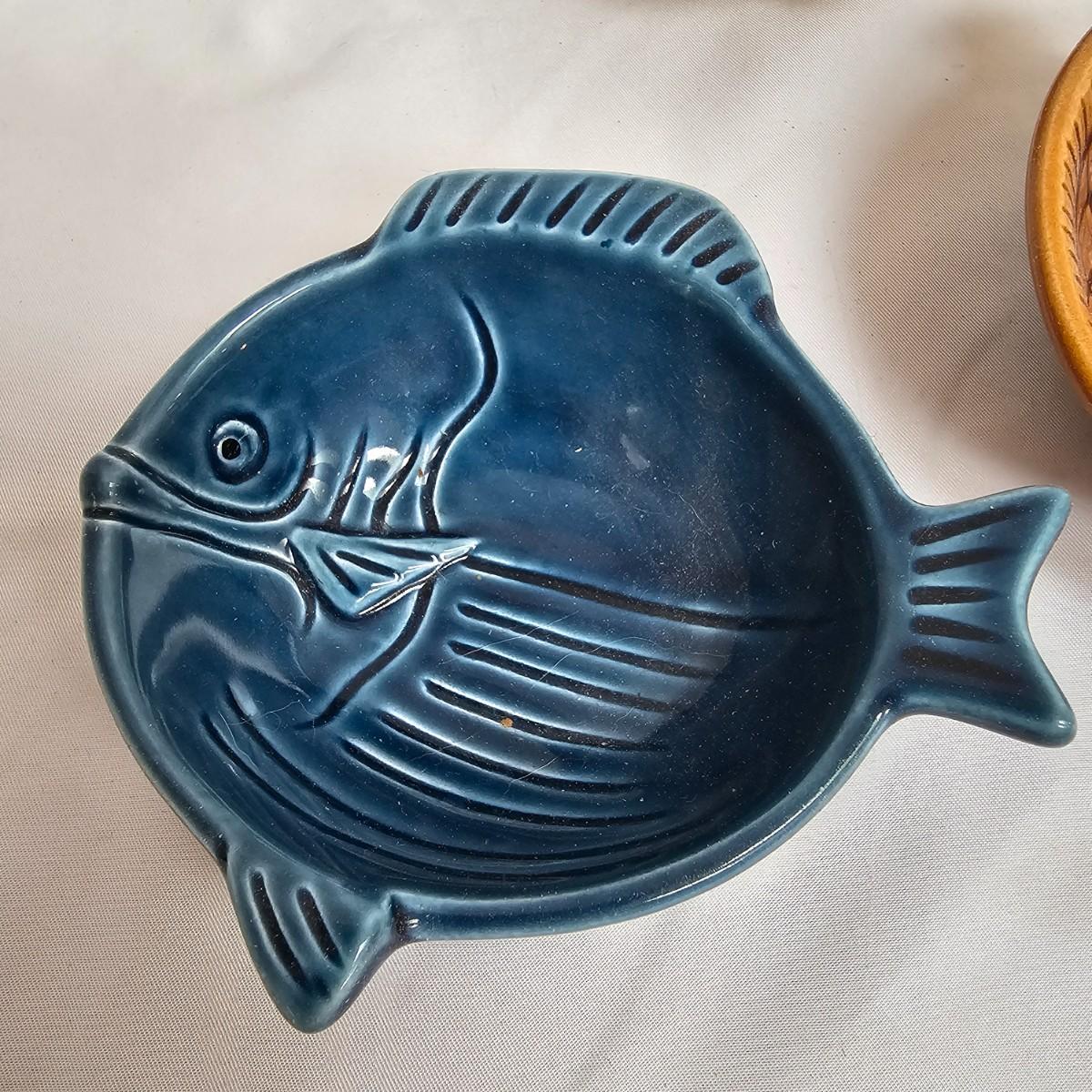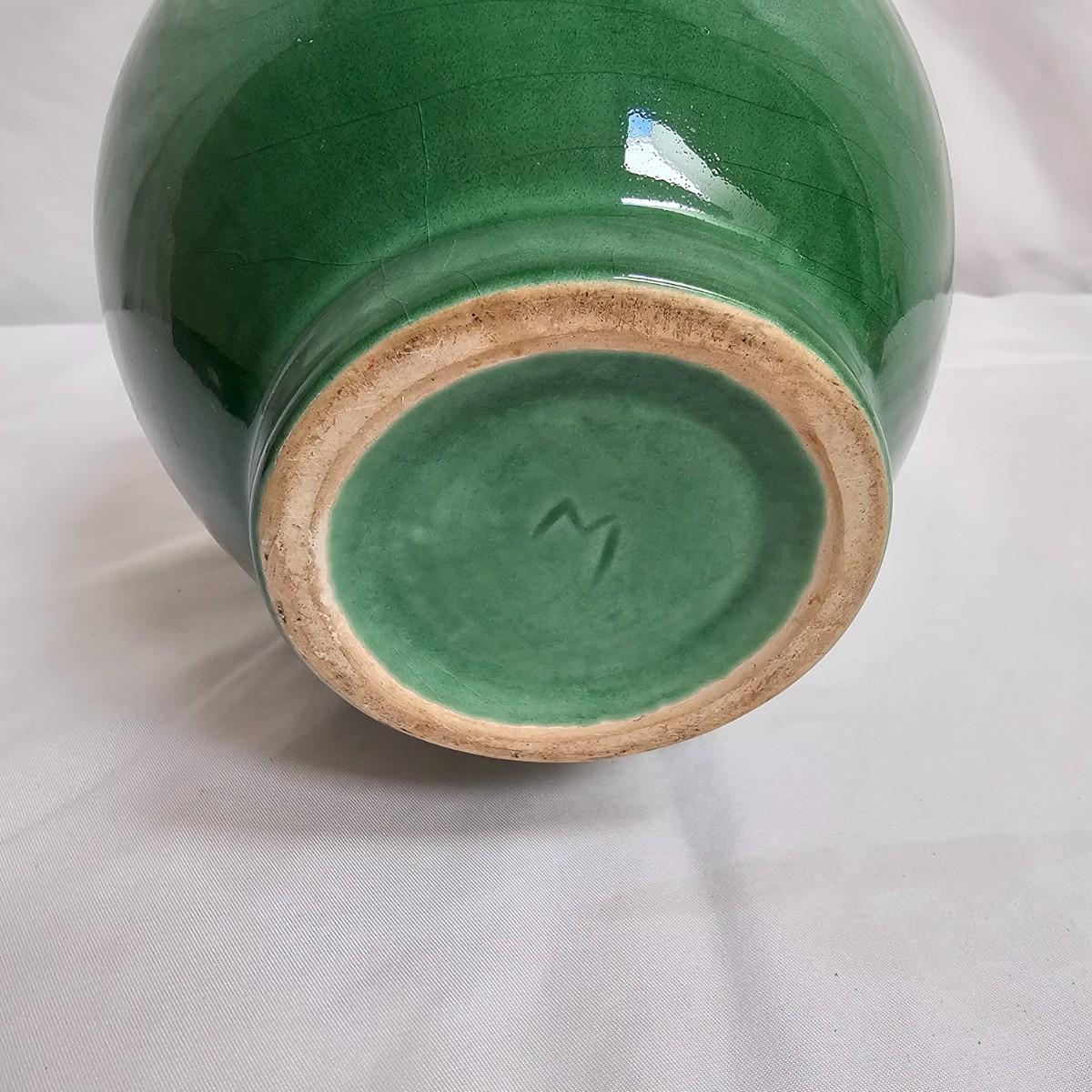 Decorative pottery pieces, a green vase, small red pot and a set of marine themed bowls. Tall green piece is 5.5" D x 7.5"H. Red round item is 3.75"D x 3.5"H, is signed N. Price. Multi color fish are all approximately 4" x 3". See photos for details. Shipping available.