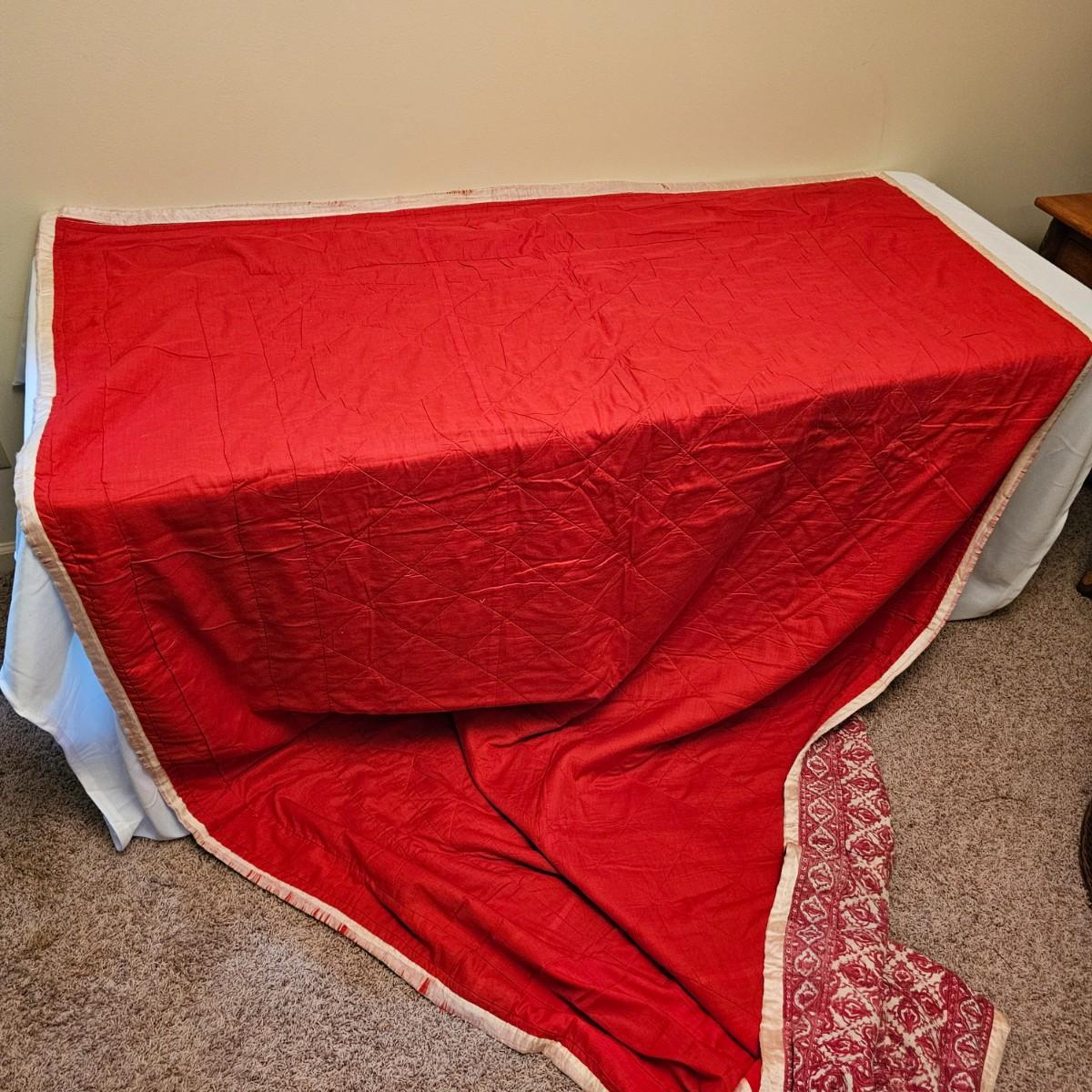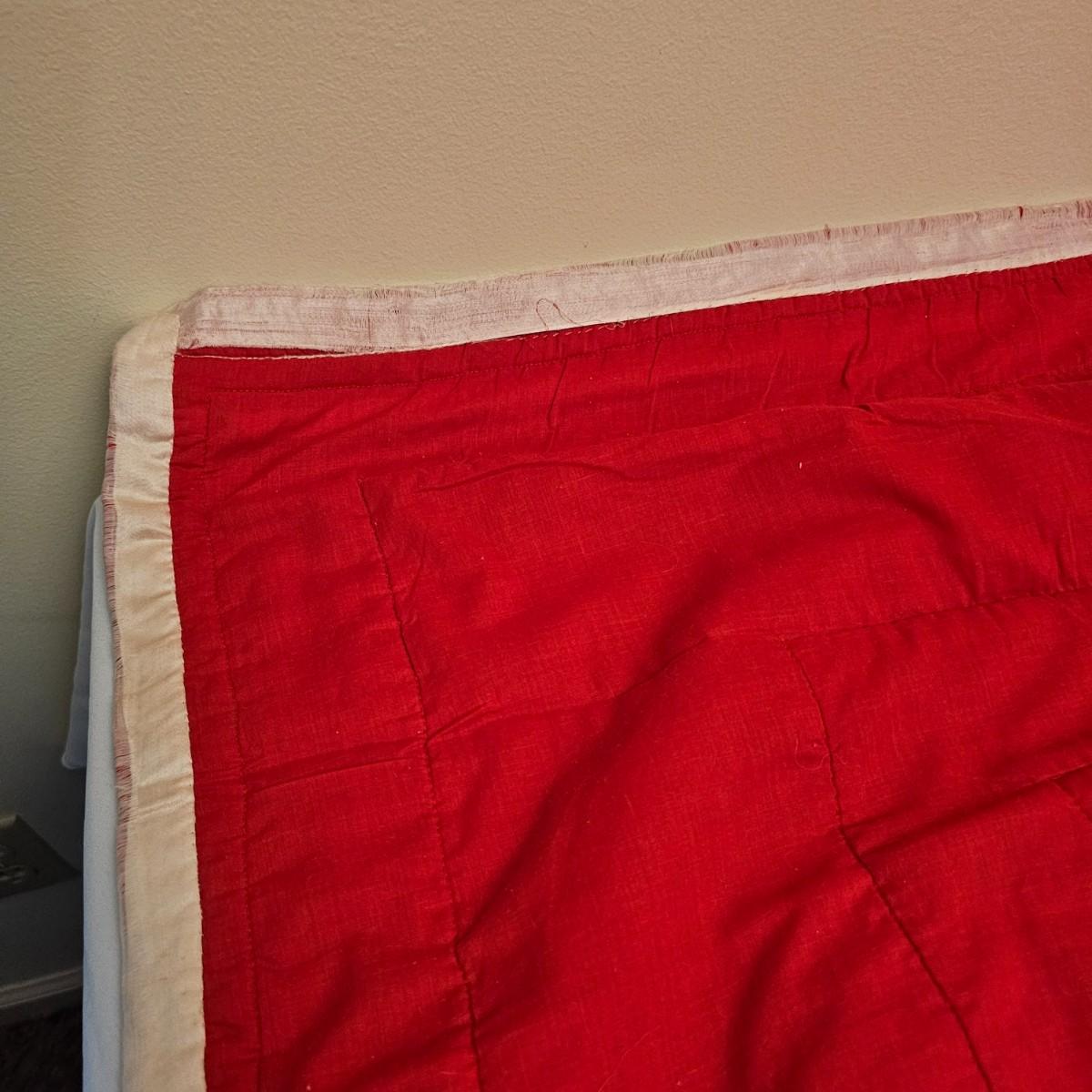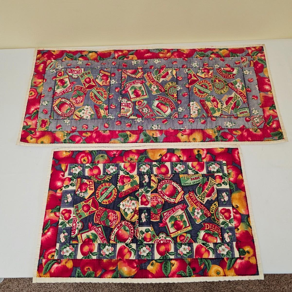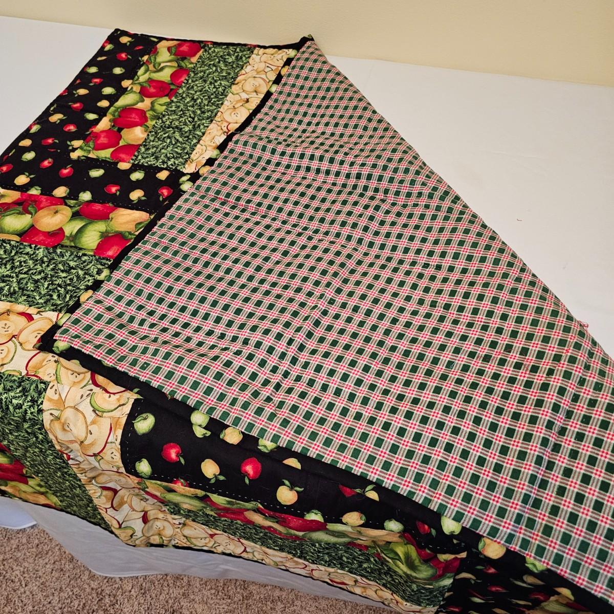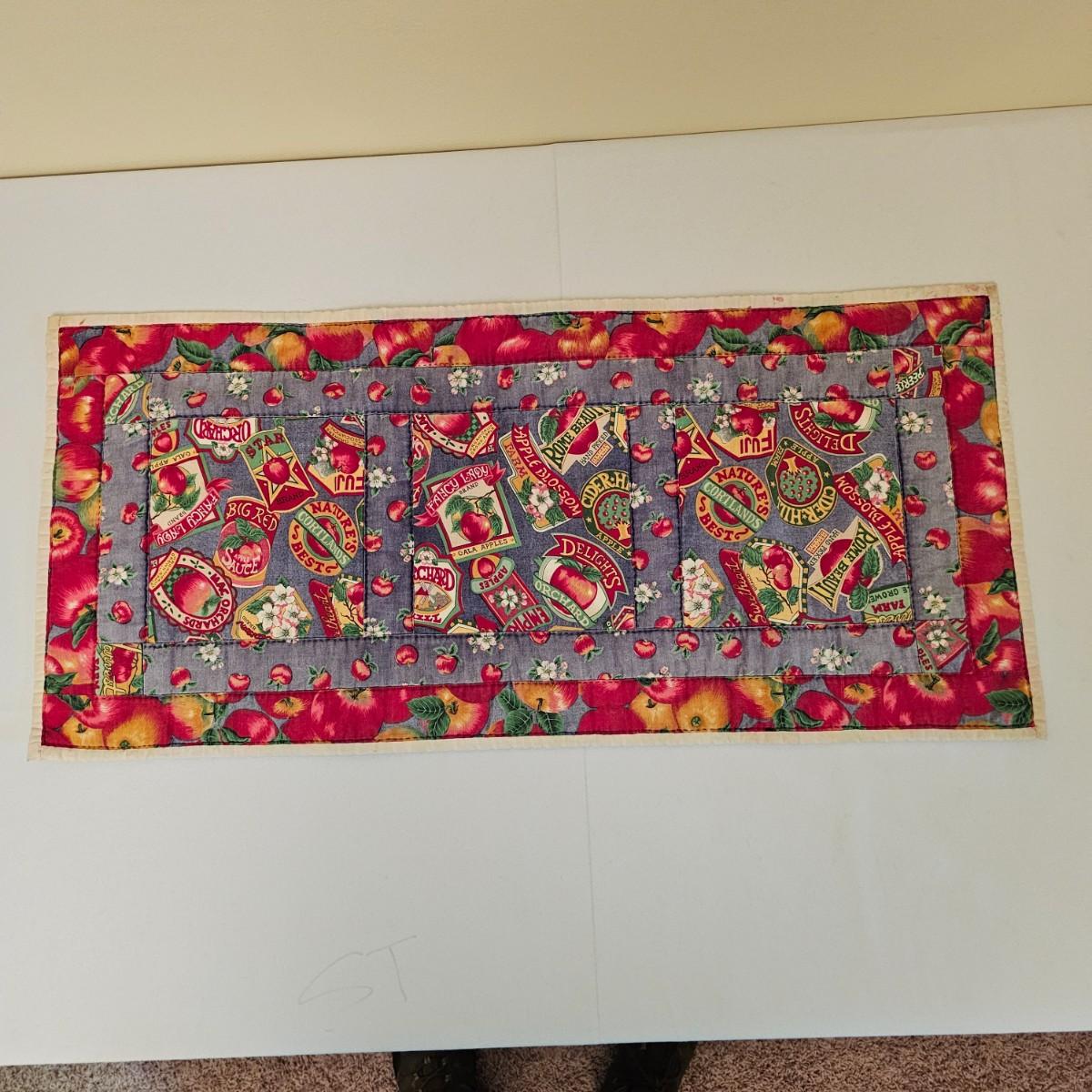 A rainbow of colors represents itself in these novel quilts and wall hangers. All sizes and shapes. Red/white squares piece is 36" x 46", has knotted ties at the corners. The four squares item is 39" x 54". Rag edge piece is 32"Sq, and the apples themed one is 41"Sq. Santa measures up at 22.5" x 27.5". Apple runner is 31.5" x 14.5", has some spotting on edges. Placemat is 22.5" x 14". Larger pink quilt, sometimes referred to as a 'cutter' to be used for pieces on other projects. Significant ragging on edges, this item measures 72" x 82". The large red floral piece is 66" x 102". Has some faded and worn spots on edges. Lastly is the quilt rack with cutout heart motif and removable hanging bar. Measures 46" x 5" x 11"H. All items used. See photos for details. Local pickup only.