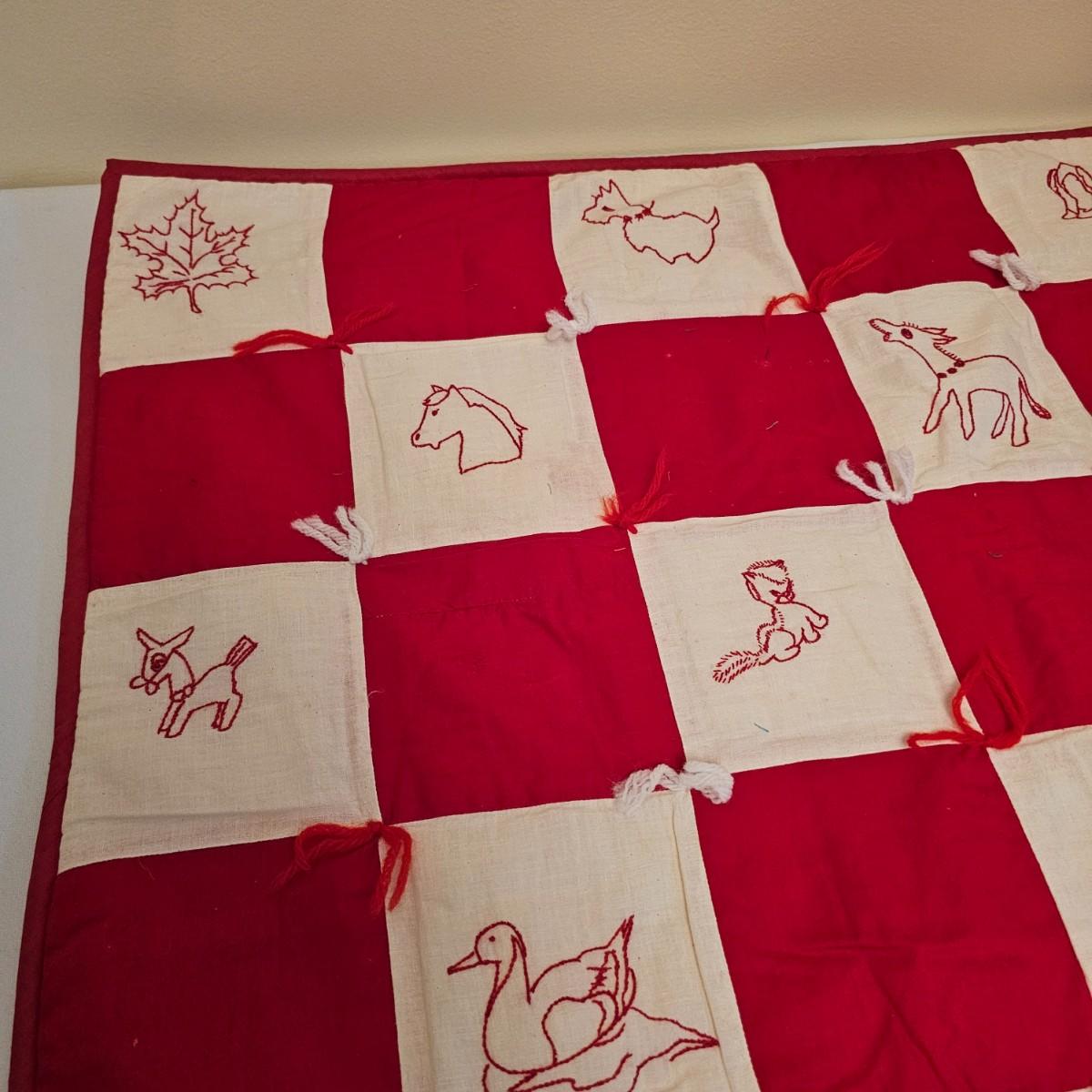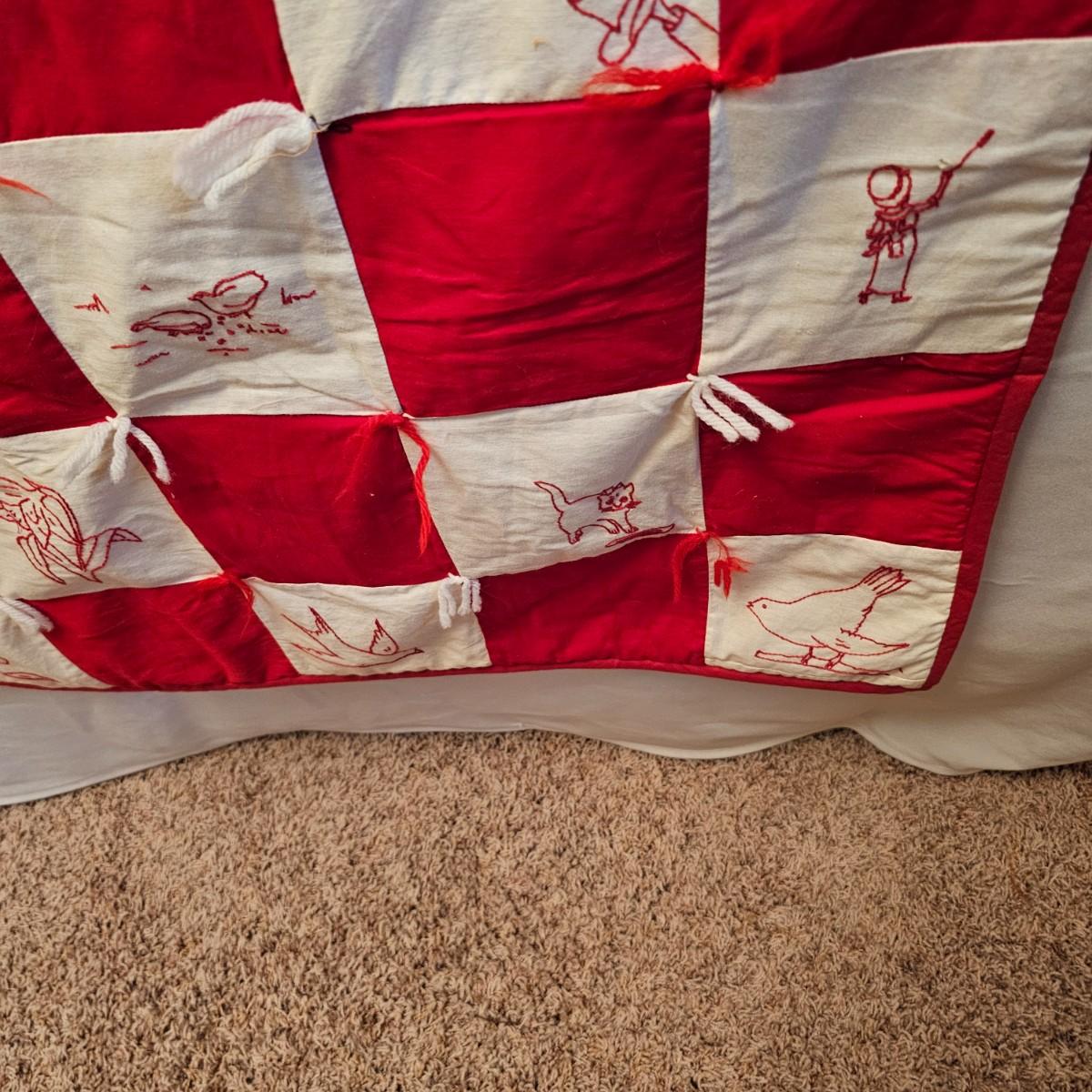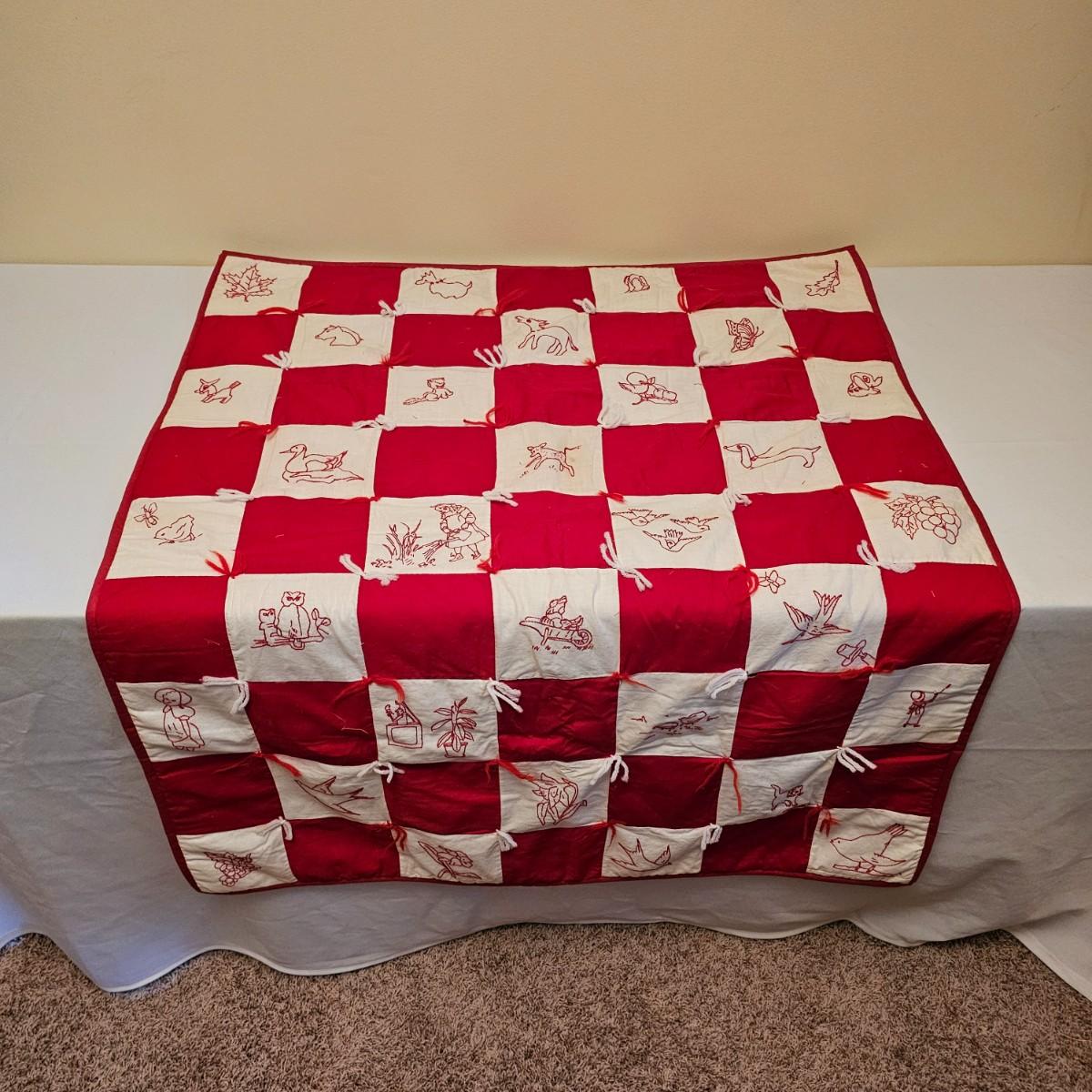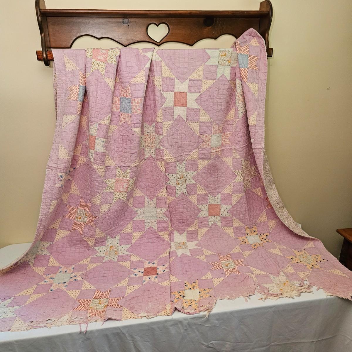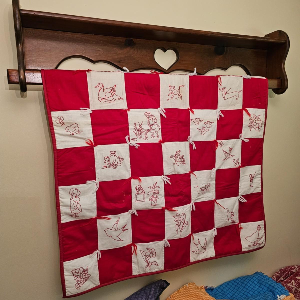 A rainbow of colors represents itself in these novel quilts and wall hangers. All sizes and shapes. Red/white squares piece is 36" x 46", has knotted ties at the corners. The four squares item is 39" x 54". Rag edge piece is 32"Sq, and the apples themed one is 41"Sq. Santa measures up at 22.5" x 27.5". Apple runner is 31.5" x 14.5", has some spotting on edges. Placemat is 22.5" x 14". Larger pink quilt, sometimes referred to as a 'cutter' to be used for pieces on other projects. Significant ragging on edges, this item measures 72" x 82". The large red floral piece is 66" x 102". Has some faded and worn spots on edges. Lastly is the quilt rack with cutout heart motif and removable hanging bar. Measures 46" x 5" x 11"H. All items used. See photos for details. Local pickup only.