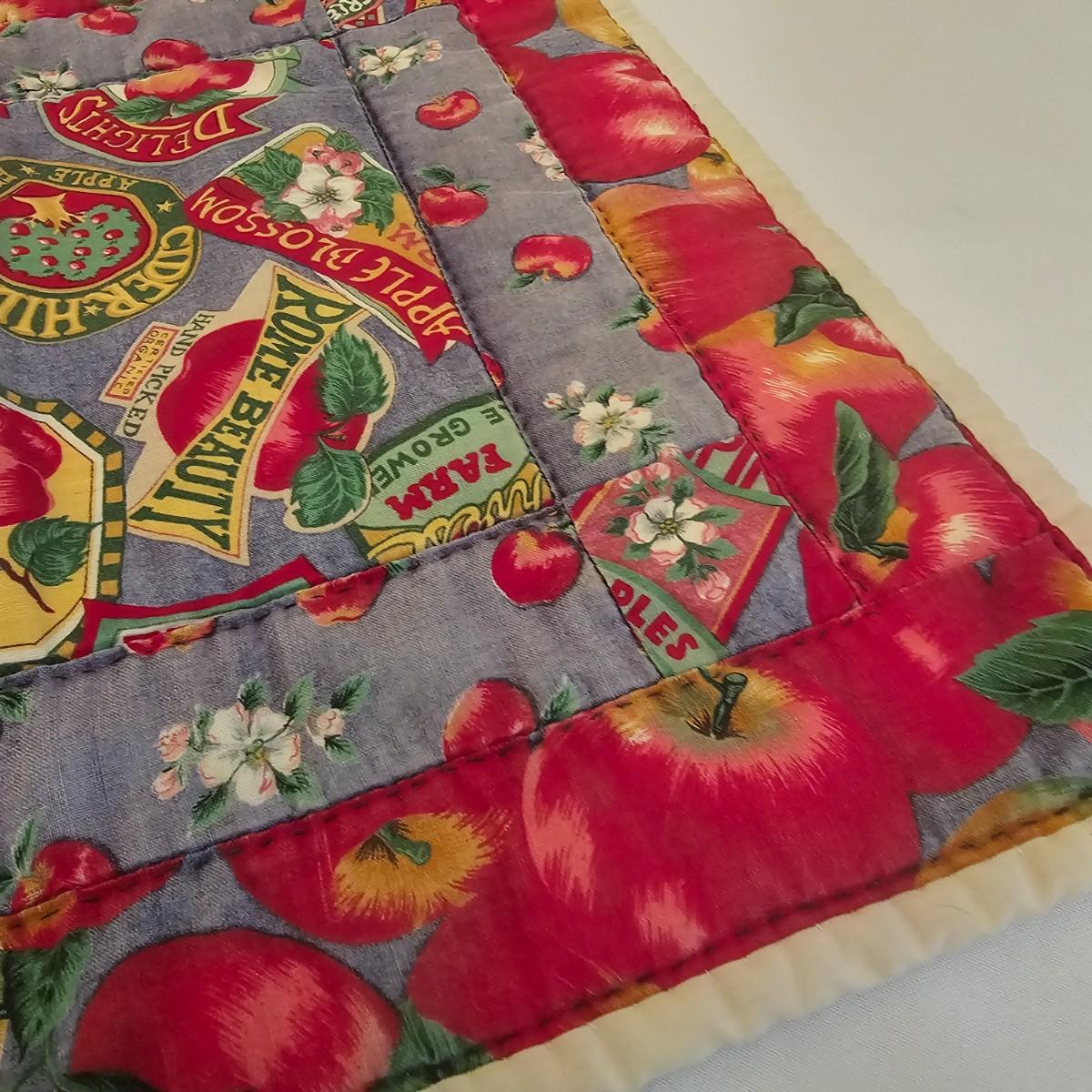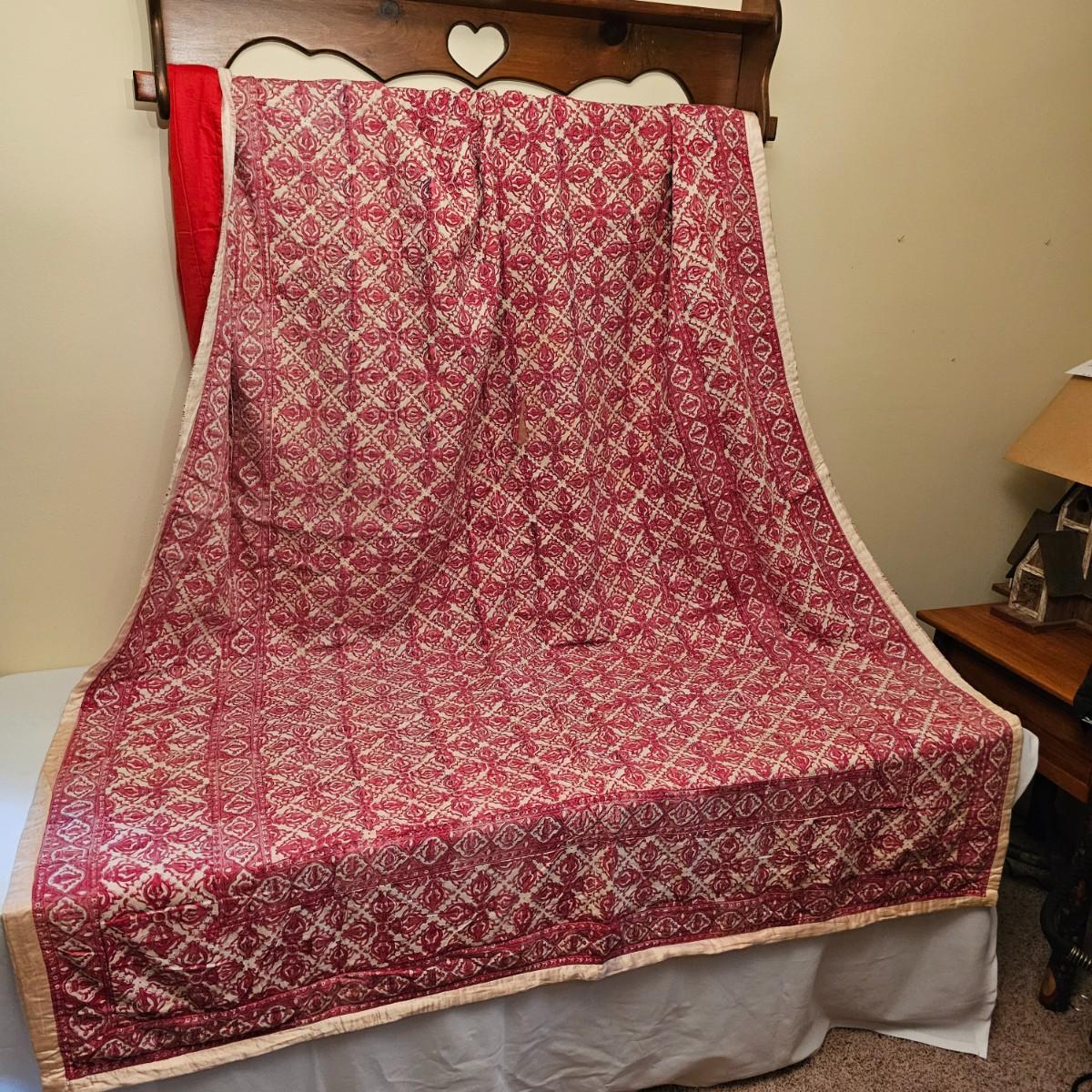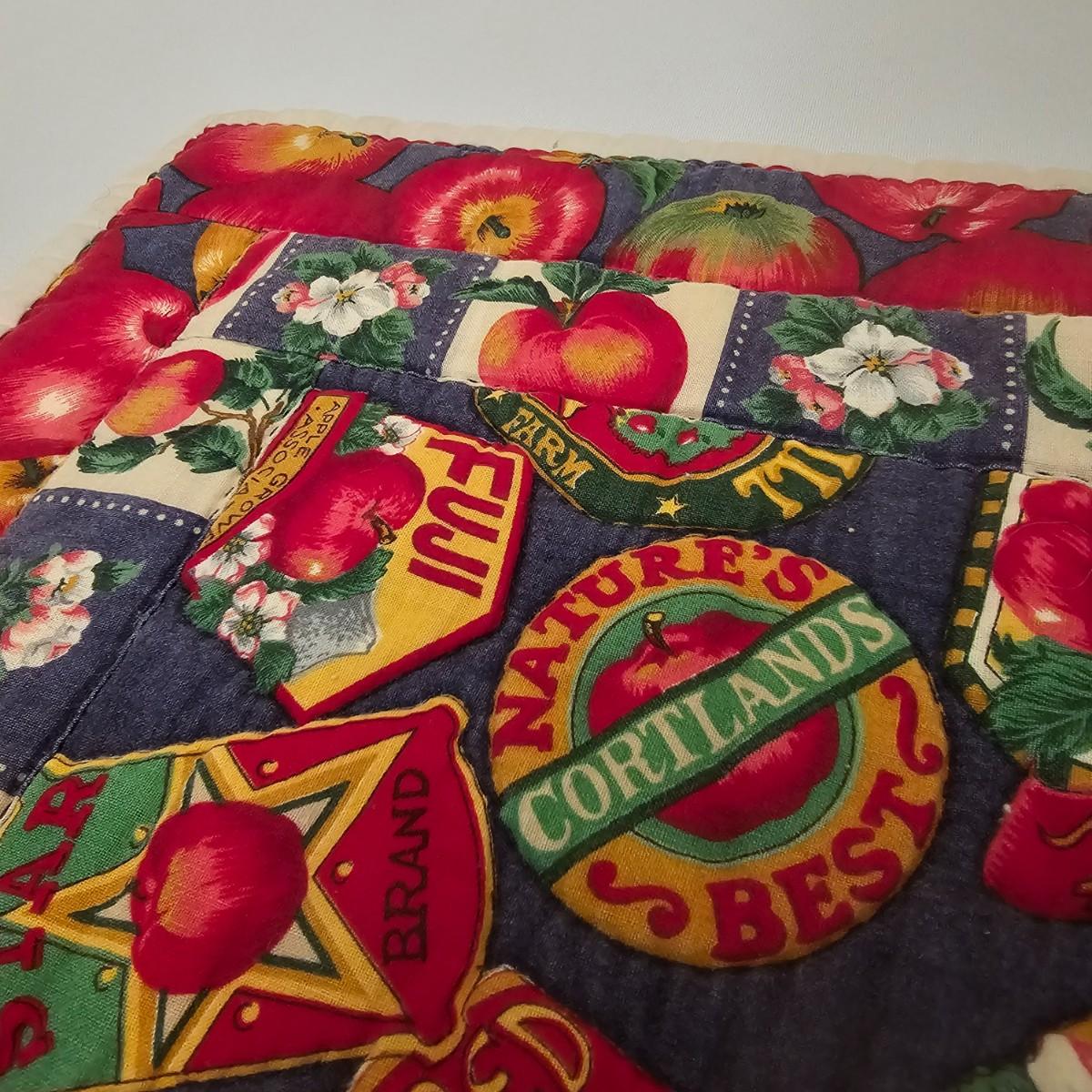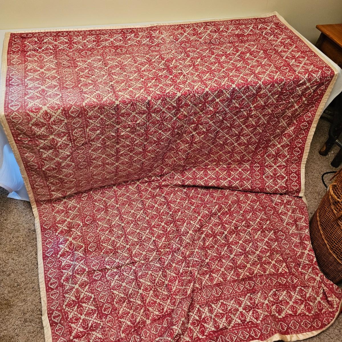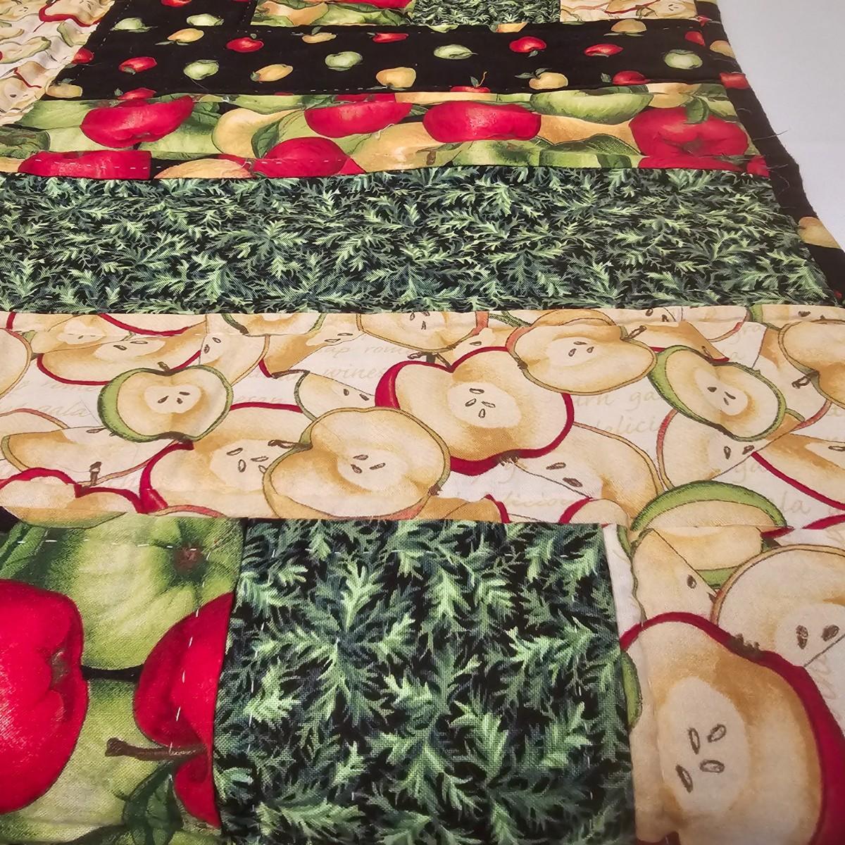 A rainbow of colors represents itself in these novel quilts and wall hangers. All sizes and shapes. Red/white squares piece is 36" x 46", has knotted ties at the corners. The four squares item is 39" x 54". Rag edge piece is 32"Sq, and the apples themed one is 41"Sq. Santa measures up at 22.5" x 27.5". Apple runner is 31.5" x 14.5", has some spotting on edges. Placemat is 22.5" x 14". Larger pink quilt, sometimes referred to as a 'cutter' to be used for pieces on other projects. Significant ragging on edges, this item measures 72" x 82". The large red floral piece is 66" x 102". Has some faded and worn spots on edges. Lastly is the quilt rack with cutout heart motif and removable hanging bar. Measures 46" x 5" x 11"H. All items used. See photos for details. Local pickup only.