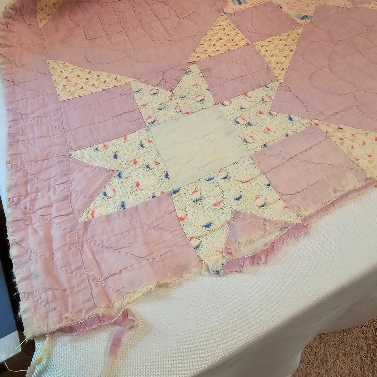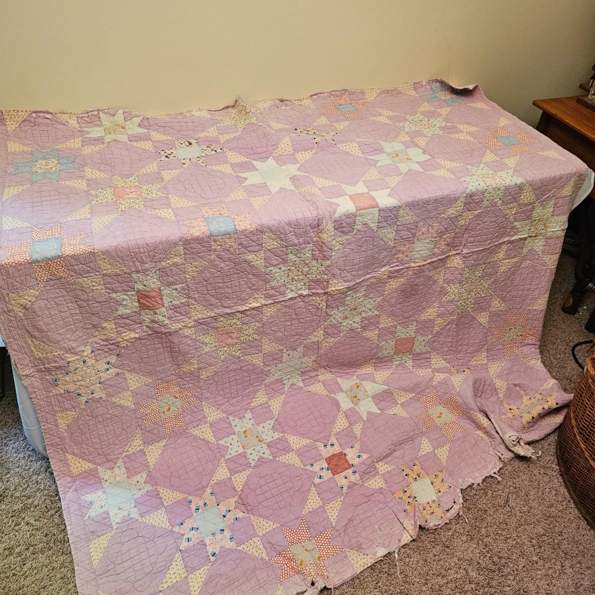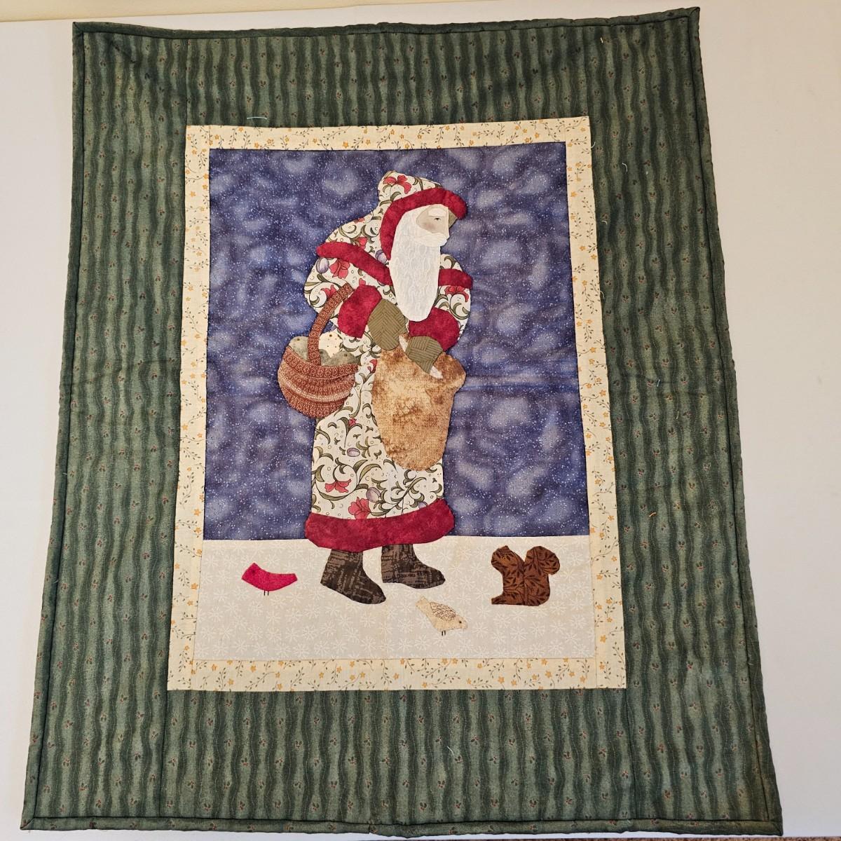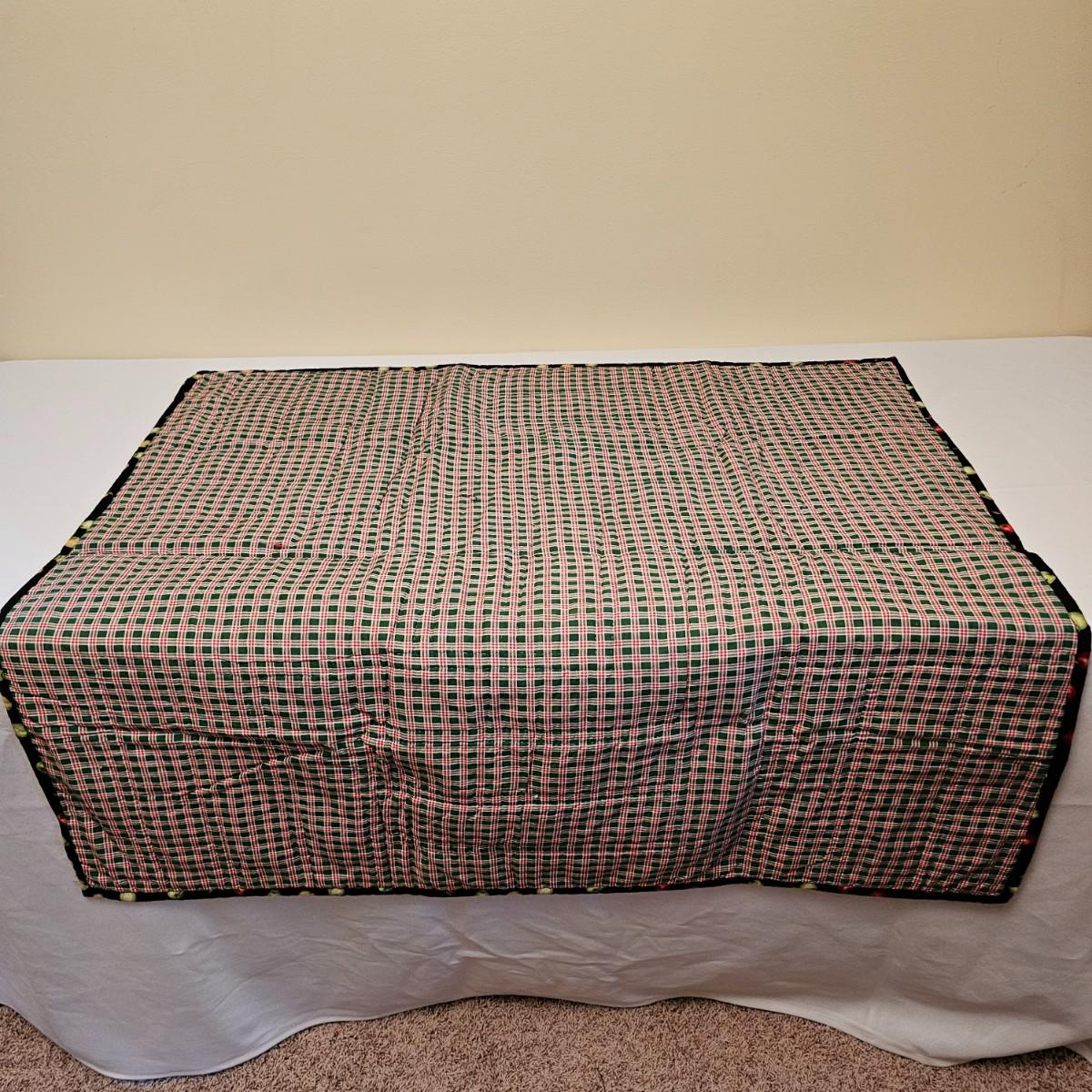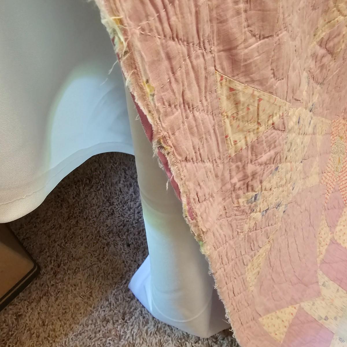 A rainbow of colors represents itself in these novel quilts and wall hangers. All sizes and shapes. Red/white squares piece is 36" x 46", has knotted ties at the corners. The four squares item is 39" x 54". Rag edge piece is 32"Sq, and the apples themed one is 41"Sq. Santa measures up at 22.5" x 27.5". Apple runner is 31.5" x 14.5", has some spotting on edges. Placemat is 22.5" x 14". Larger pink quilt, sometimes referred to as a 'cutter' to be used for pieces on other projects. Significant ragging on edges, this item measures 72" x 82". The large red floral piece is 66" x 102". Has some faded and worn spots on edges. Lastly is the quilt rack with cutout heart motif and removable hanging bar. Measures 46" x 5" x 11"H. All items used. See photos for details. Local pickup only.