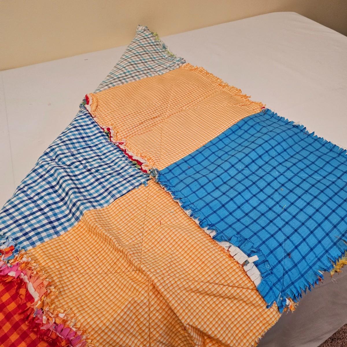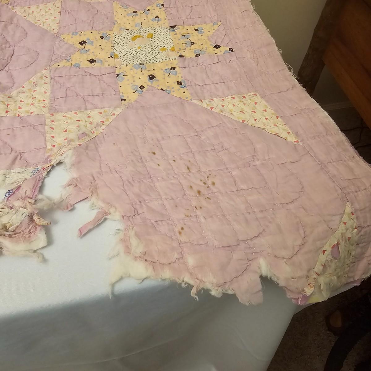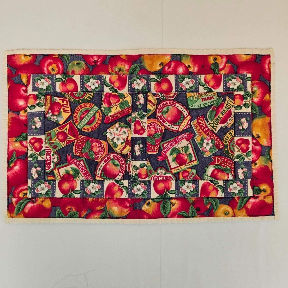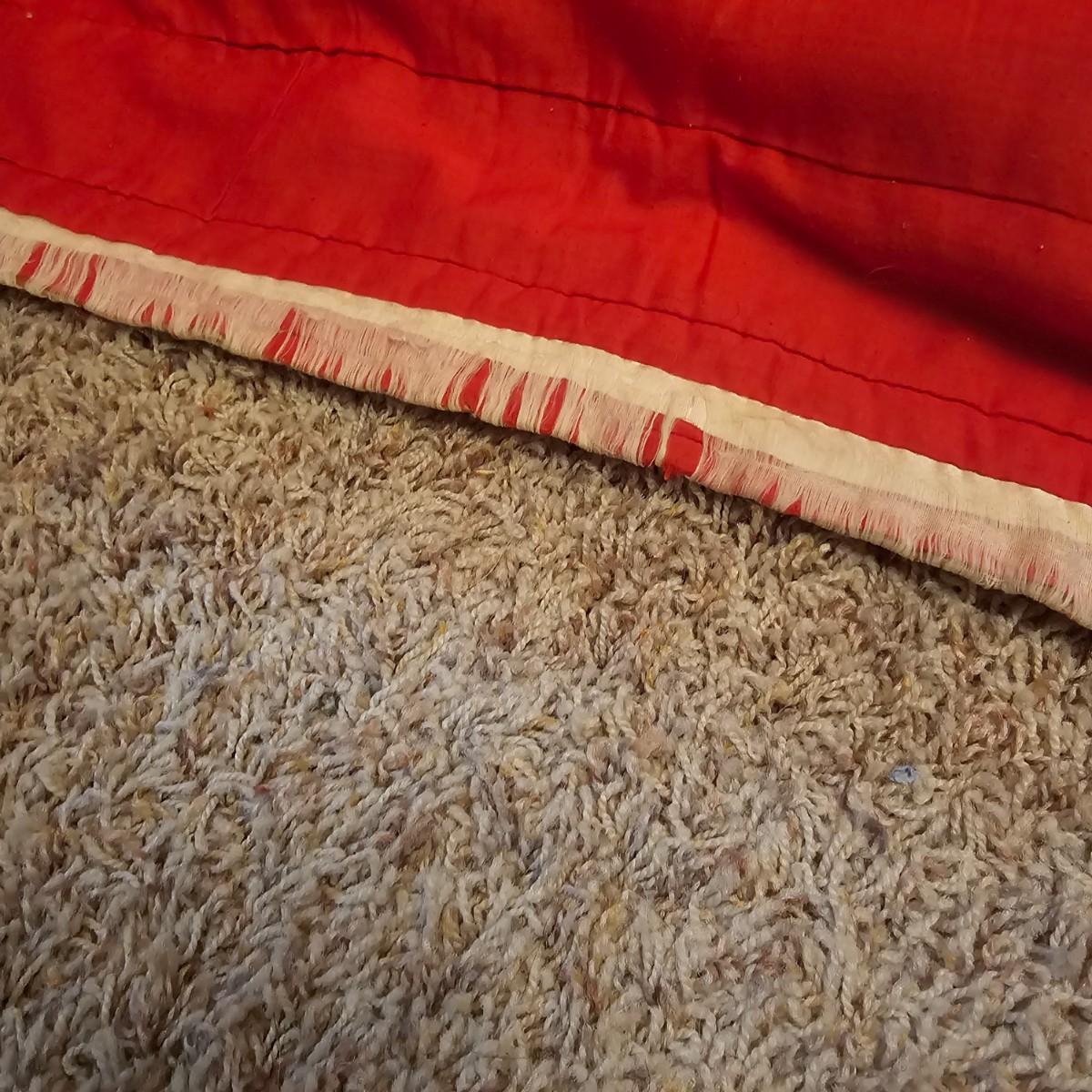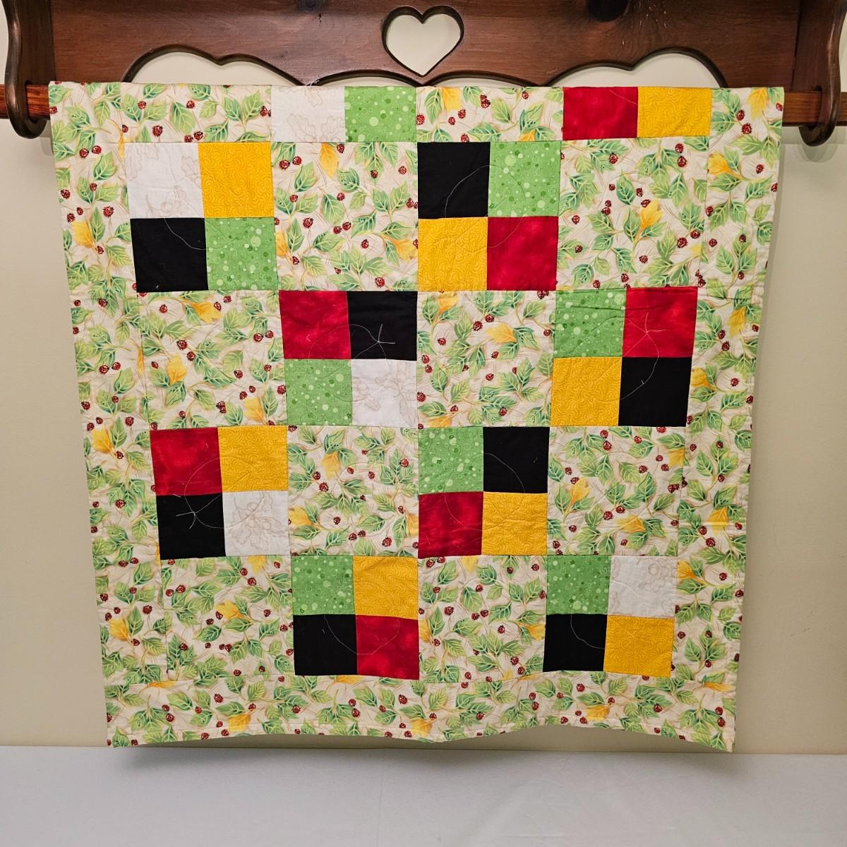 A rainbow of colors represents itself in these novel quilts and wall hangers. All sizes and shapes. Red/white squares piece is 36" x 46", has knotted ties at the corners. The four squares item is 39" x 54". Rag edge piece is 32"Sq, and the apples themed one is 41"Sq. Santa measures up at 22.5" x 27.5". Apple runner is 31.5" x 14.5", has some spotting on edges. Placemat is 22.5" x 14". Larger pink quilt, sometimes referred to as a 'cutter' to be used for pieces on other projects. Significant ragging on edges, this item measures 72" x 82". The large red floral piece is 66" x 102". Has some faded and worn spots on edges. Lastly is the quilt rack with cutout heart motif and removable hanging bar. Measures 46" x 5" x 11"H. All items used. See photos for details. Local pickup only.