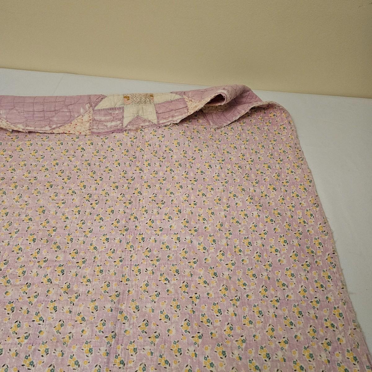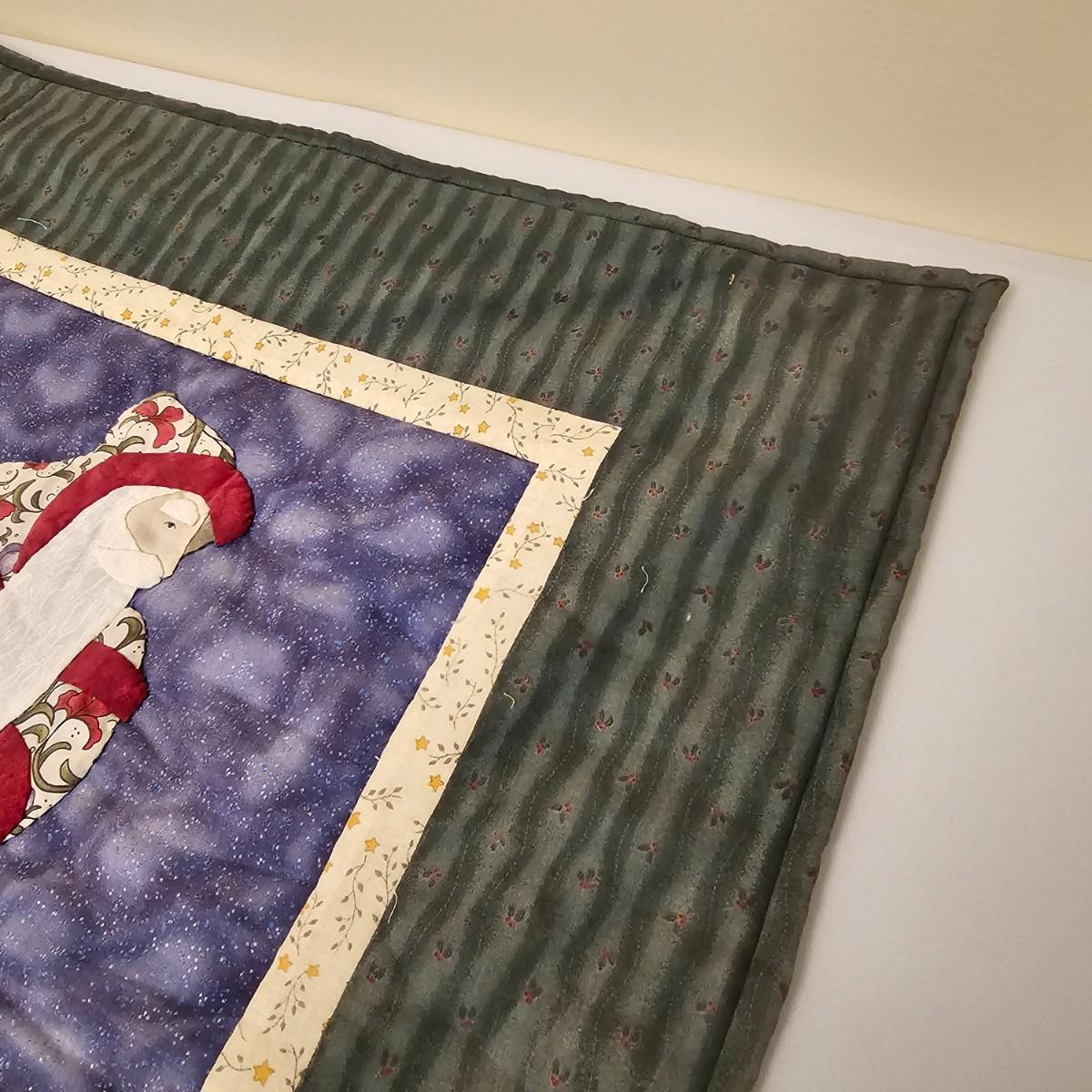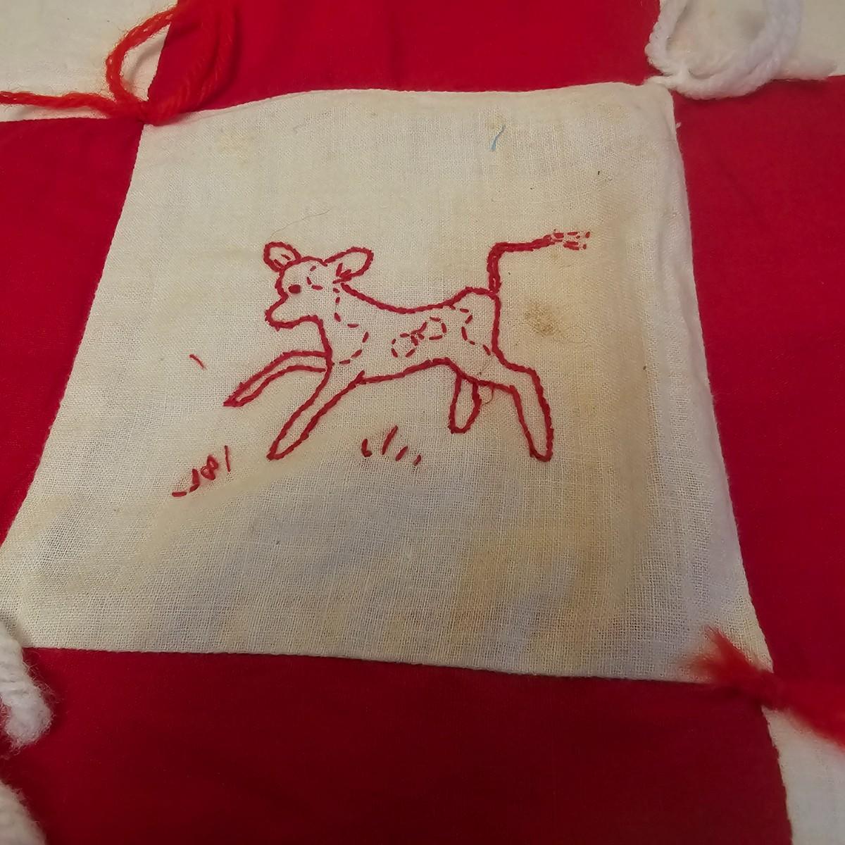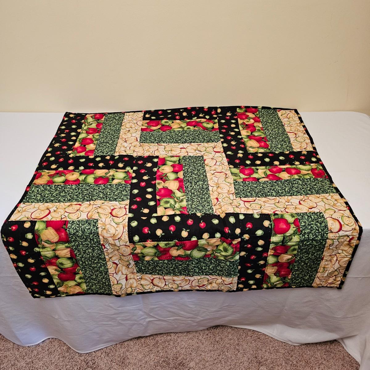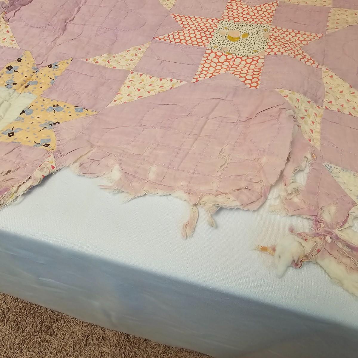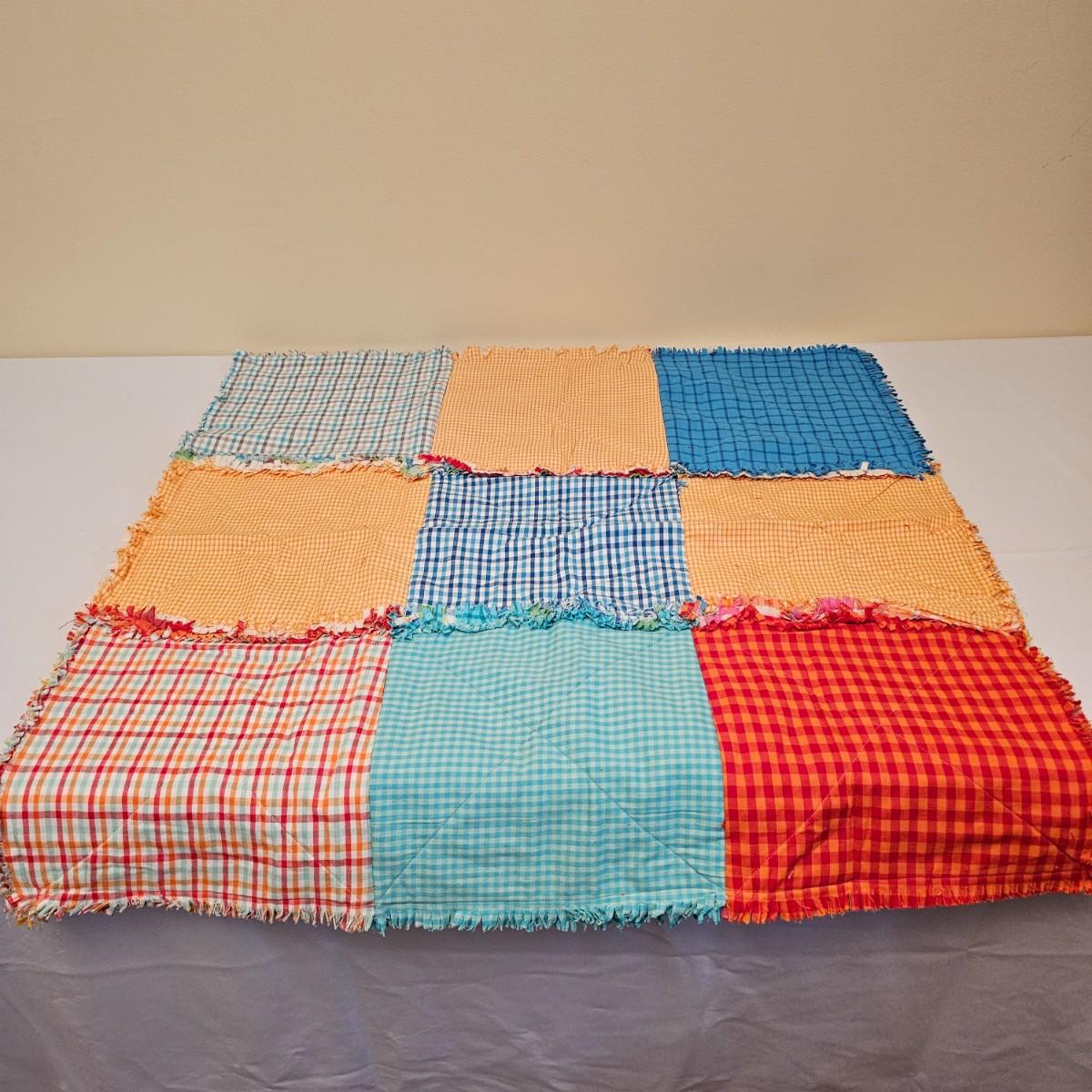 A rainbow of colors represents itself in these novel quilts and wall hangers. All sizes and shapes. Red/white squares piece is 36" x 46", has knotted ties at the corners. The four squares item is 39" x 54". Rag edge piece is 32"Sq, and the apples themed one is 41"Sq. Santa measures up at 22.5" x 27.5". Apple runner is 31.5" x 14.5", has some spotting on edges. Placemat is 22.5" x 14". Larger pink quilt, sometimes referred to as a 'cutter' to be used for pieces on other projects. Significant ragging on edges, this item measures 72" x 82". The large red floral piece is 66" x 102". Has some faded and worn spots on edges. Lastly is the quilt rack with cutout heart motif and removable hanging bar. Measures 46" x 5" x 11"H. All items used. See photos for details. Local pickup only.