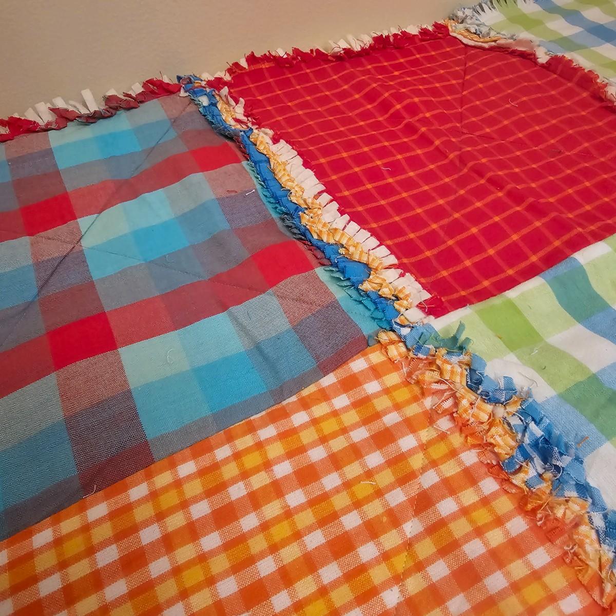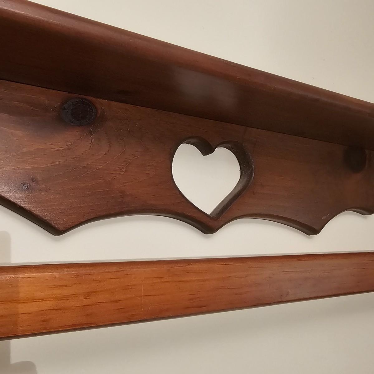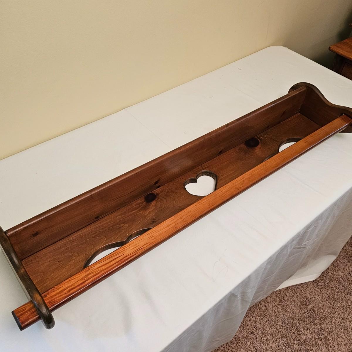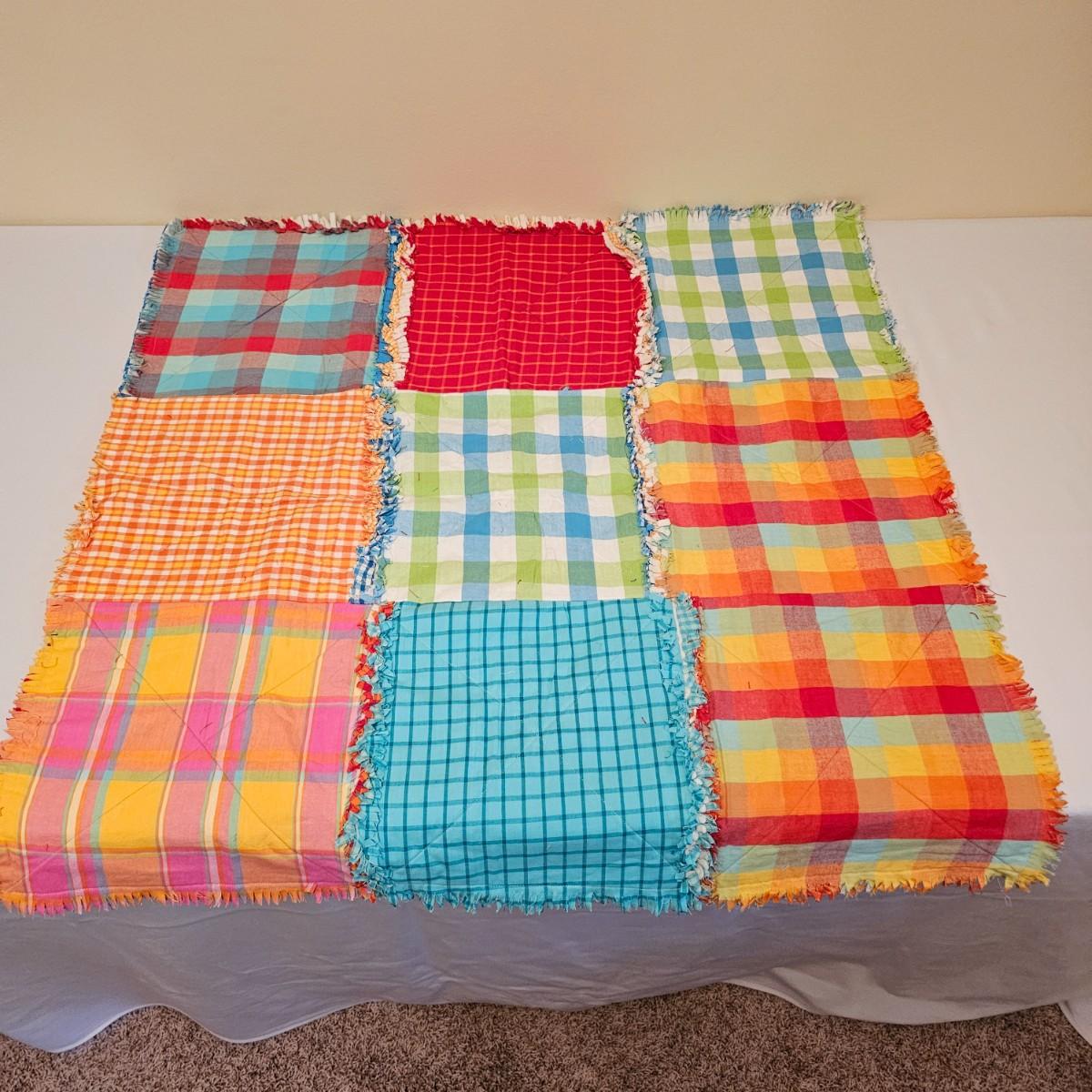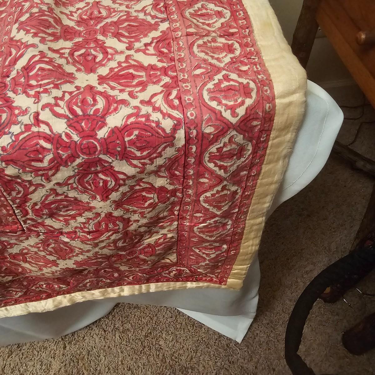 A rainbow of colors represents itself in these novel quilts and wall hangers. All sizes and shapes. Red/white squares piece is 36" x 46", has knotted ties at the corners. The four squares item is 39" x 54". Rag edge piece is 32"Sq, and the apples themed one is 41"Sq. Santa measures up at 22.5" x 27.5". Apple runner is 31.5" x 14.5", has some spotting on edges. Placemat is 22.5" x 14". Larger pink quilt, sometimes referred to as a 'cutter' to be used for pieces on other projects. Significant ragging on edges, this item measures 72" x 82". The large red floral piece is 66" x 102". Has some faded and worn spots on edges. Lastly is the quilt rack with cutout heart motif and removable hanging bar. Measures 46" x 5" x 11"H. All items used. See photos for details. Local pickup only.