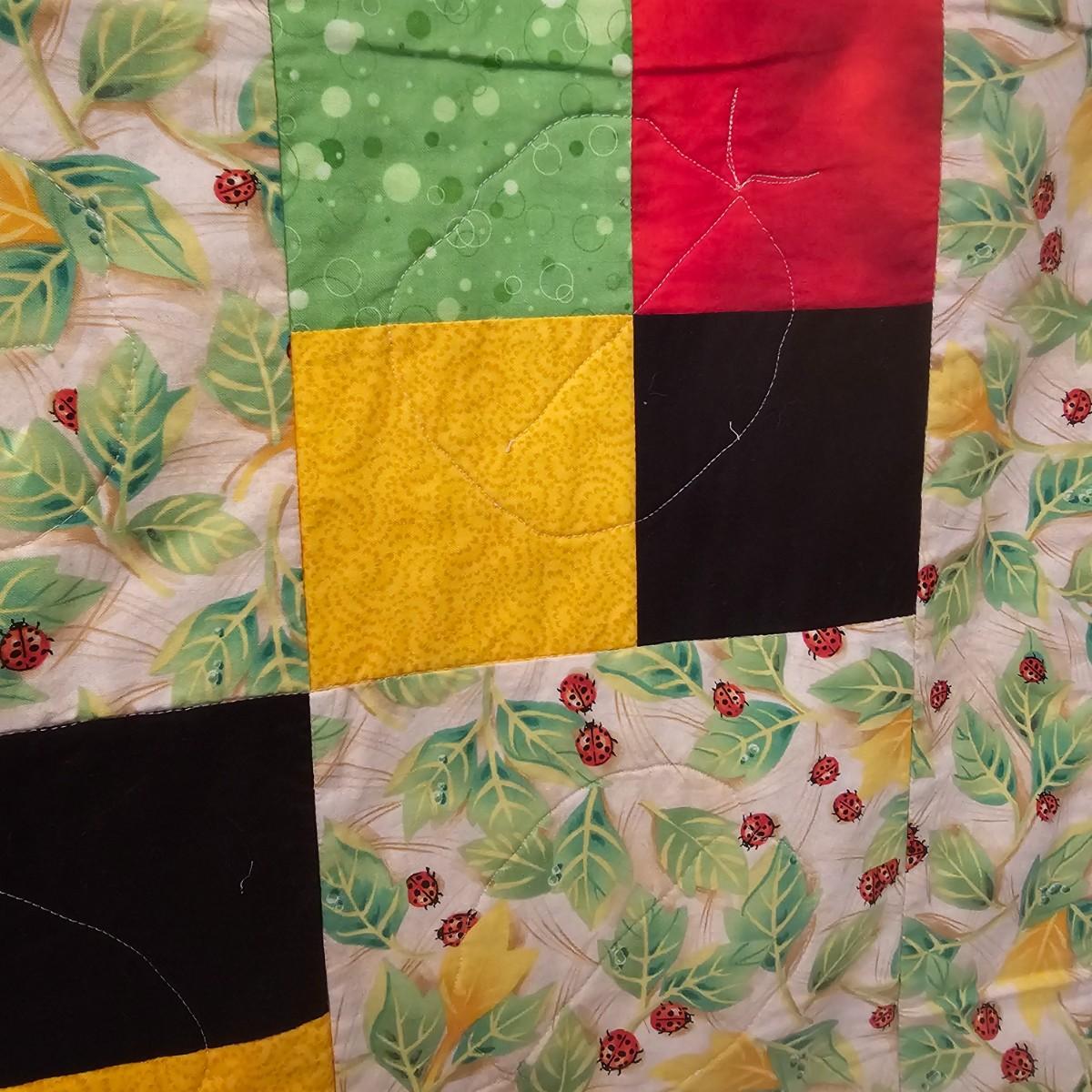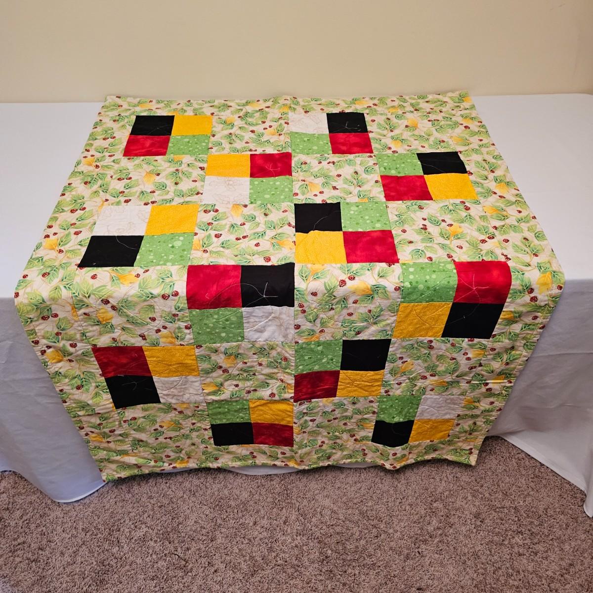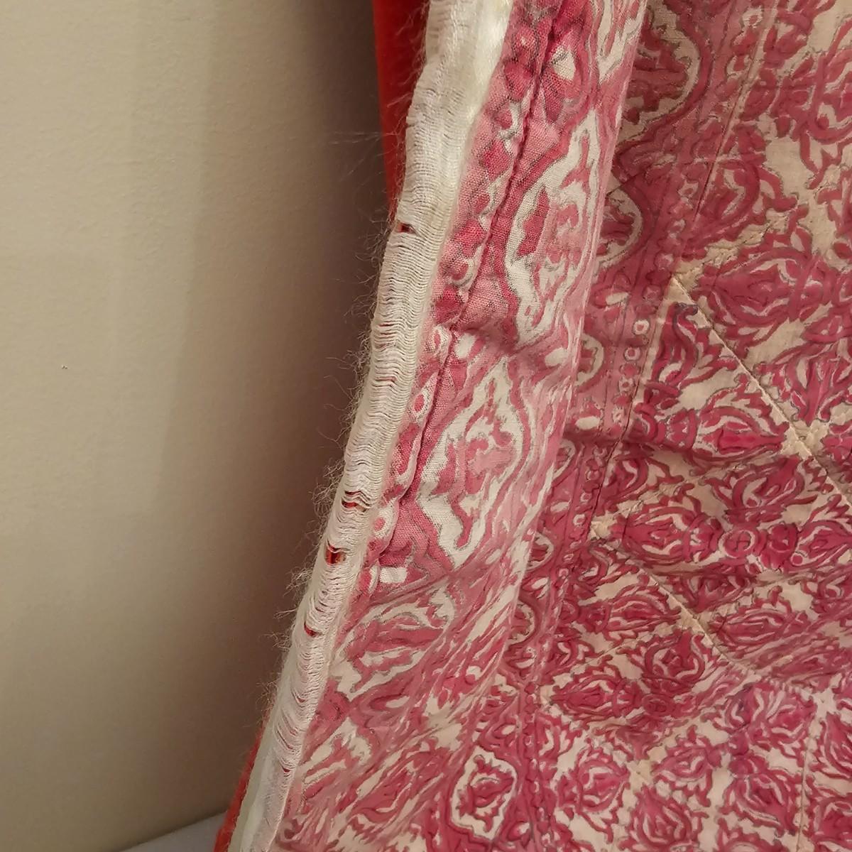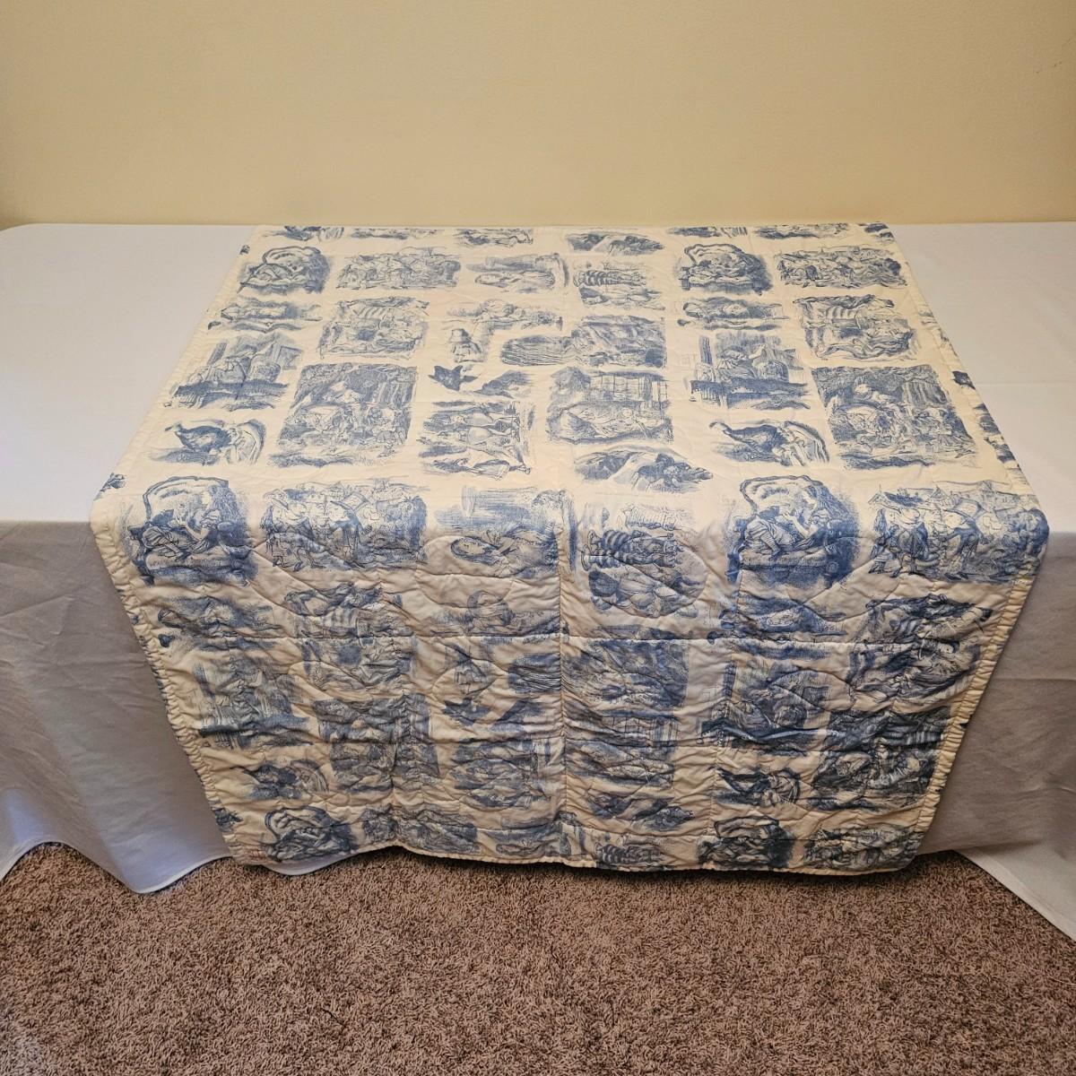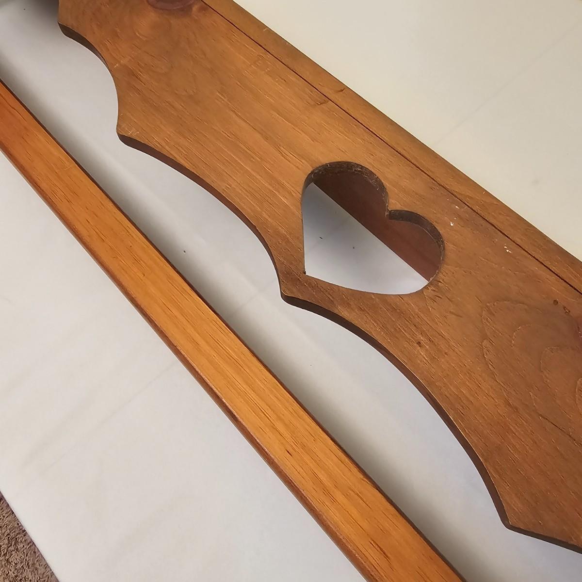 A rainbow of colors represents itself in these novel quilts and wall hangers. All sizes and shapes. Red/white squares piece is 36" x 46", has knotted ties at the corners. The four squares item is 39" x 54". Rag edge piece is 32"Sq, and the apples themed one is 41"Sq. Santa measures up at 22.5" x 27.5". Apple runner is 31.5" x 14.5", has some spotting on edges. Placemat is 22.5" x 14". Larger pink quilt, sometimes referred to as a 'cutter' to be used for pieces on other projects. Significant ragging on edges, this item measures 72" x 82". The large red floral piece is 66" x 102". Has some faded and worn spots on edges. Lastly is the quilt rack with cutout heart motif and removable hanging bar. Measures 46" x 5" x 11"H. All items used. See photos for details. Local pickup only.
