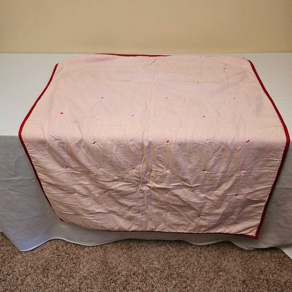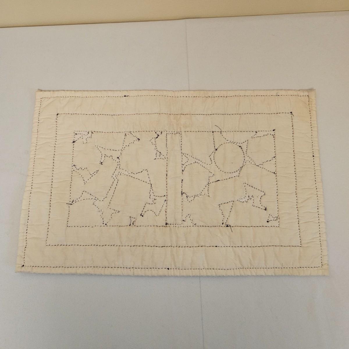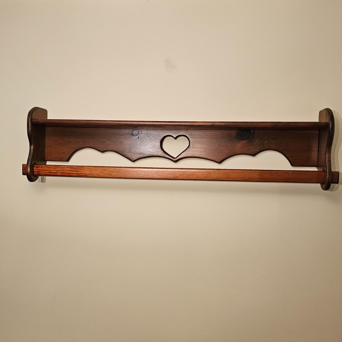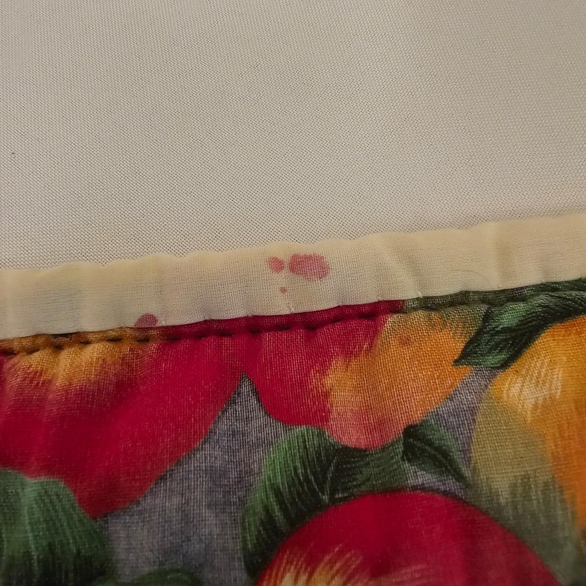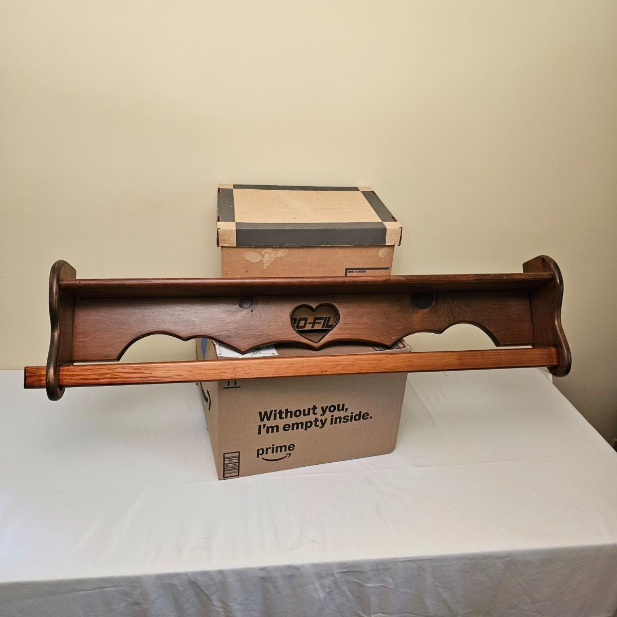 A rainbow of colors represents itself in these novel quilts and wall hangers. All sizes and shapes. Red/white squares piece is 36" x 46", has knotted ties at the corners. The four squares item is 39" x 54". Rag edge piece is 32"Sq, and the apples themed one is 41"Sq. Santa measures up at 22.5" x 27.5". Apple runner is 31.5" x 14.5", has some spotting on edges. Placemat is 22.5" x 14". Larger pink quilt, sometimes referred to as a 'cutter' to be used for pieces on other projects. Significant ragging on edges, this item measures 72" x 82". The large red floral piece is 66" x 102". Has some faded and worn spots on edges. Lastly is the quilt rack with cutout heart motif and removable hanging bar. Measures 46" x 5" x 11"H. All items used. See photos for details. Local pickup only.