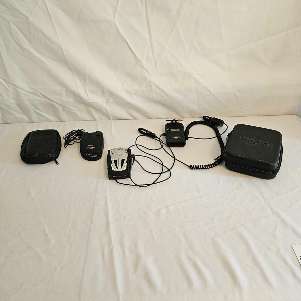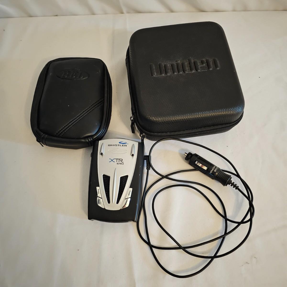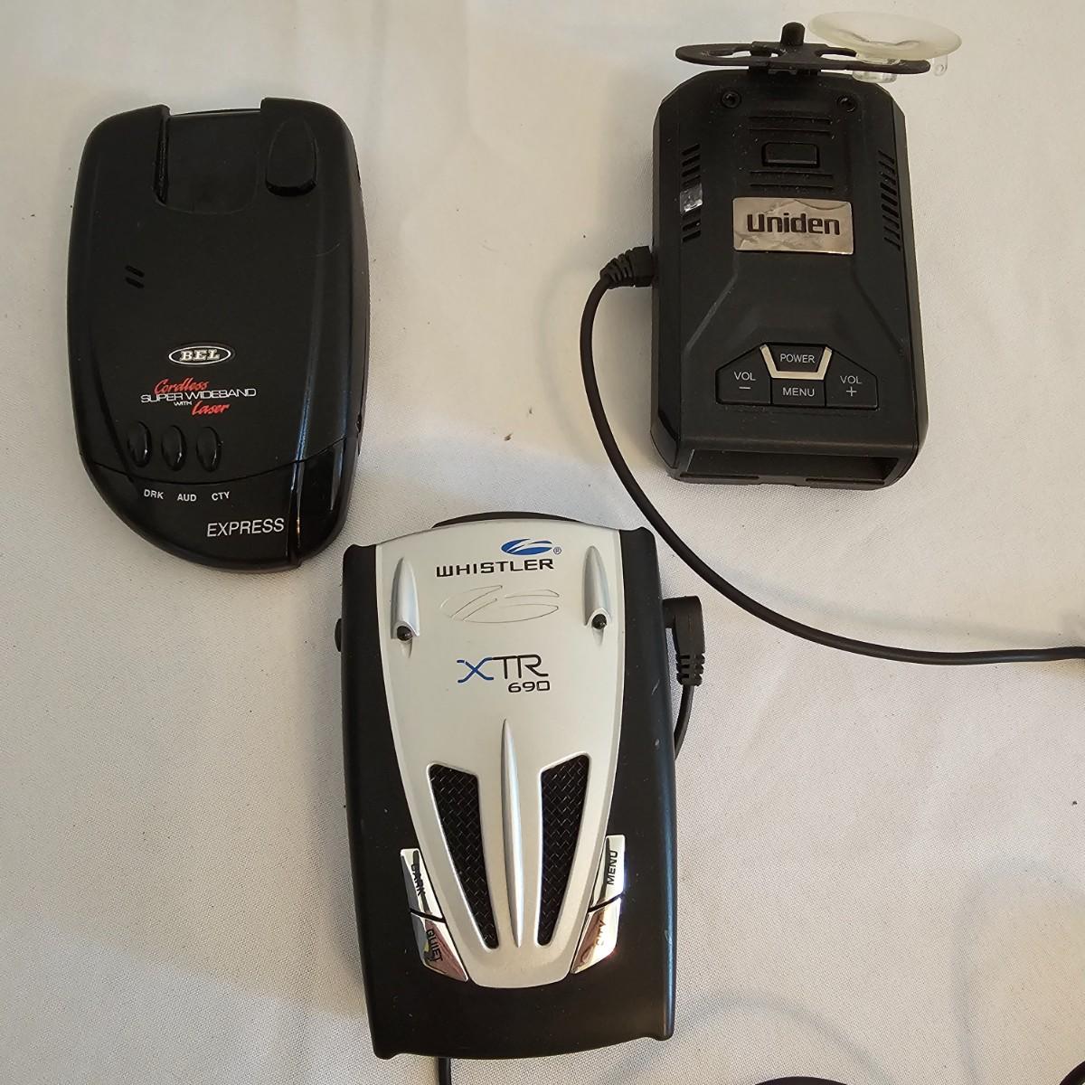 Three different brands of radar detectors. Inluded here are a Whistler XTR 690 w/power cord, a Uniden R3 with case and power cord, and a Beltronics Super Widebrand Express with case and some kind of cord. Items are all untested. See photos for details. Shipping available.