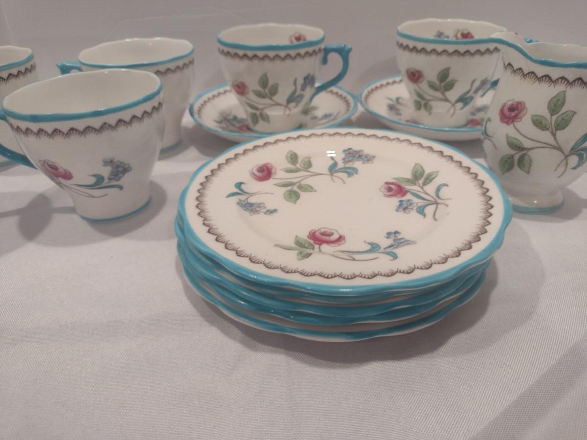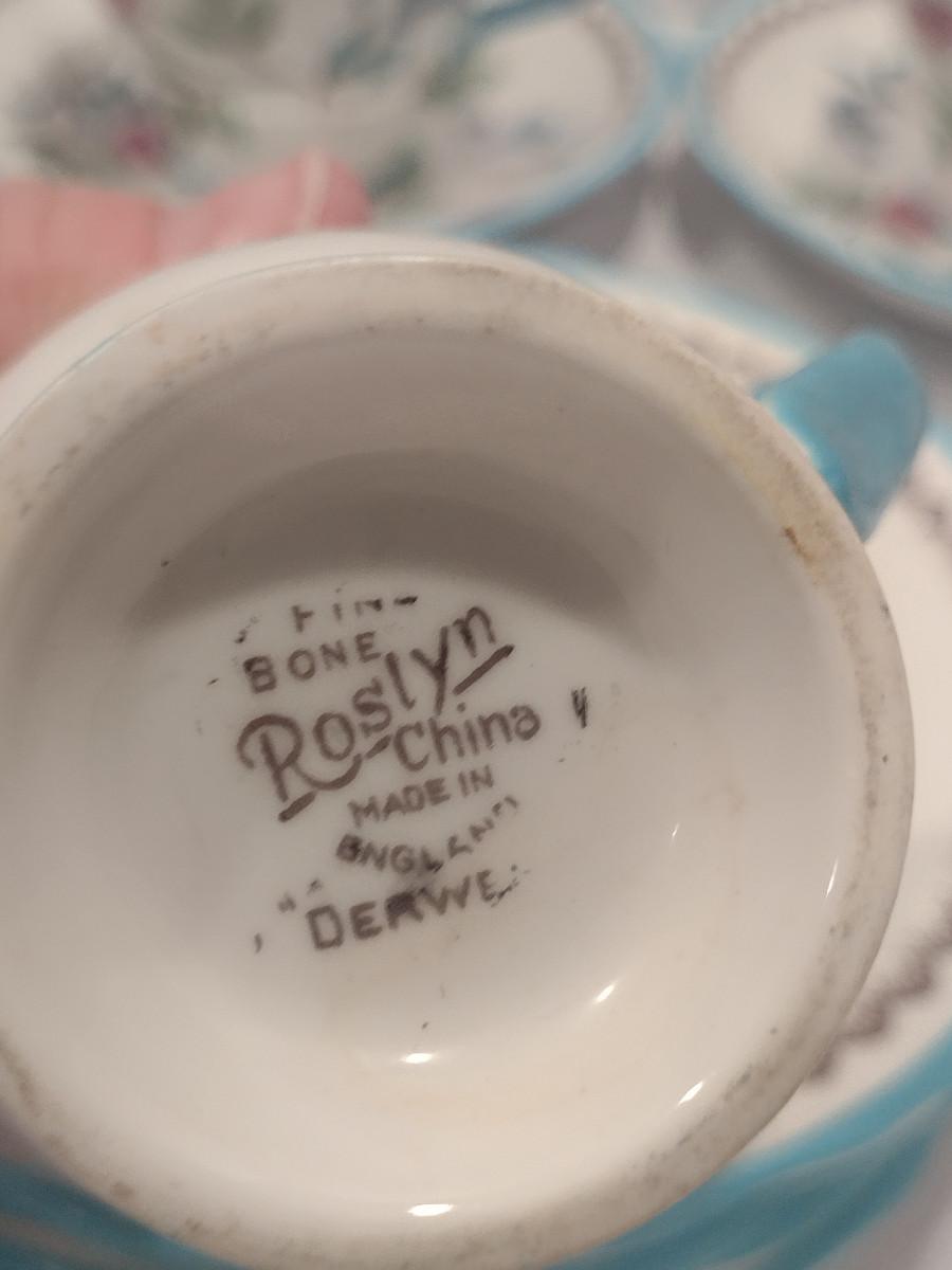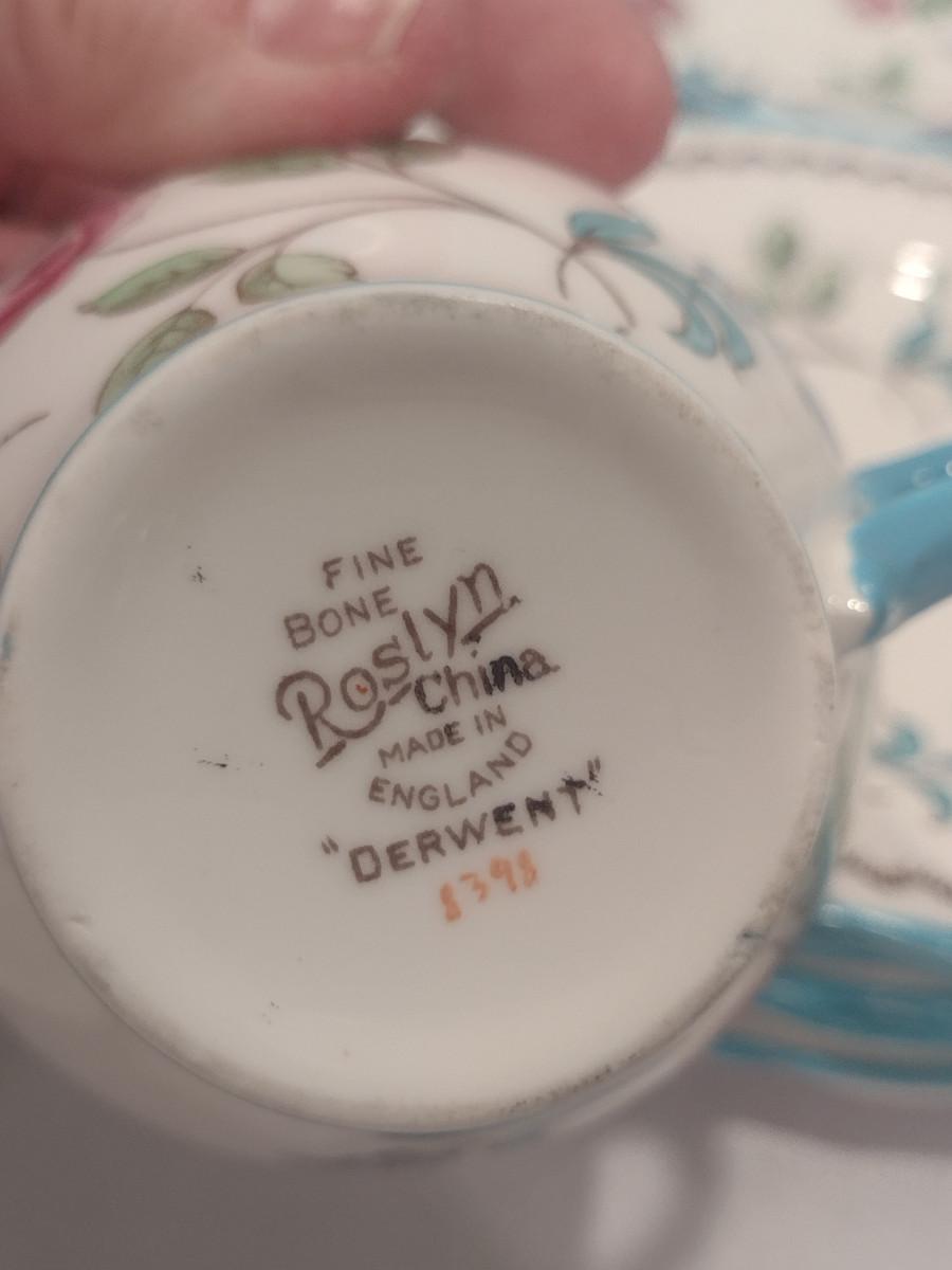 Assorted Roslyn China 'Derwent' Pattern- Approx 14 Pieces. 5 snack/bread plates, 6 cups, 2 saucers, and creamer.