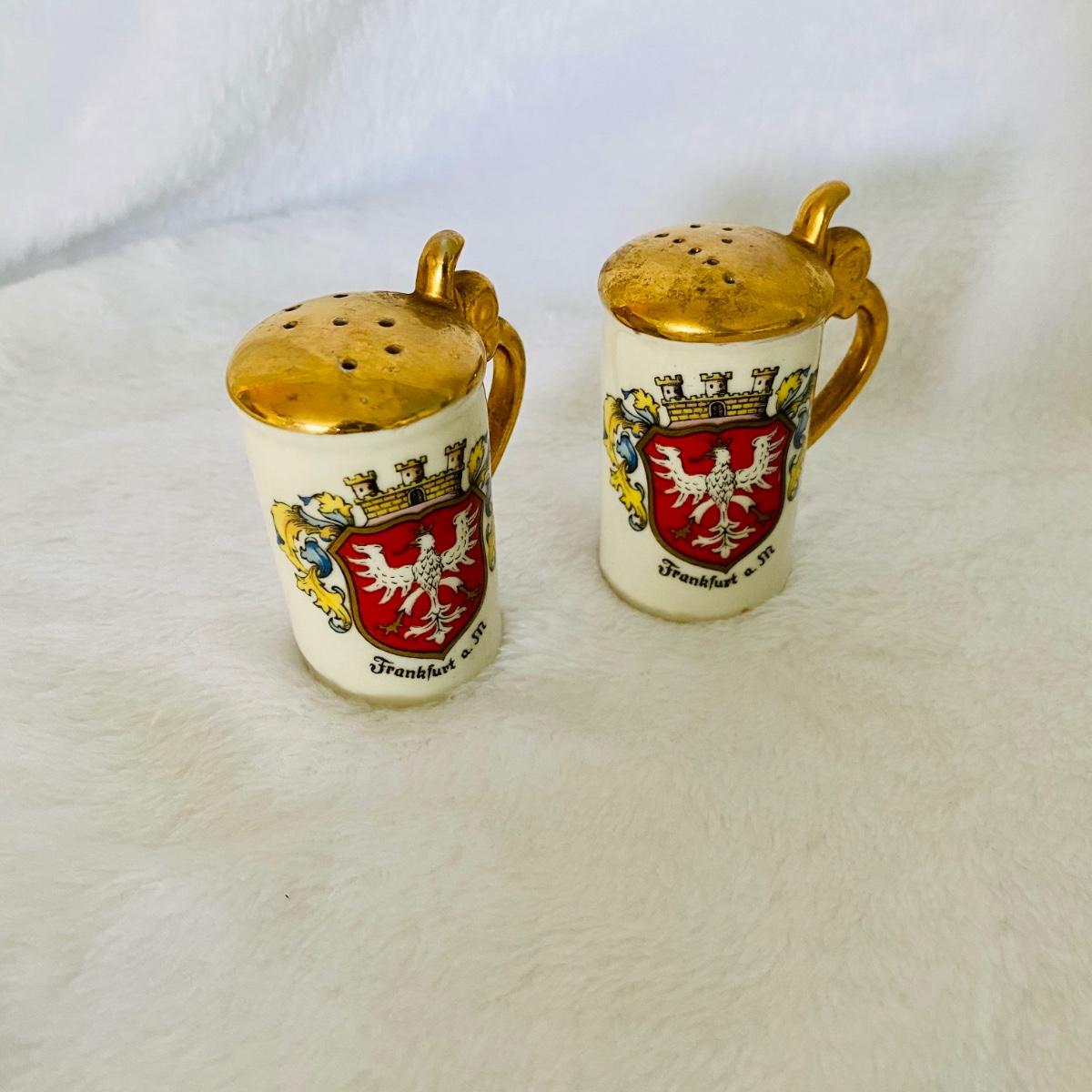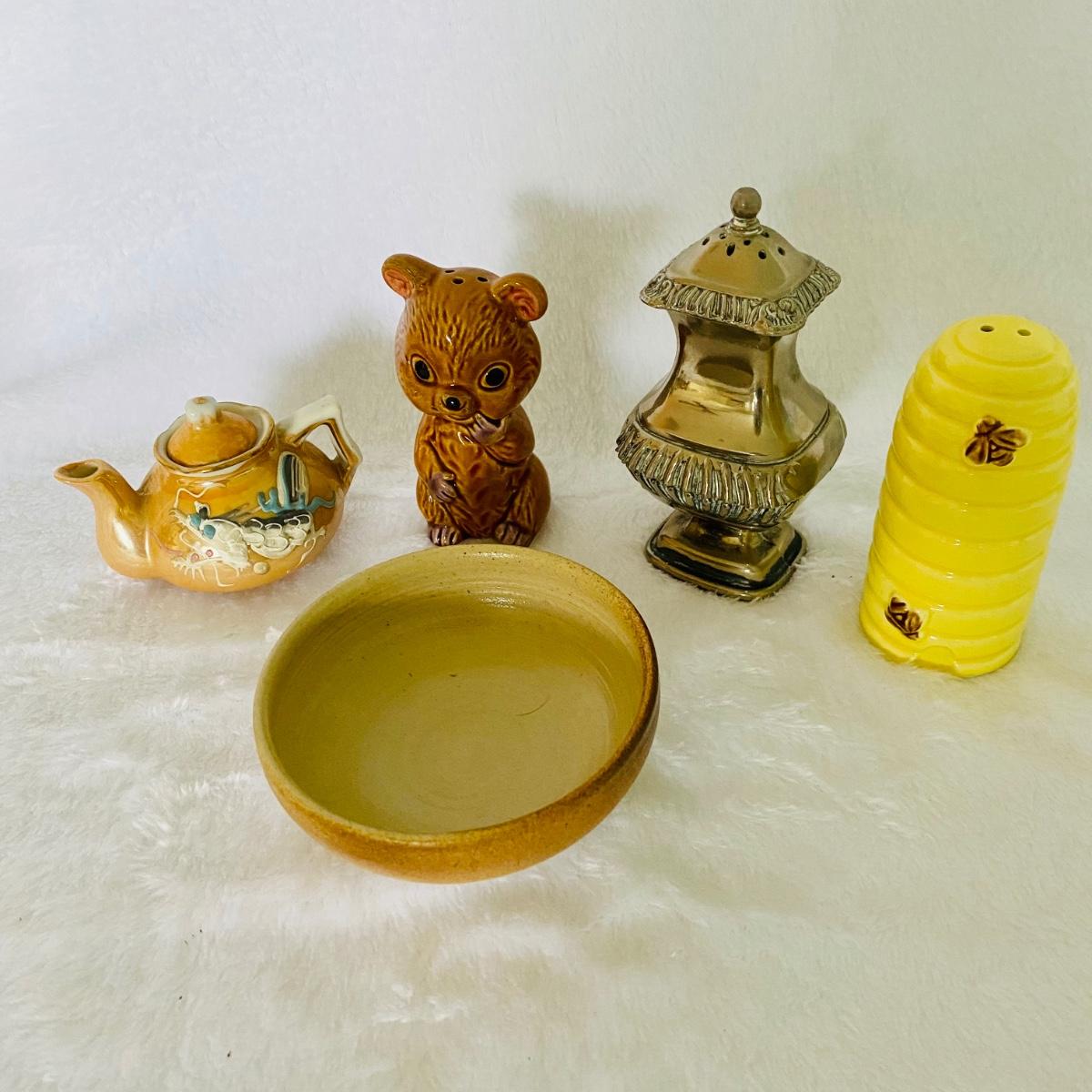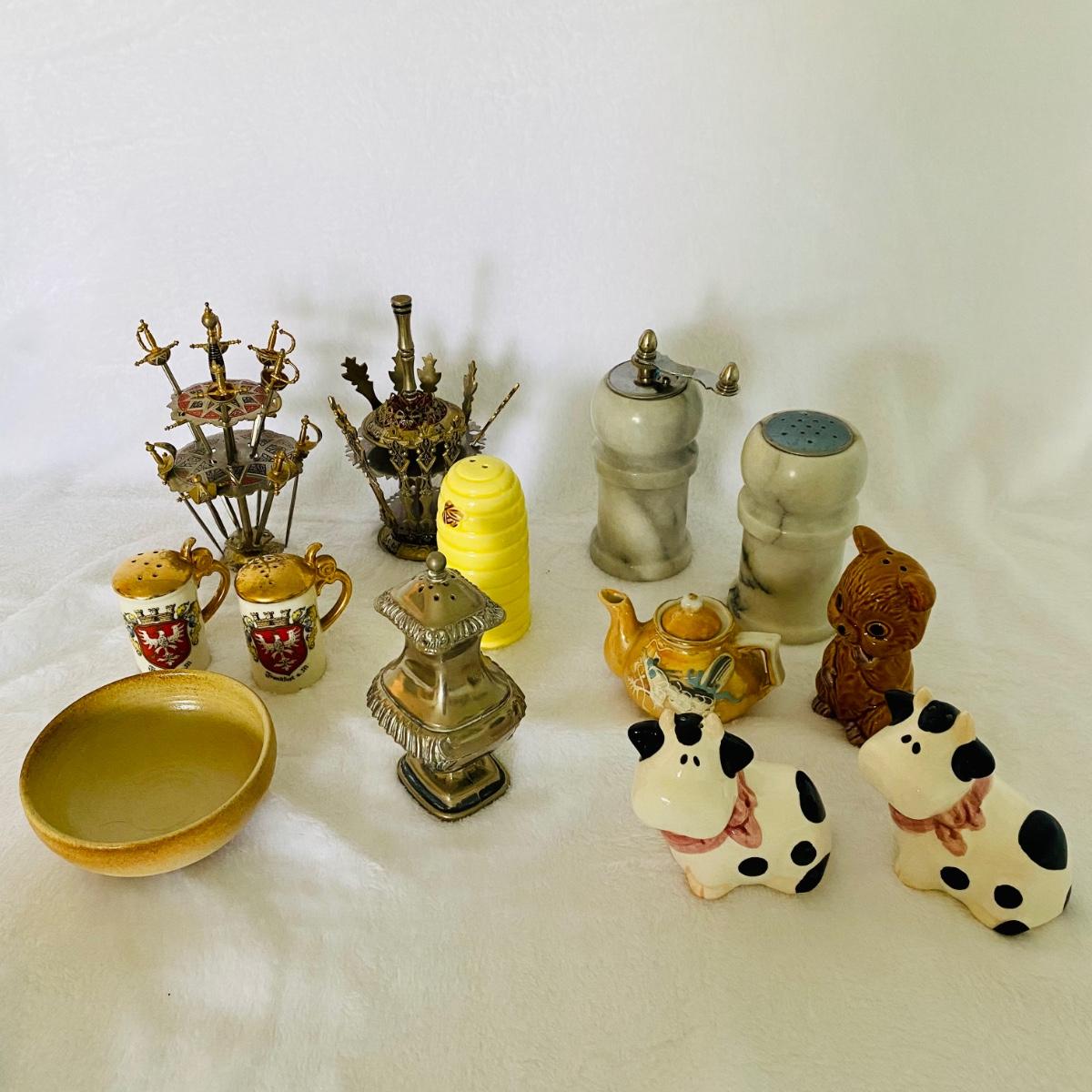 Collection of salt and pepper shakers. One pair has cocktail forks. Good condition.