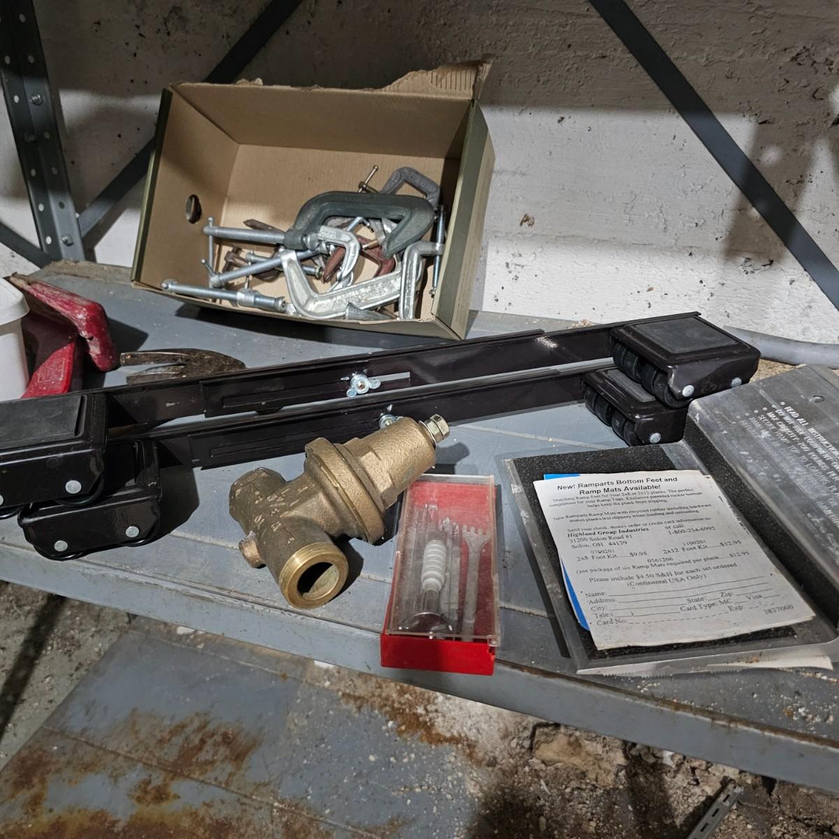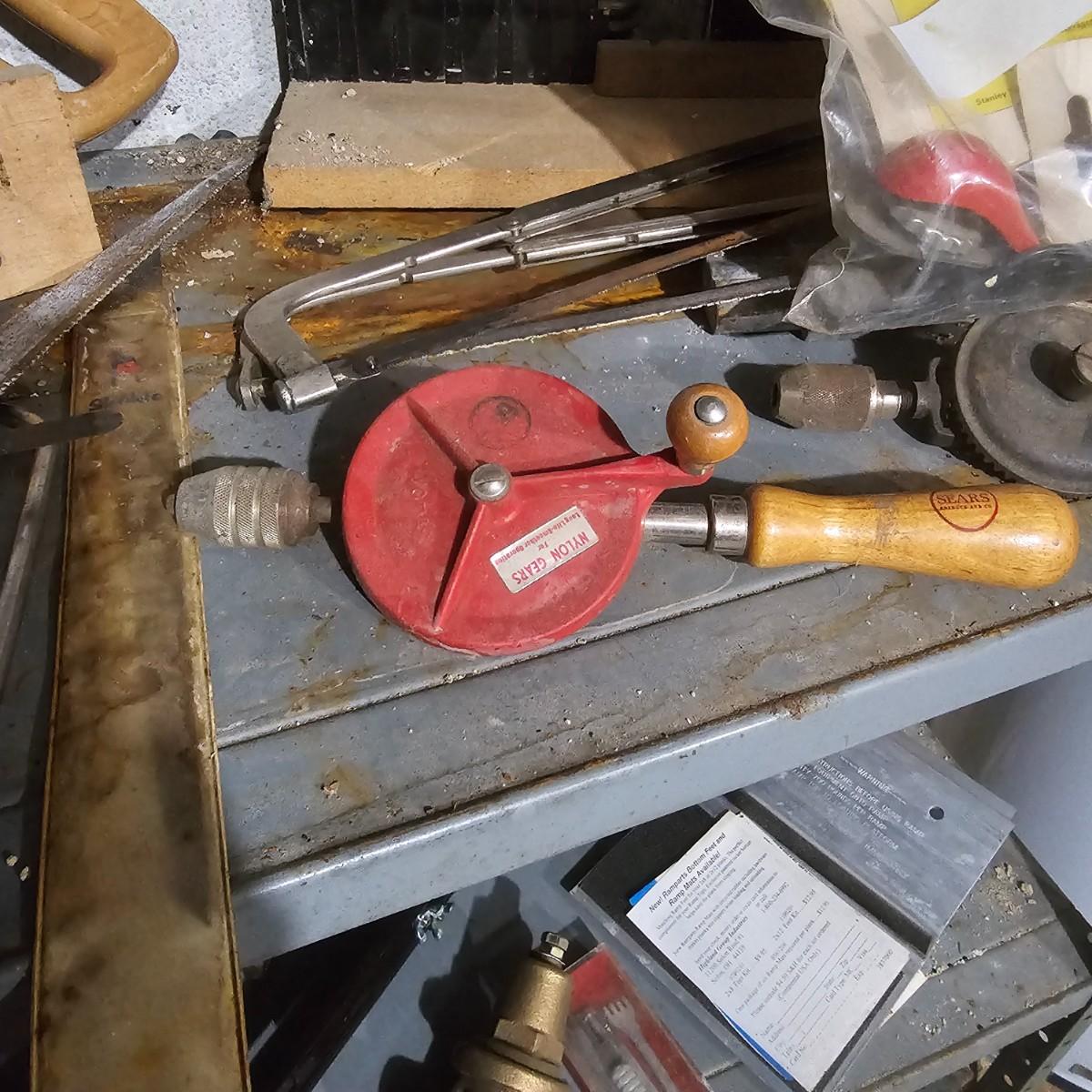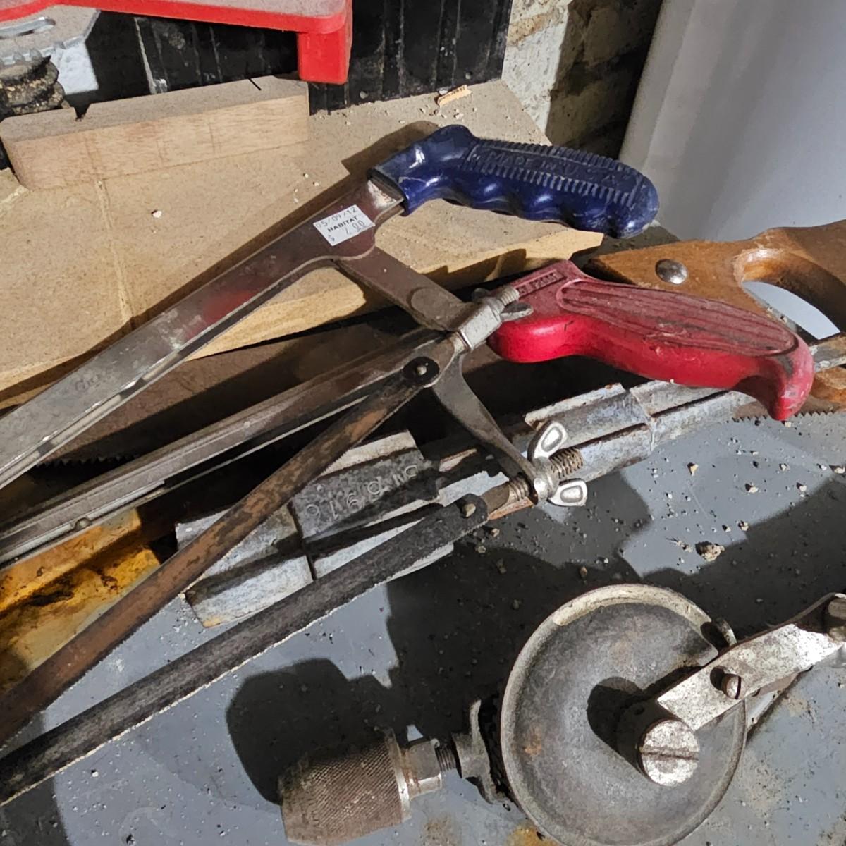 Collection of short hand saws for toolbox, miter box. Hacksaw, deep throat coping saw, pliers, hammer, two miter boxes. Red unit is 16"W x 7"D x 10" H. One set appliance roller wheels, one set ramp hardware. Two rotary hand drills. Miscellaneous other small tools. See photos for details. Local pickup only.