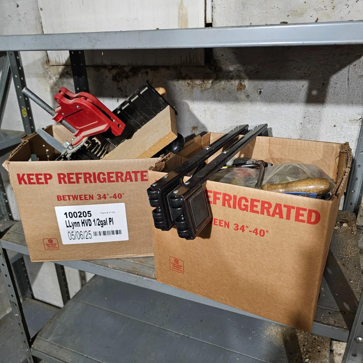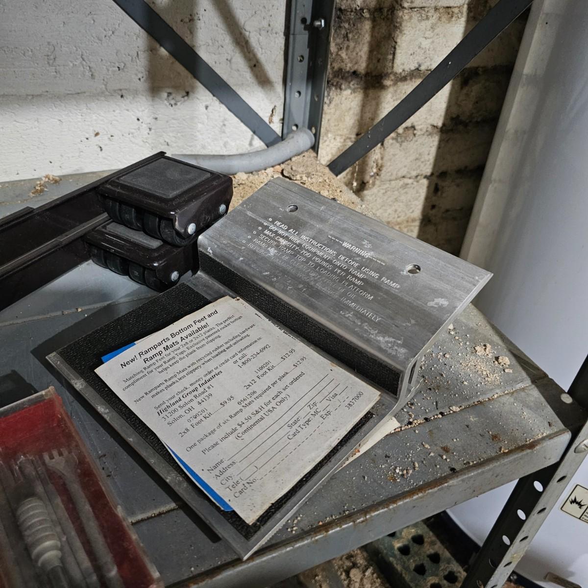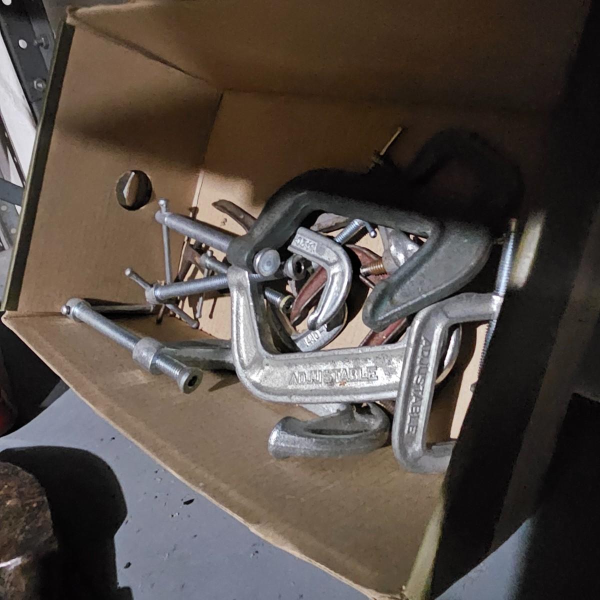 Collection of short hand saws for toolbox, miter box. Hacksaw, deep throat coping saw, pliers, hammer, two miter boxes. Red unit is 16"W x 7"D x 10" H. One set appliance roller wheels, one set ramp hardware. Two rotary hand drills. Miscellaneous other small tools. See photos for details. Local pickup only.