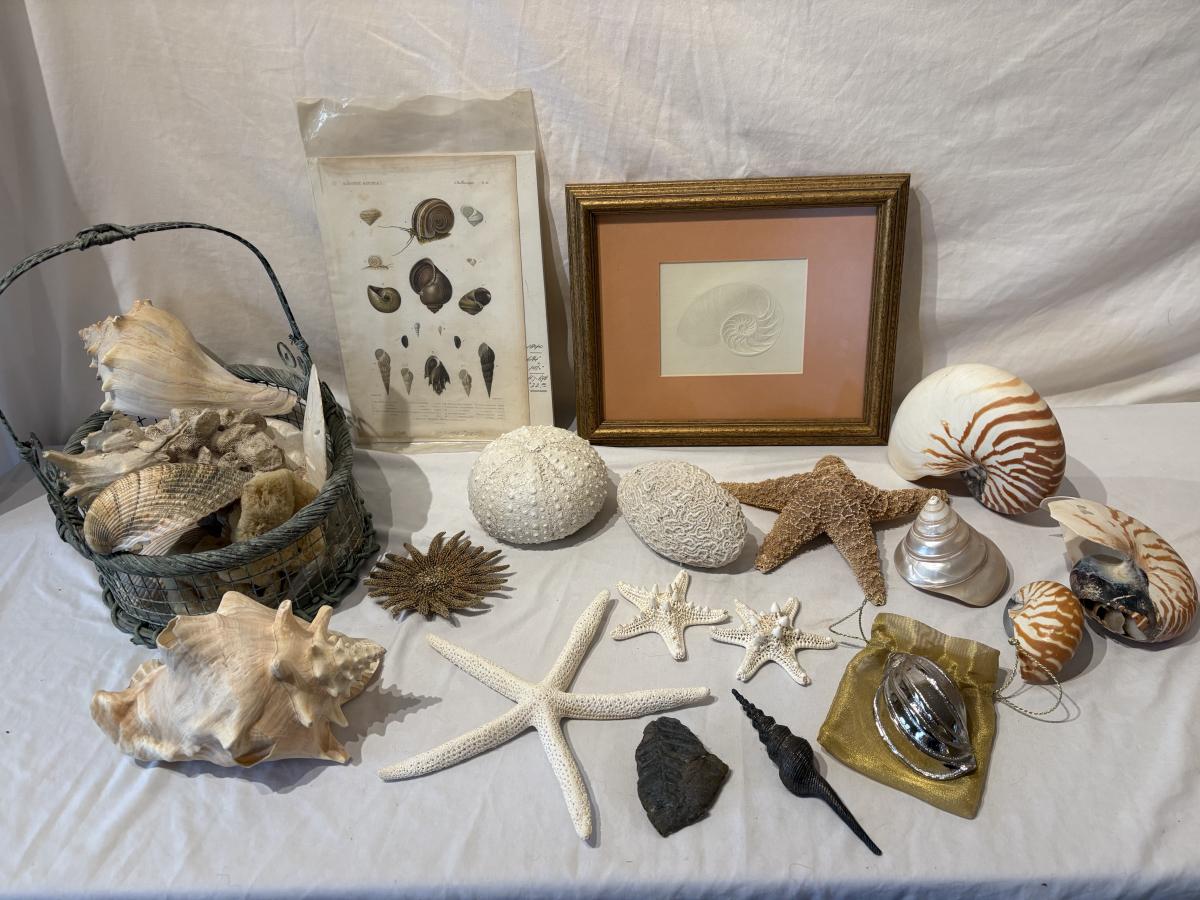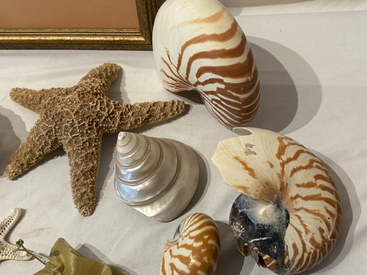 Wonderful collection of actual sea shells and starfish, plaster models, reproduction of historic shell illustration and more. Nautilus paper art piece is set in a gilt gold wooden frame with non-glare glass, 11.5” x 10”. Local pickup due to fragile nature of some of these objects.