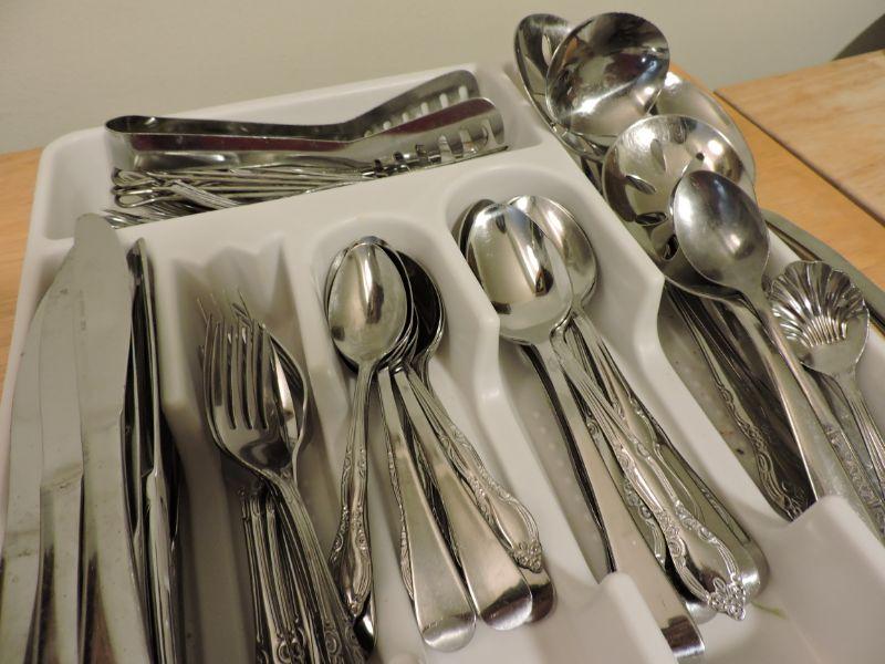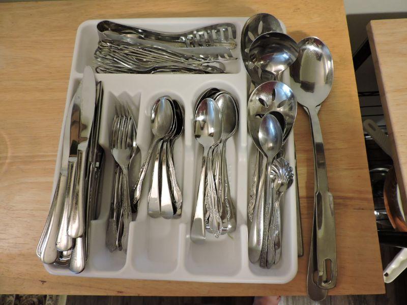 Assorted knives, forks, spoons, and serving utensils. **Please read Terms and Conditions before placing a bid. Pick up is Thursday, August 15, 2019 from 4pm to 7pm or Sunday, August 18 from 11am-2pm in Mullica Hill. All sales are final. All sales are as is, where is. Please review all photos. Any props included in photos are not included in listing. All measurements are approximate.