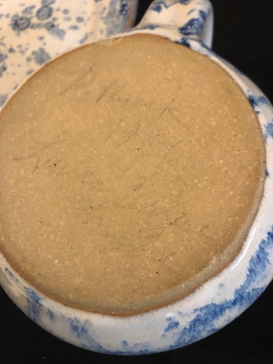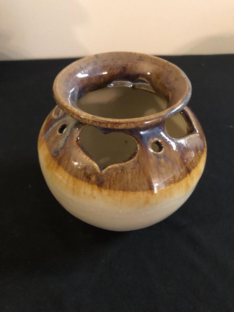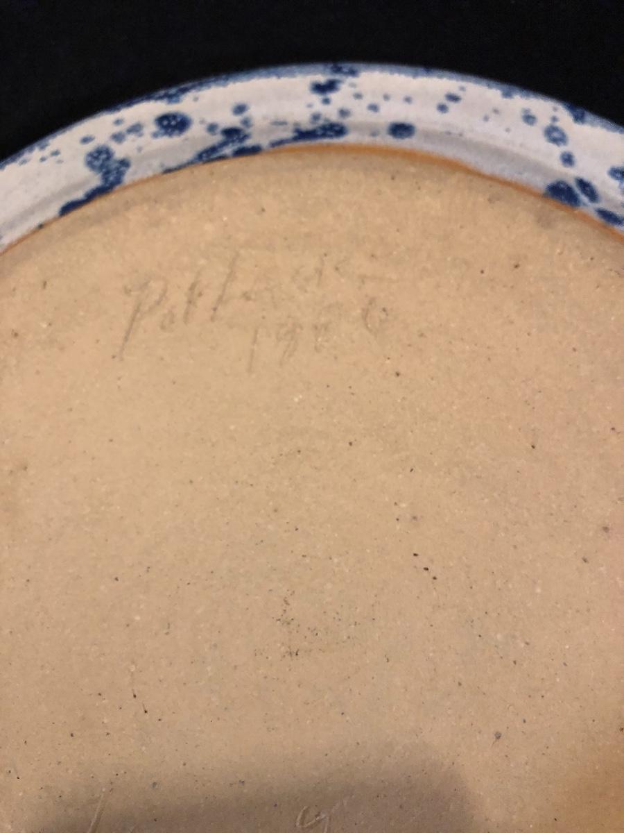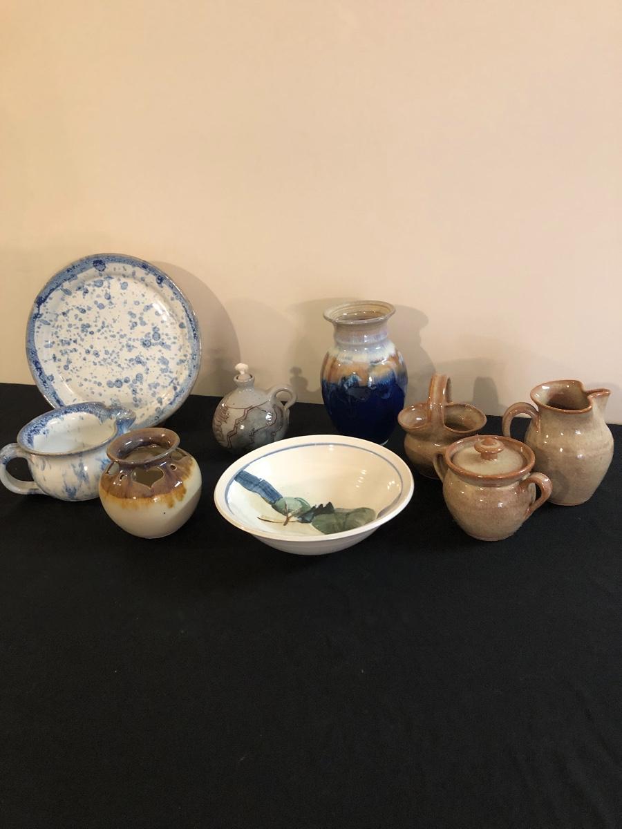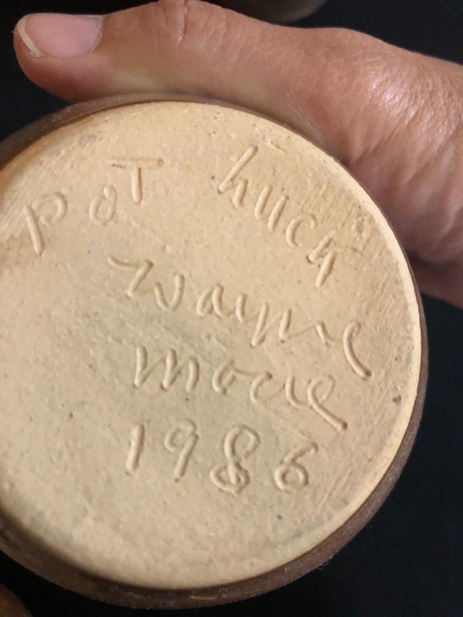 The blue speckled plate is 10.5” in diameter and signed by Laura Moore and it is called Potluck - 1986. The brown creamer, sugar bowl and basket is from the same collection. The hand painted bowl signed by Nancy is 8.5” in diameter. The vase has a “W” on its’ bottom and is 7.5” tall. Wagner is the signature on the bottom of the oil lamp. The heart vase/votive is from Morgan Pottery, NC.