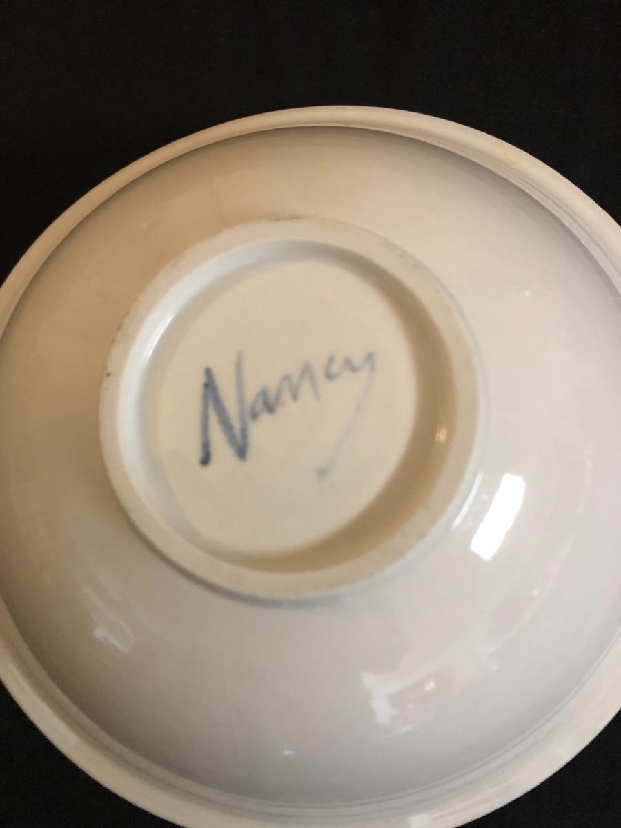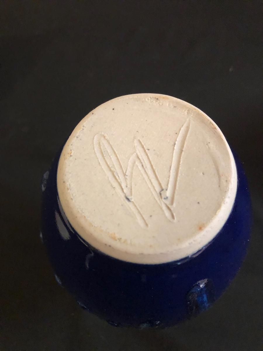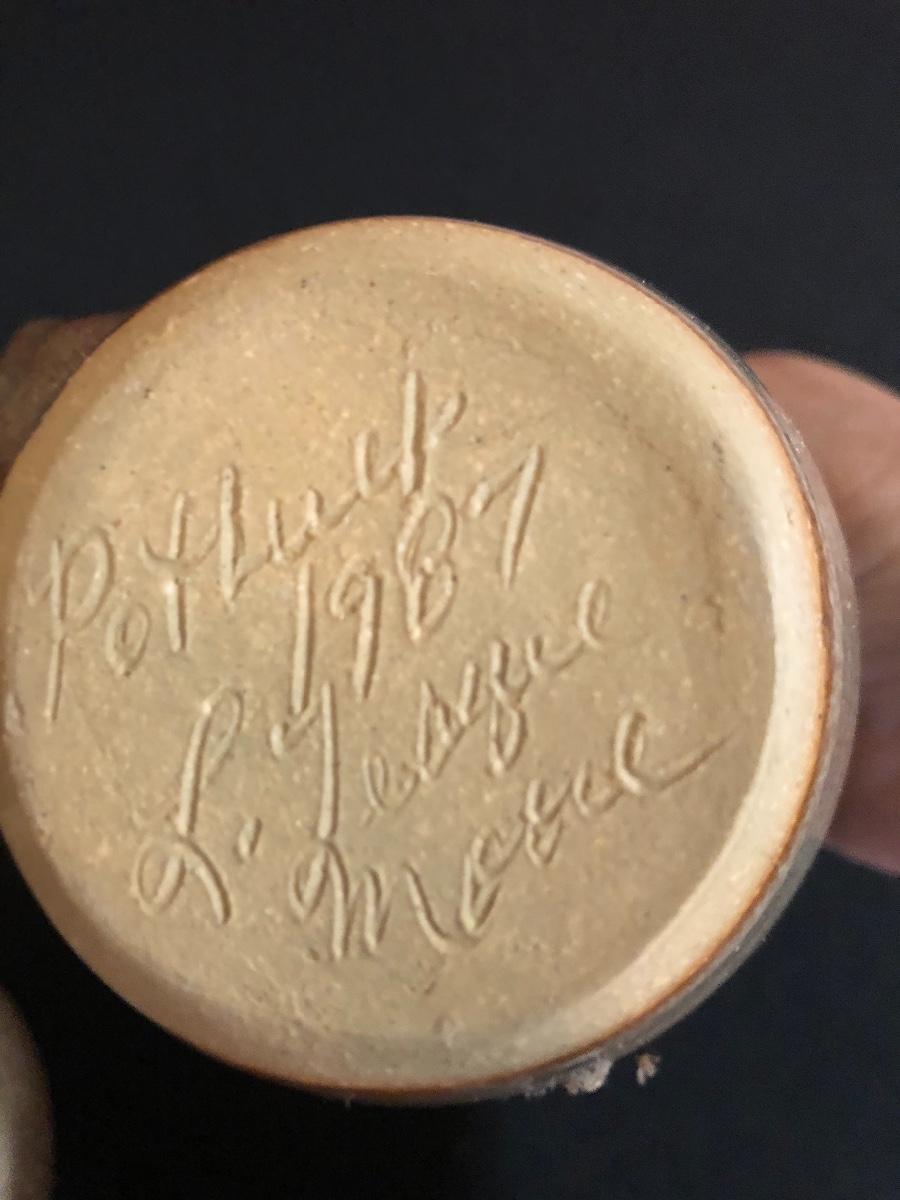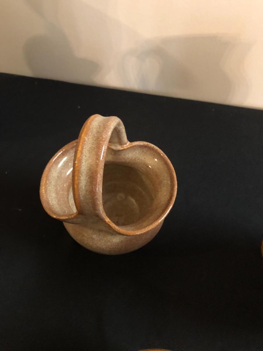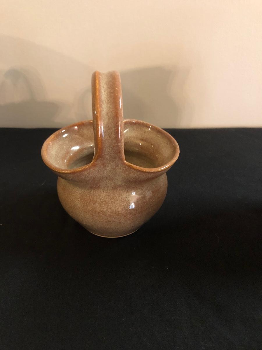The blue speckled plate is 10.5” in diameter and signed by Laura Moore and it is called Potluck - 1986. The brown creamer, sugar bowl and basket is from the same collection. The hand painted bowl signed by Nancy is 8.5” in diameter. The vase has a “W” on its’ bottom and is 7.5” tall. Wagner is the signature on the bottom of the oil lamp. The heart vase/votive is from Morgan Pottery, NC.