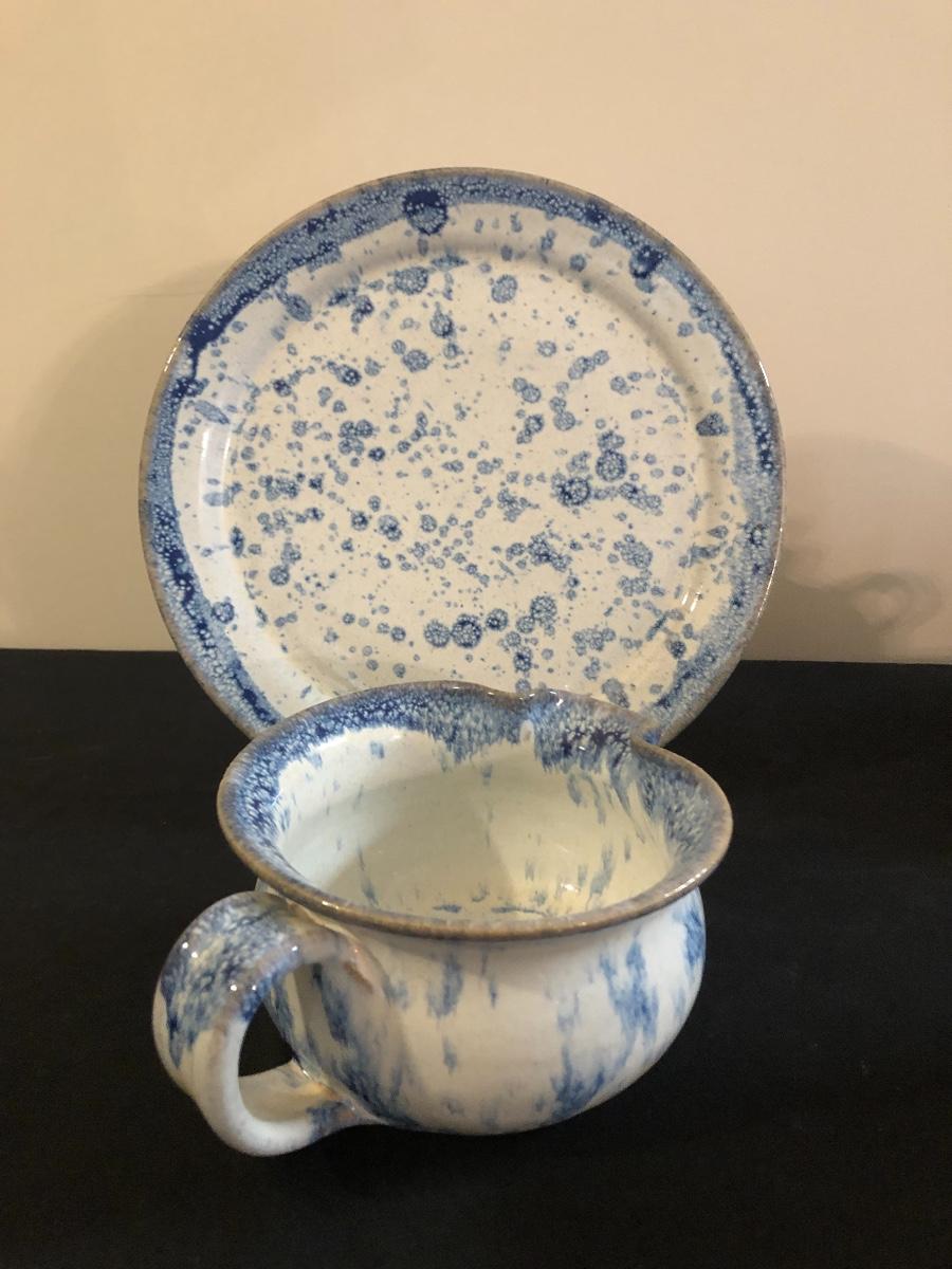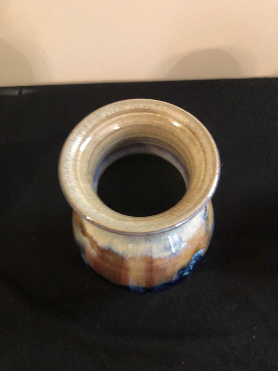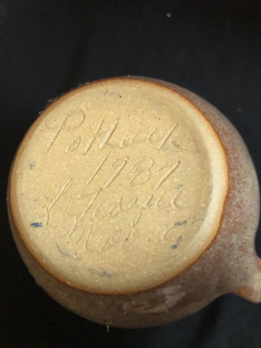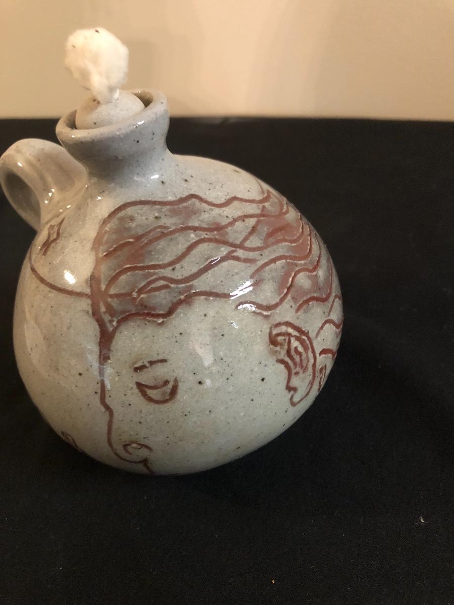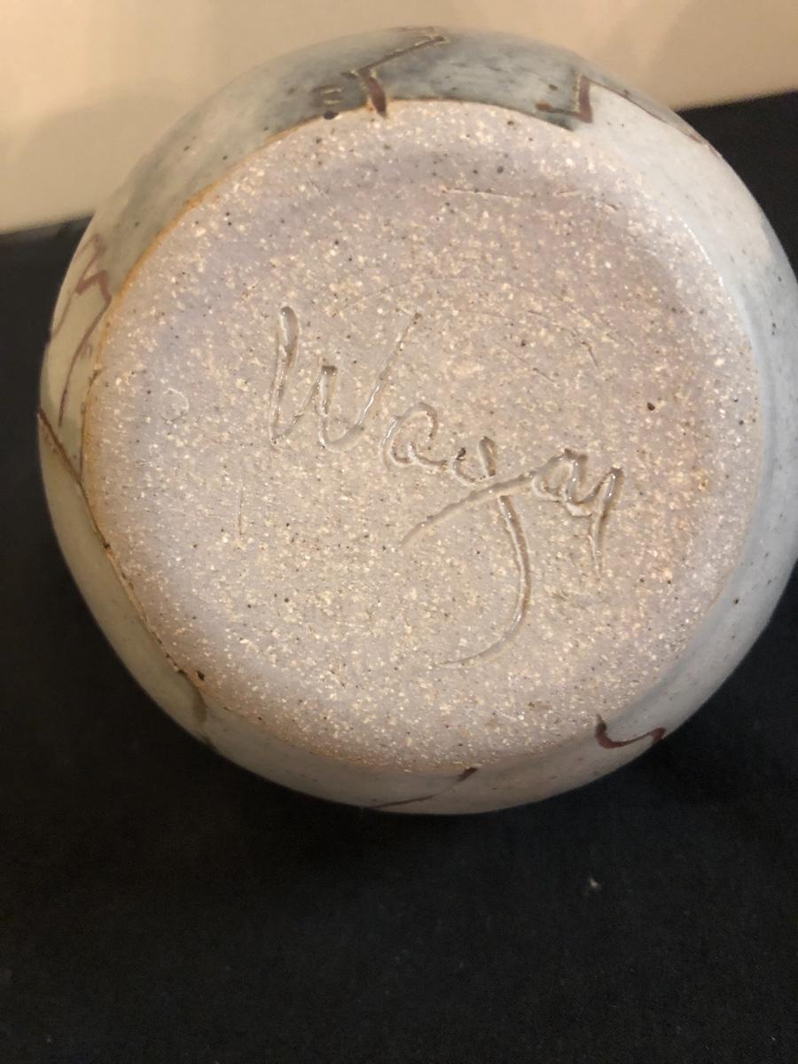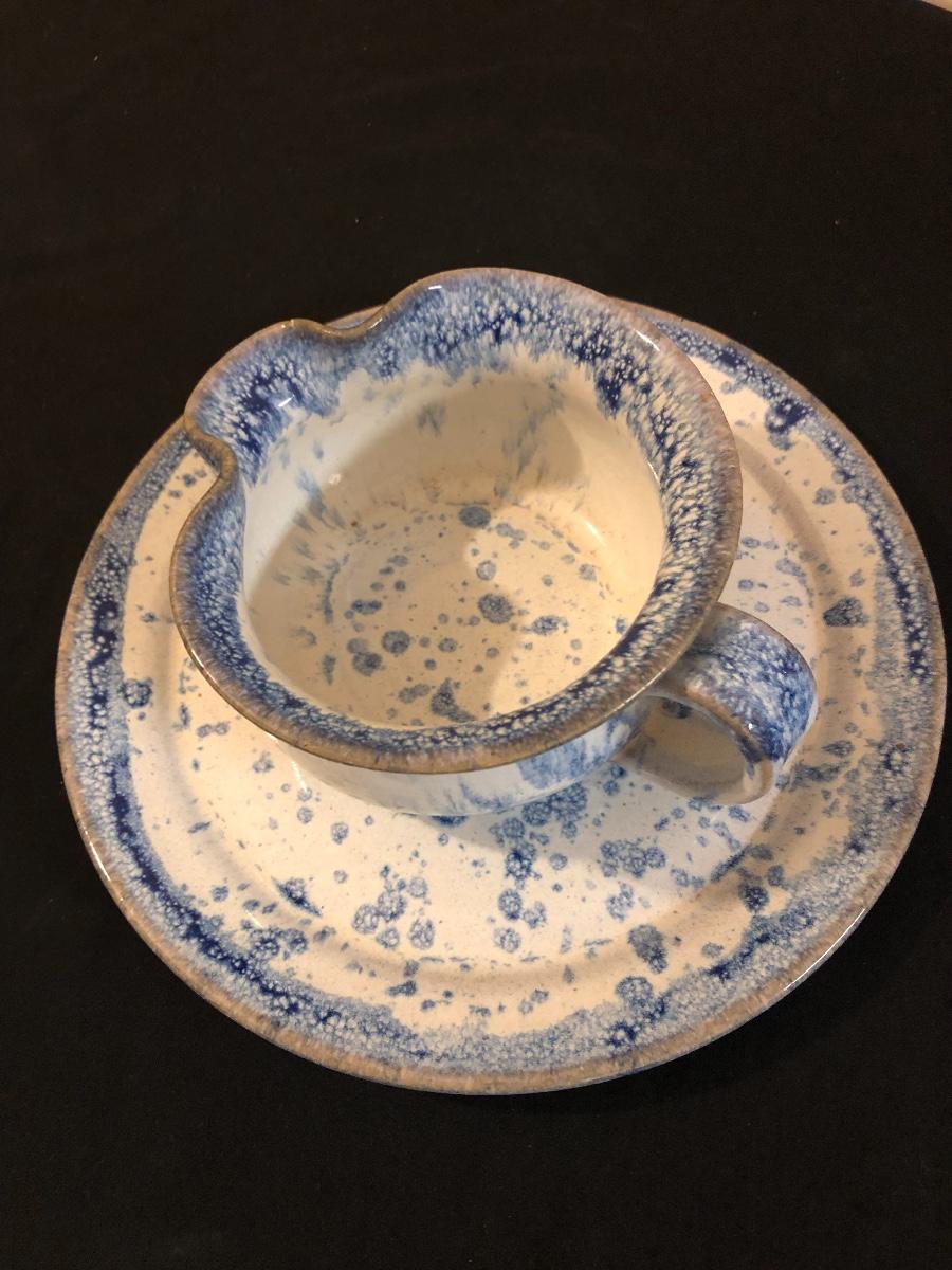 The blue speckled plate is 10.5” in diameter and signed by Laura Moore and it is called Potluck - 1986. The brown creamer, sugar bowl and basket is from the same collection. The hand painted bowl signed by Nancy is 8.5” in diameter. The vase has a “W” on its’ bottom and is 7.5” tall. Wagner is the signature on the bottom of the oil lamp. The heart vase/votive is from Morgan Pottery, NC.